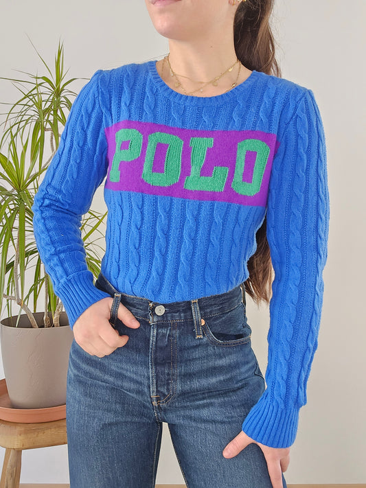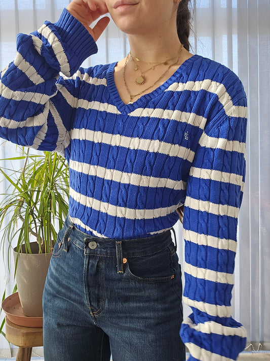 Pull col V en maille torsadée bleu/blanc RLR - L/XL