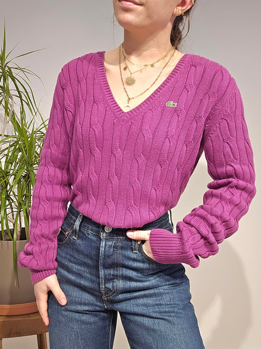 Pull col V en maille torsadée rose fushia - XL/42