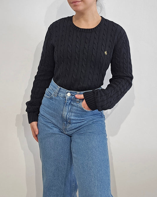 Pull col rond en maille torsadée noir - M