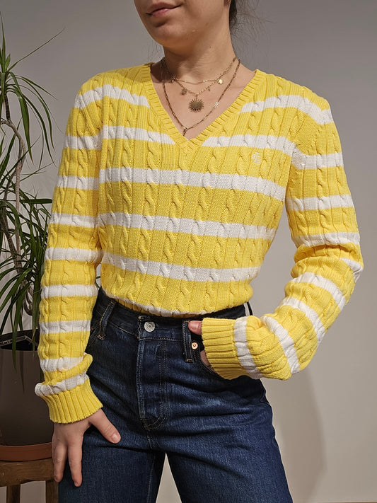 Pull col rond en maille torsadée jaune/blanc collection RLR - S/M