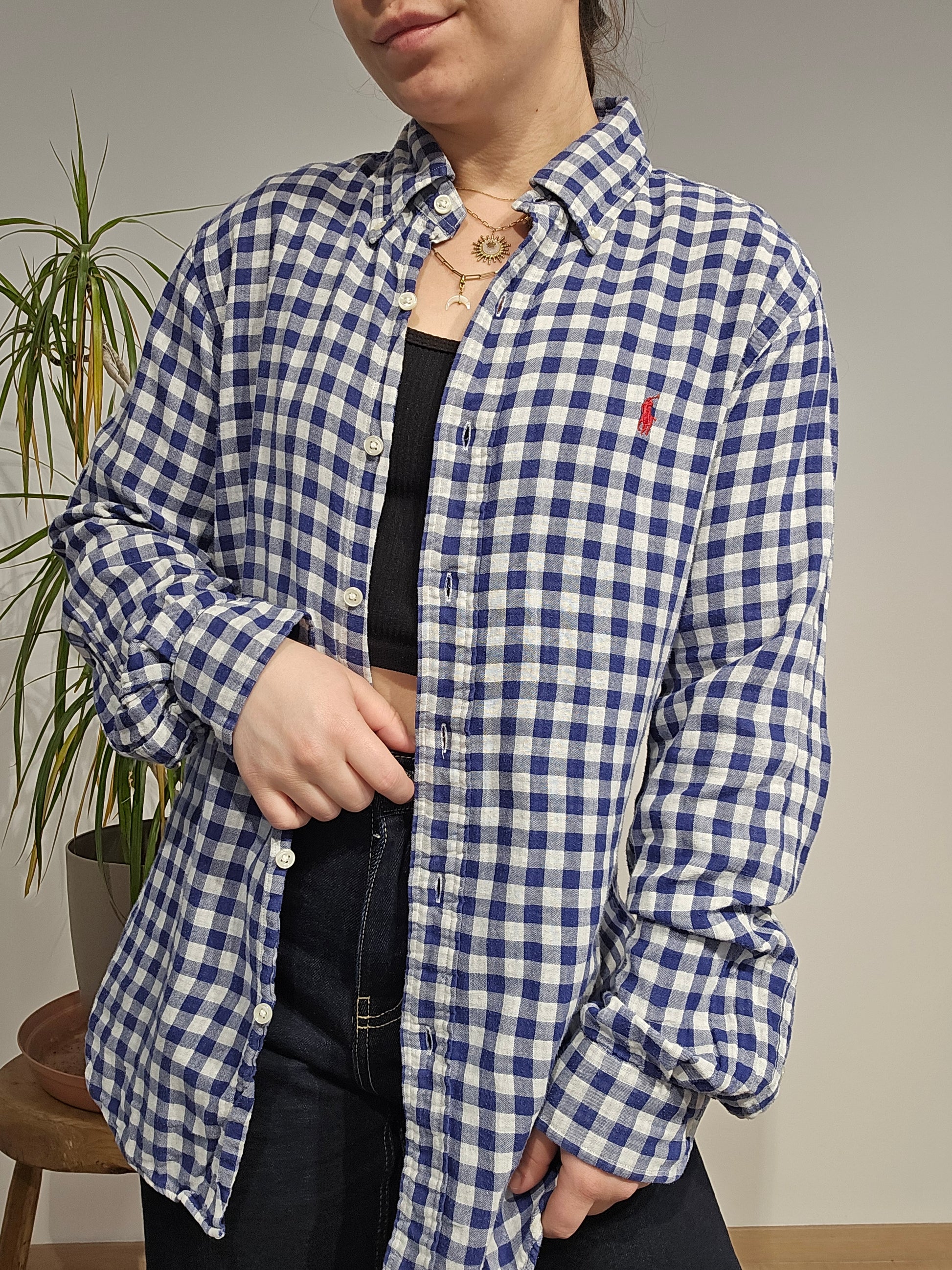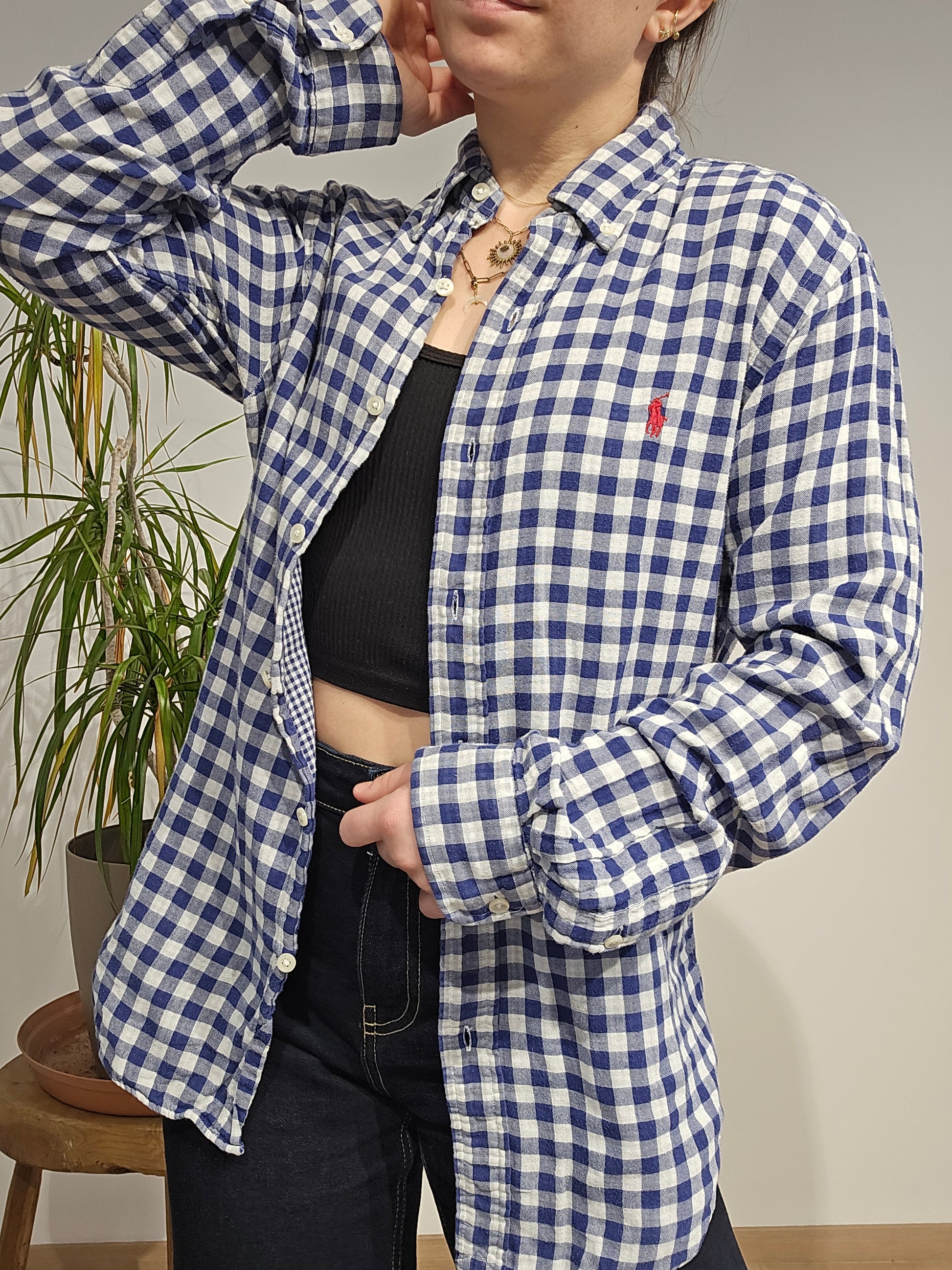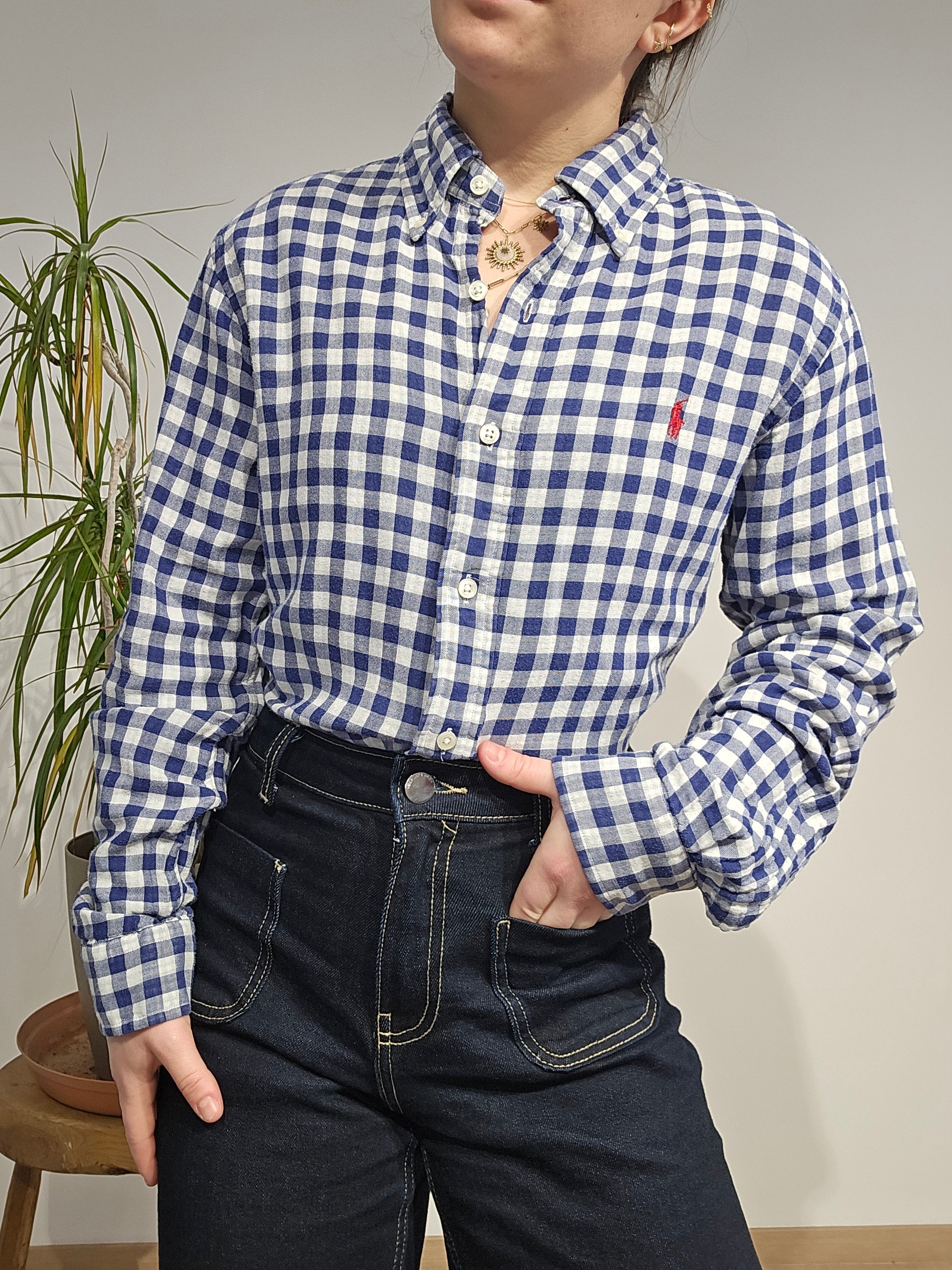 Article : Chemise en vichy bleu, logo brodé rouge