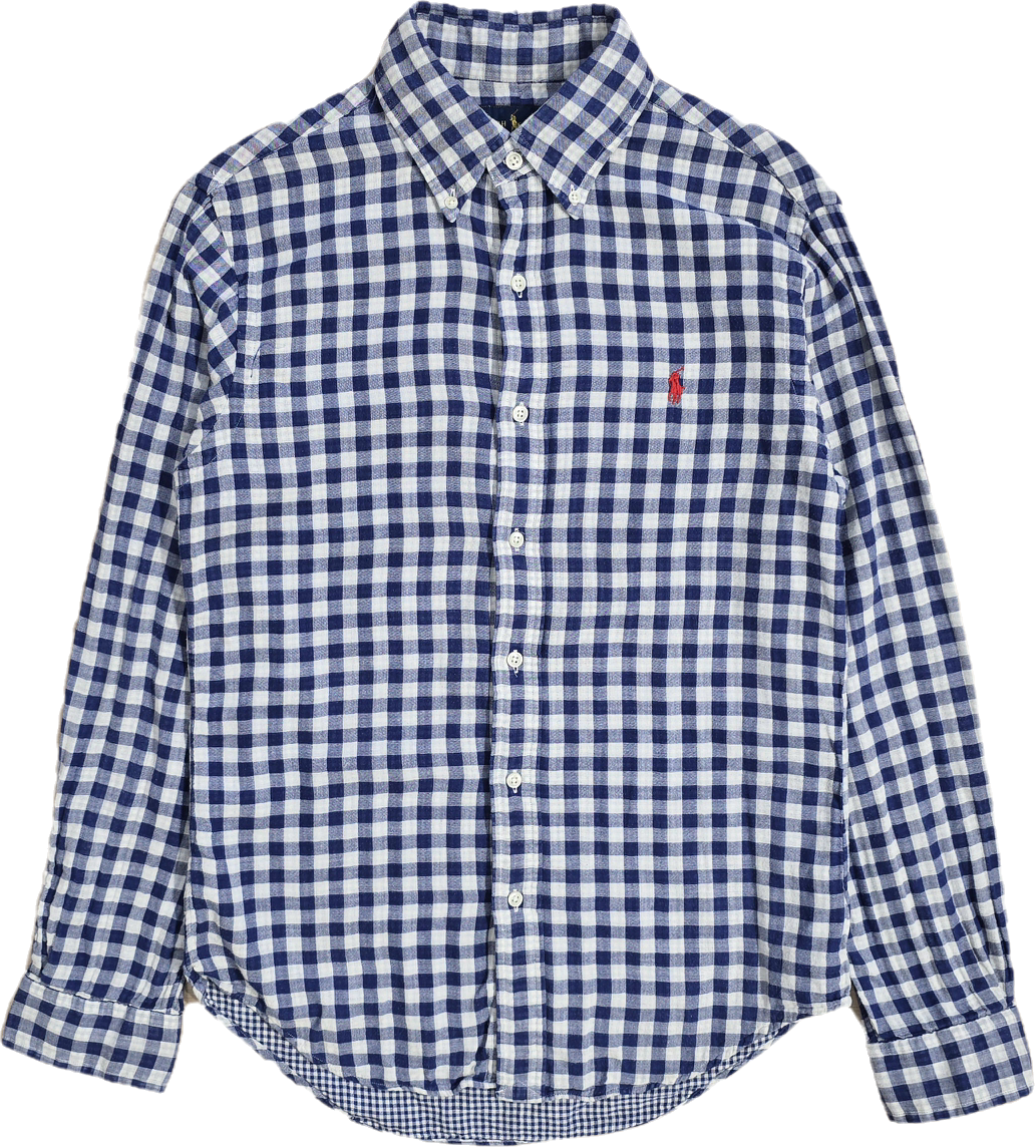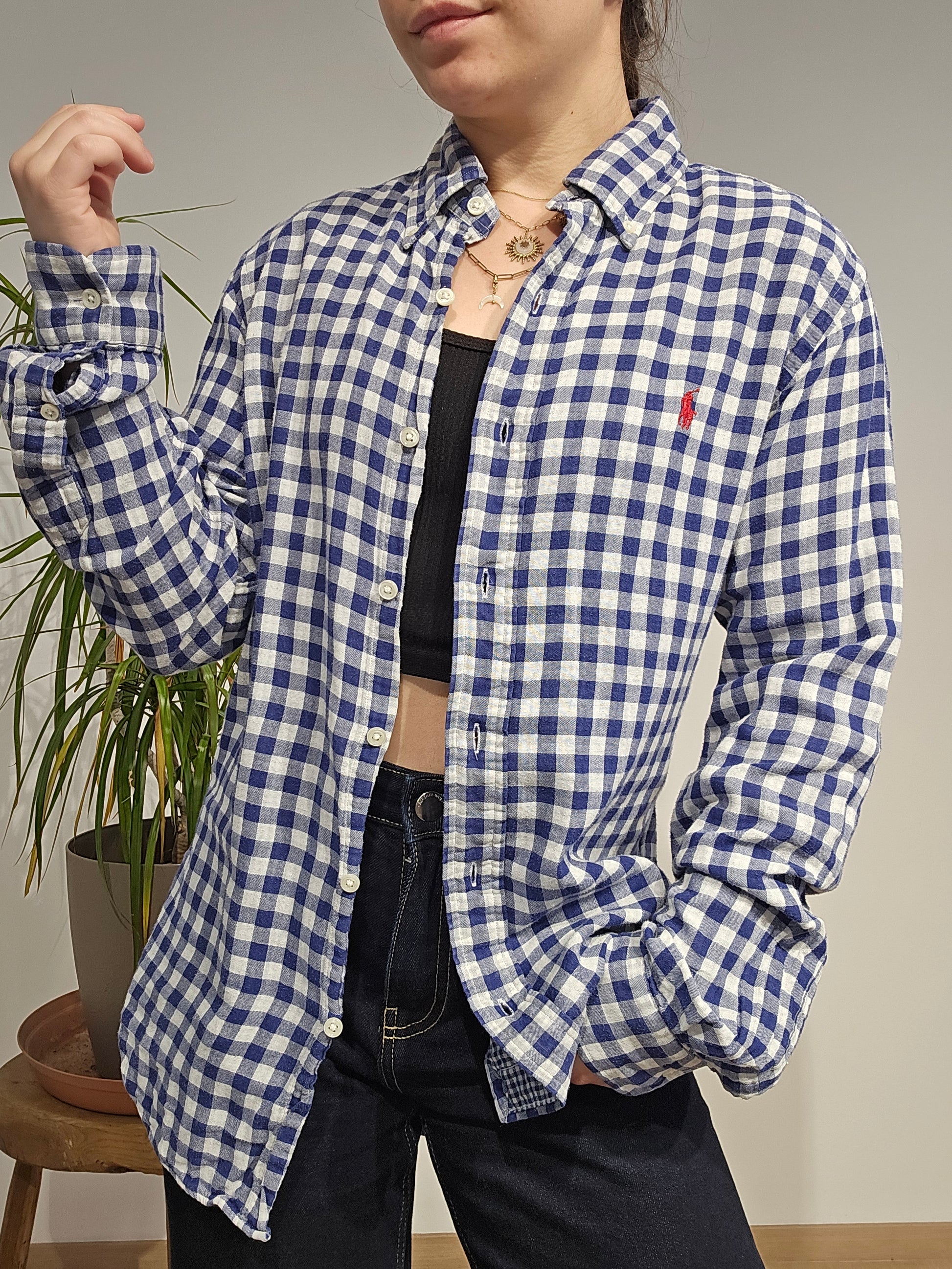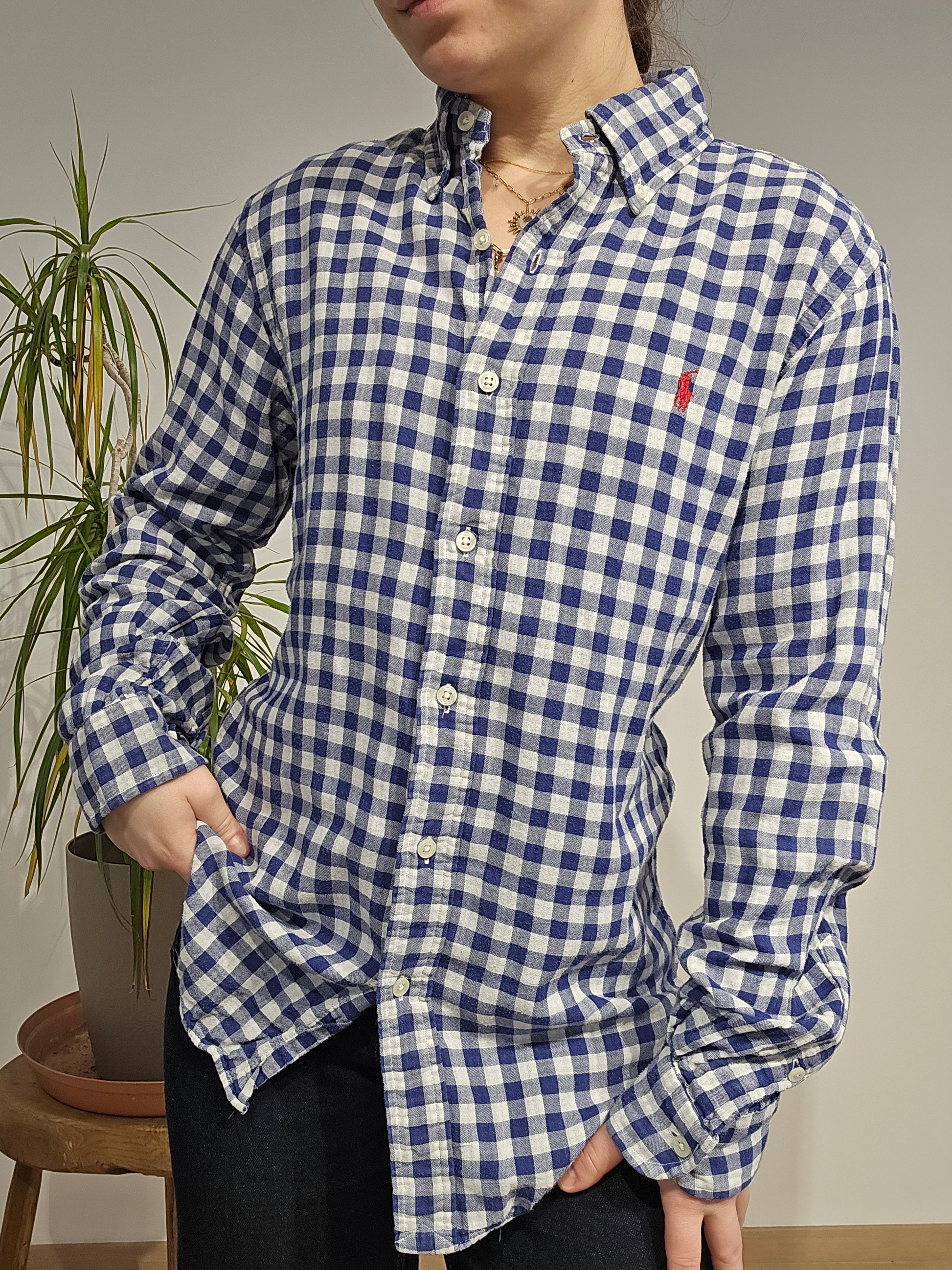 Article : Chemise en vichy bleu, logo brodé rouge