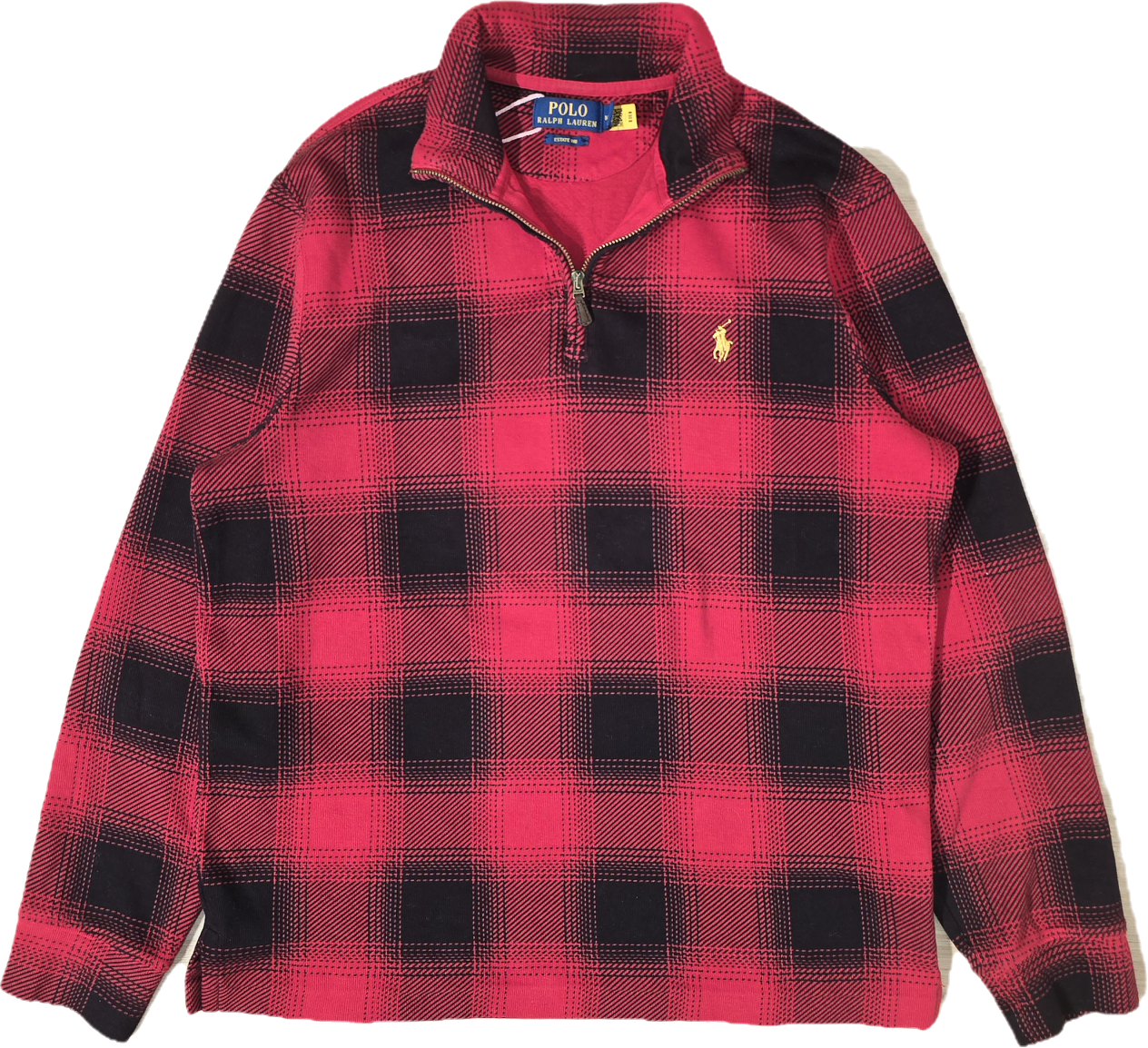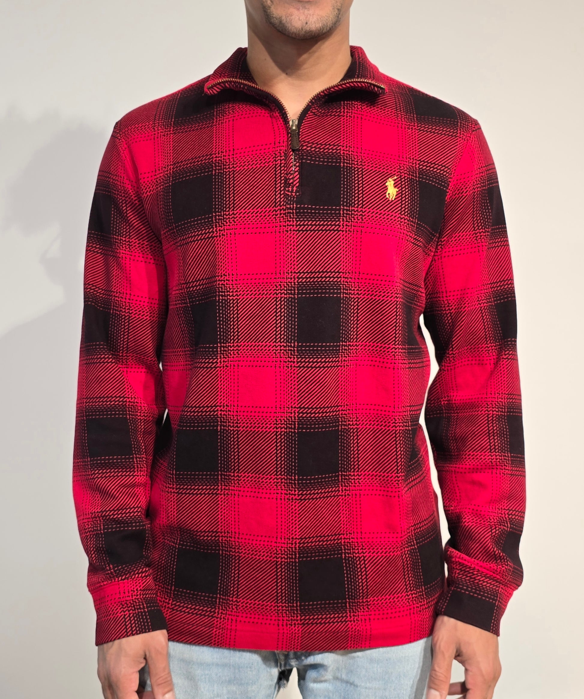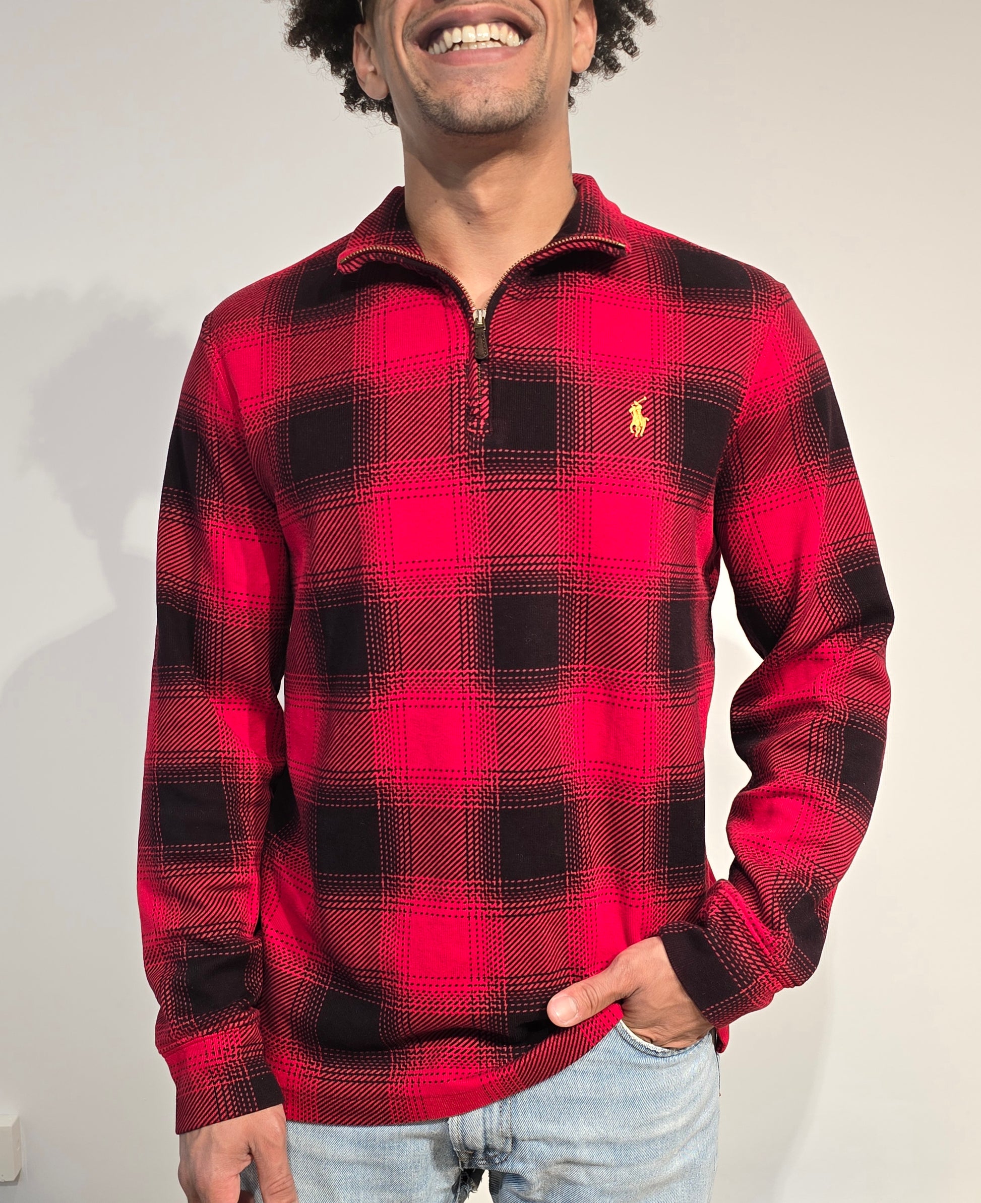 Article : Pull camionneur à carreaux rouge, logo brodé jaune