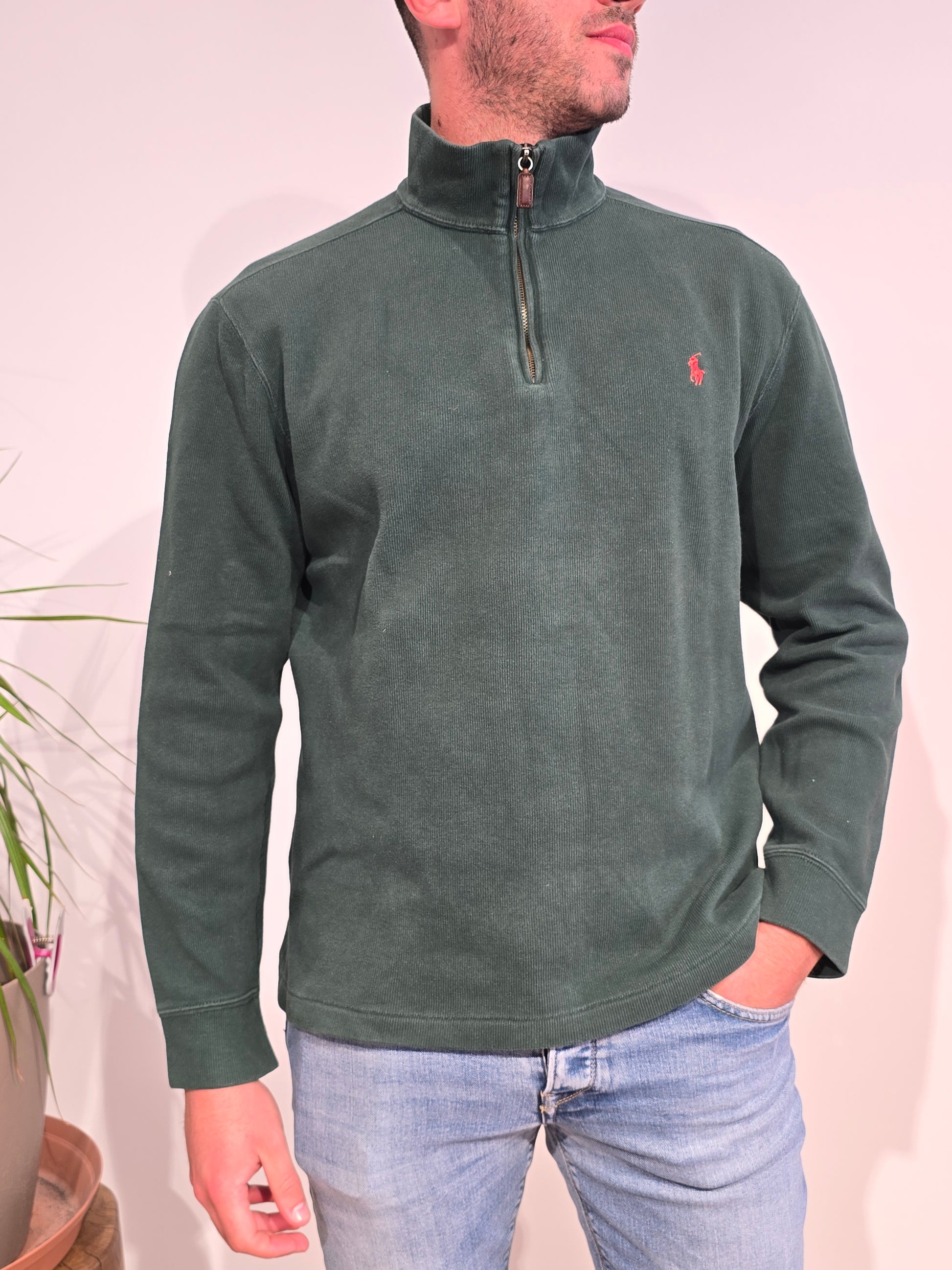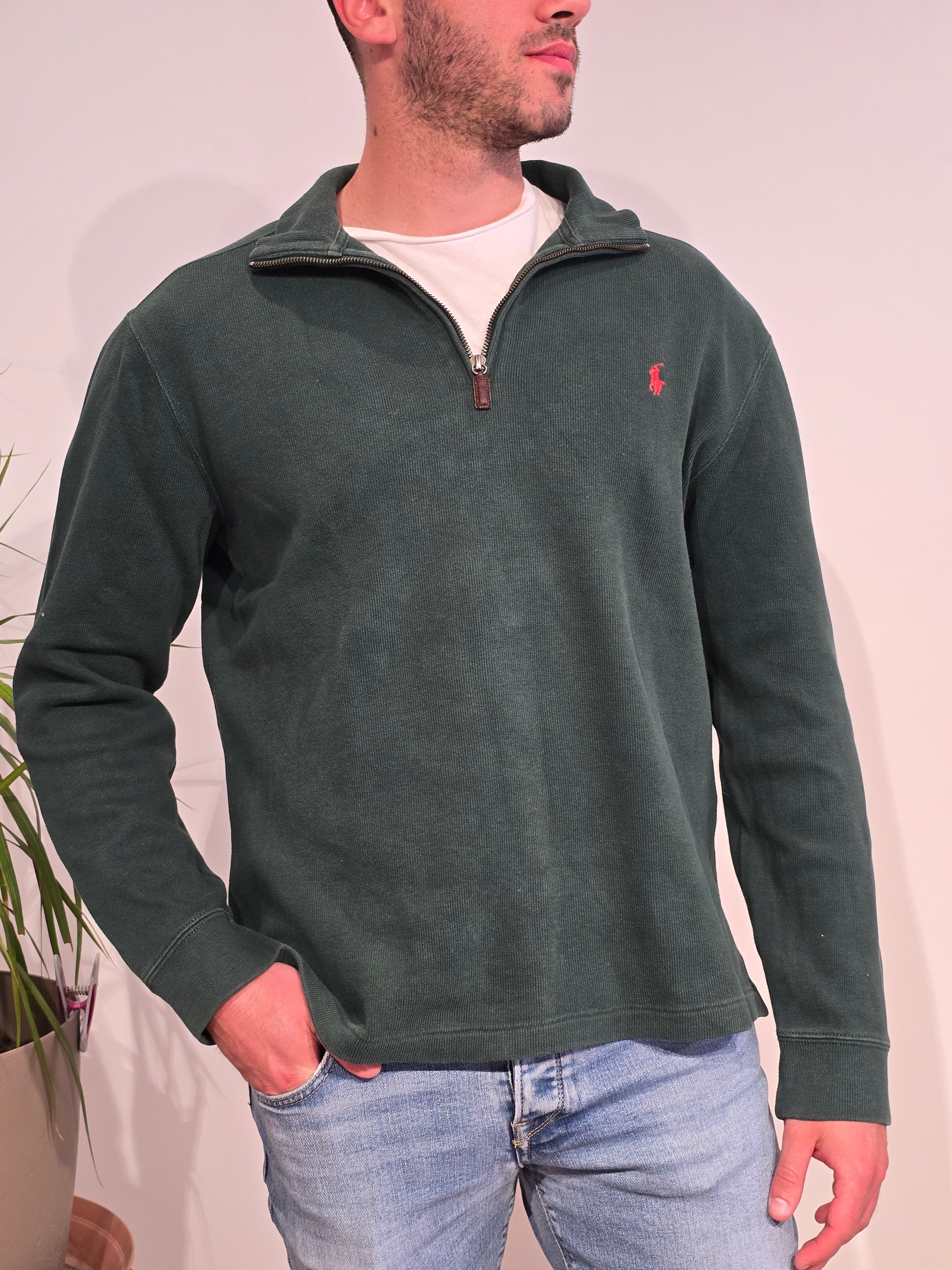 Article : Pull camionneur vert foncé, logo brodé rouge
