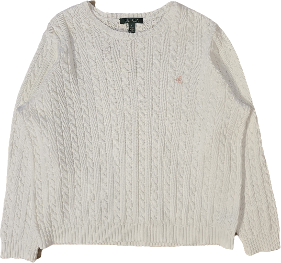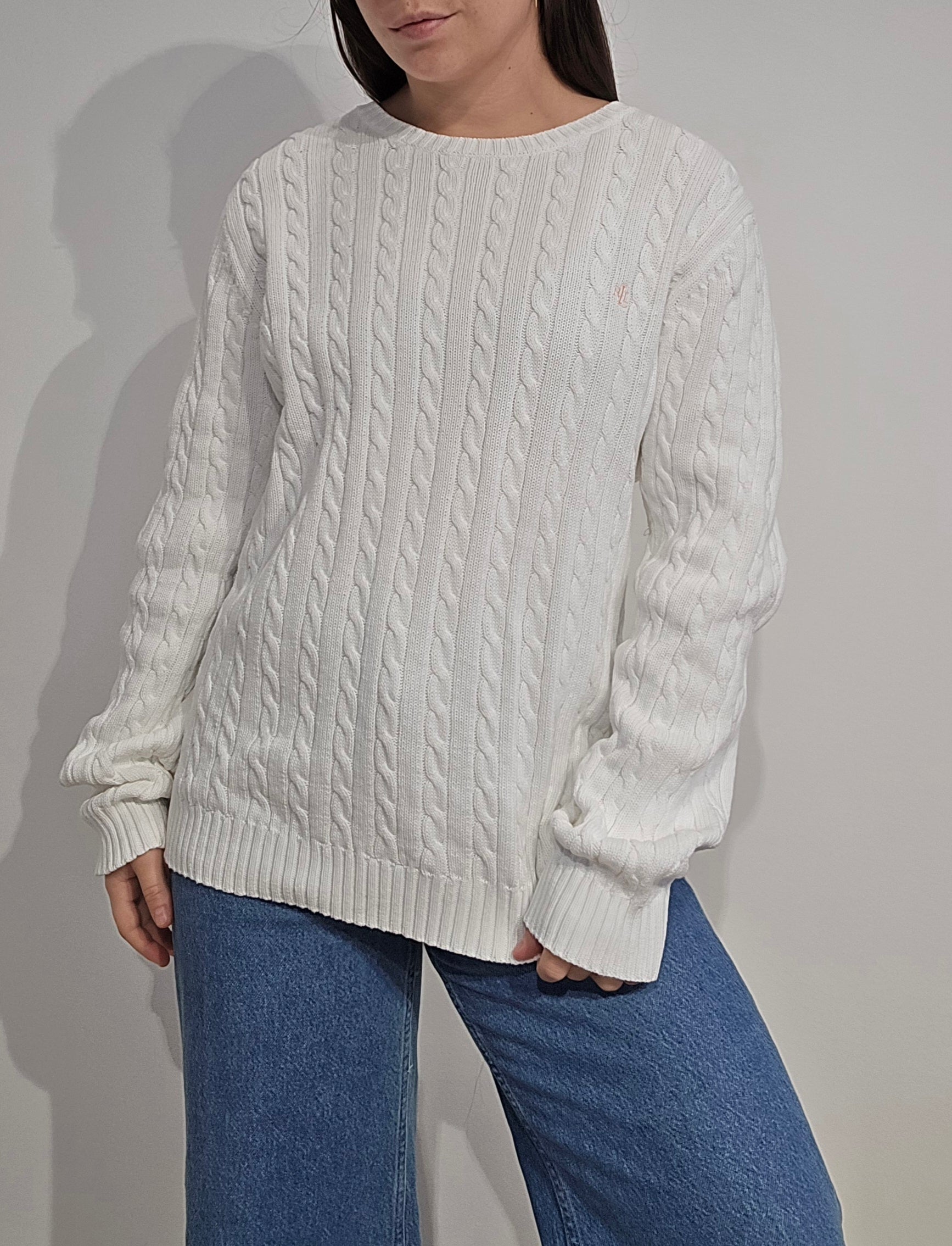 Article : Pull col rond en maille torsadée blanc, logo brodé rose collection RLR