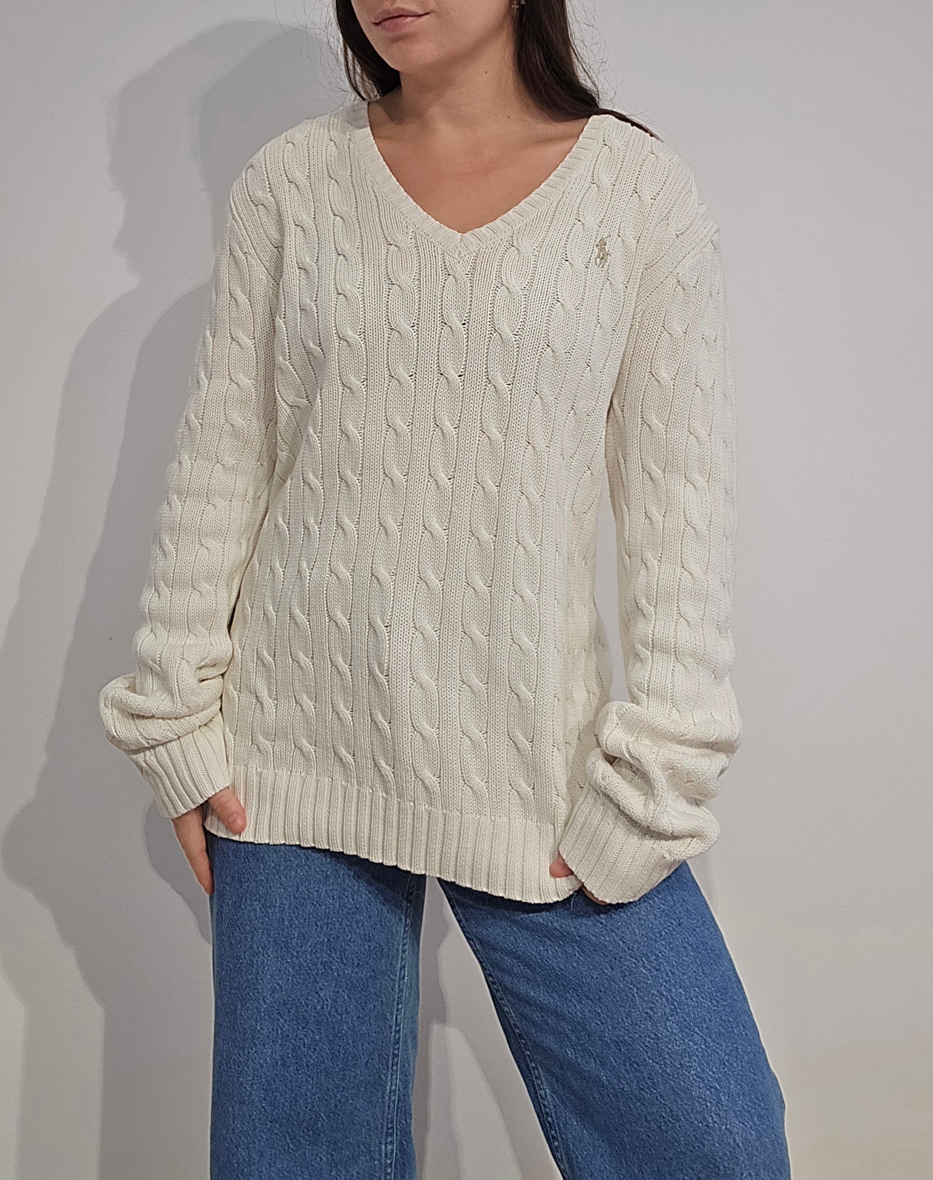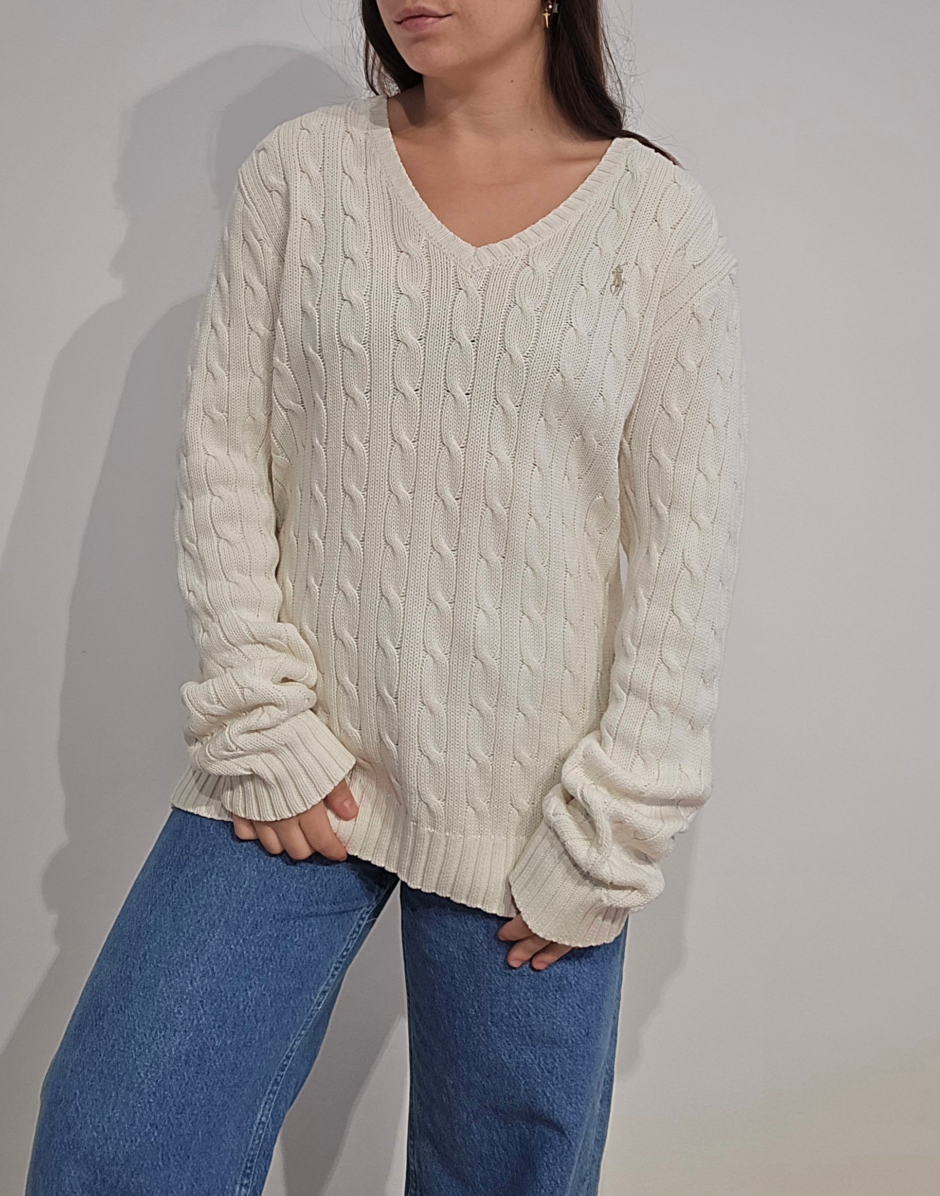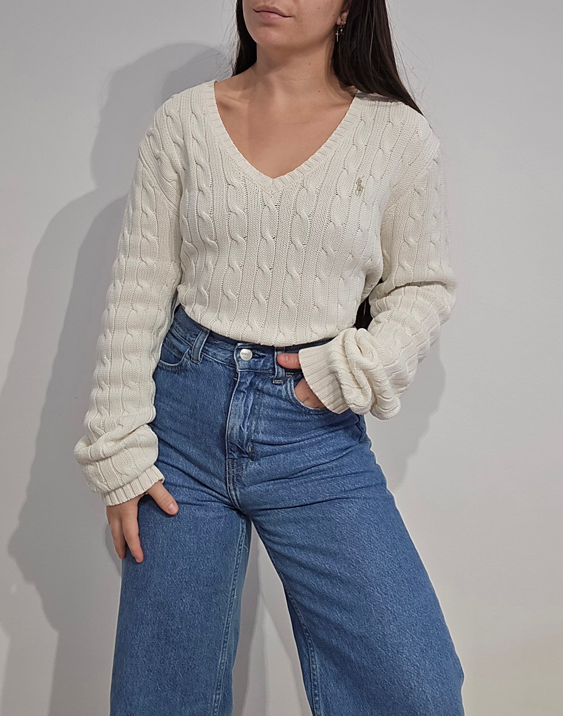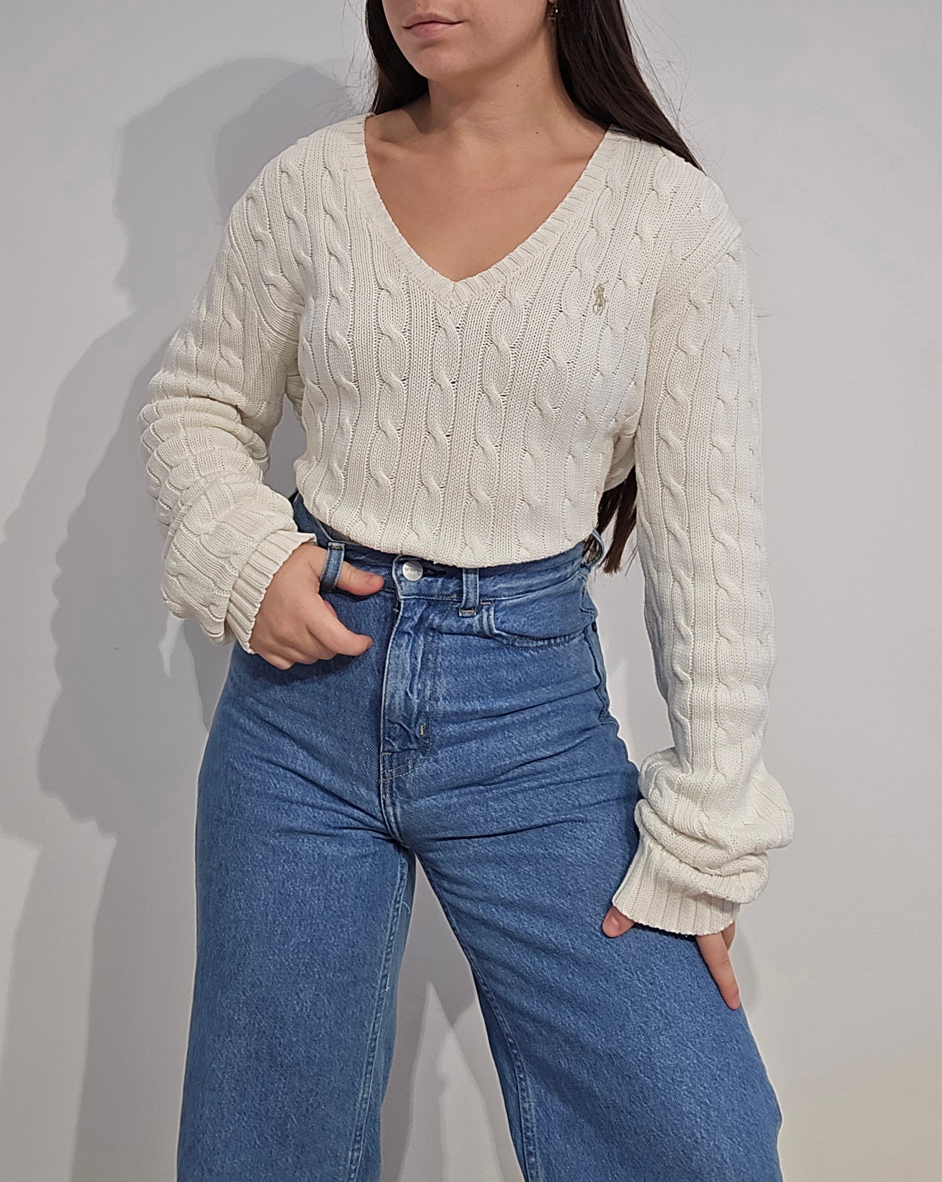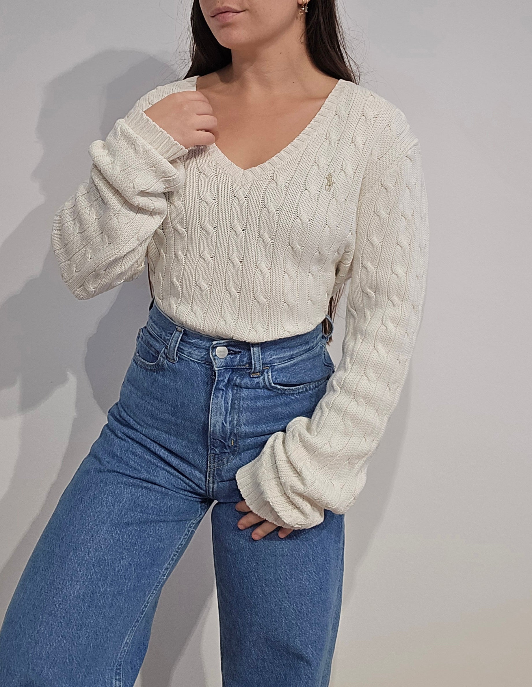 Article : Pull col V en maille torsadée blanc, logo brodé argenté