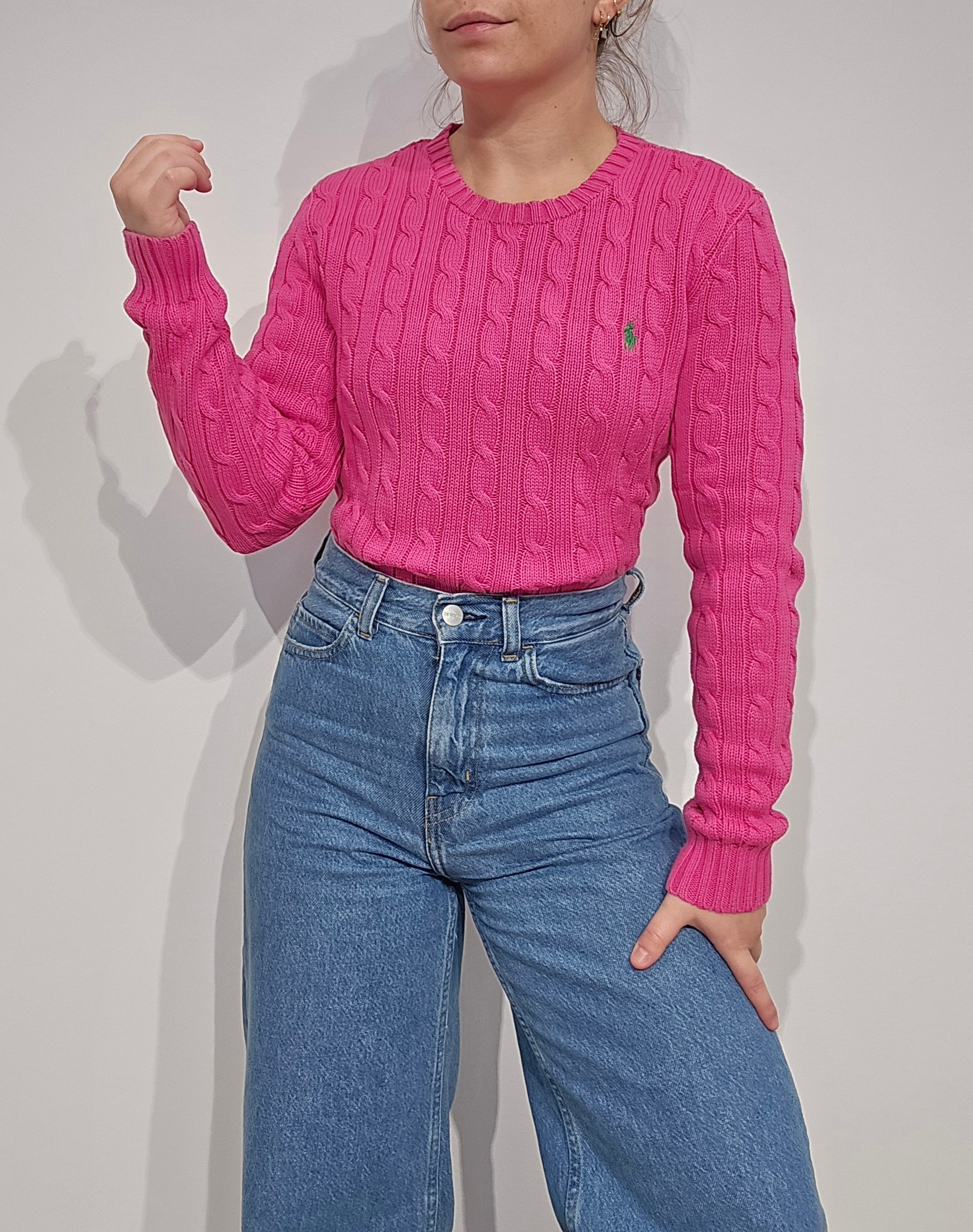 Article : Pull col rond en maille torsadée fushia, logo brodé vert.