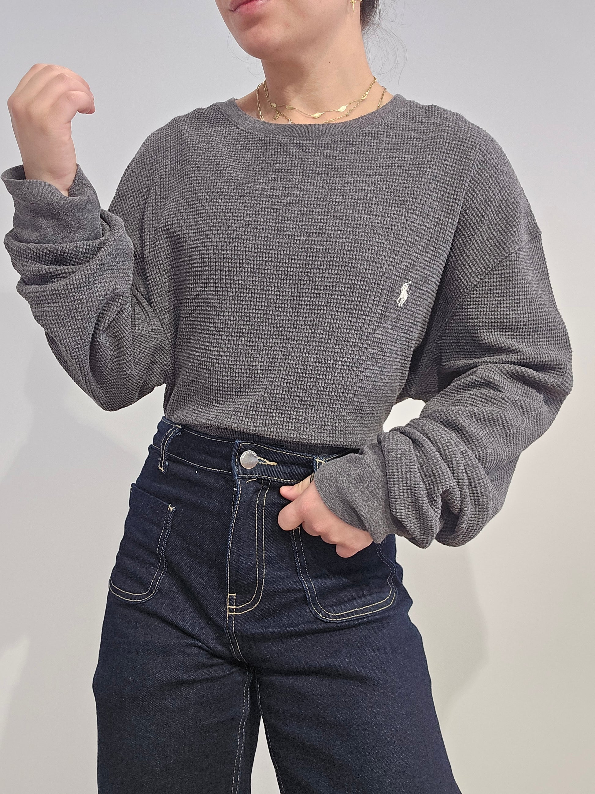 Article : pull léger en maille abeille gris, logo brodé blanc