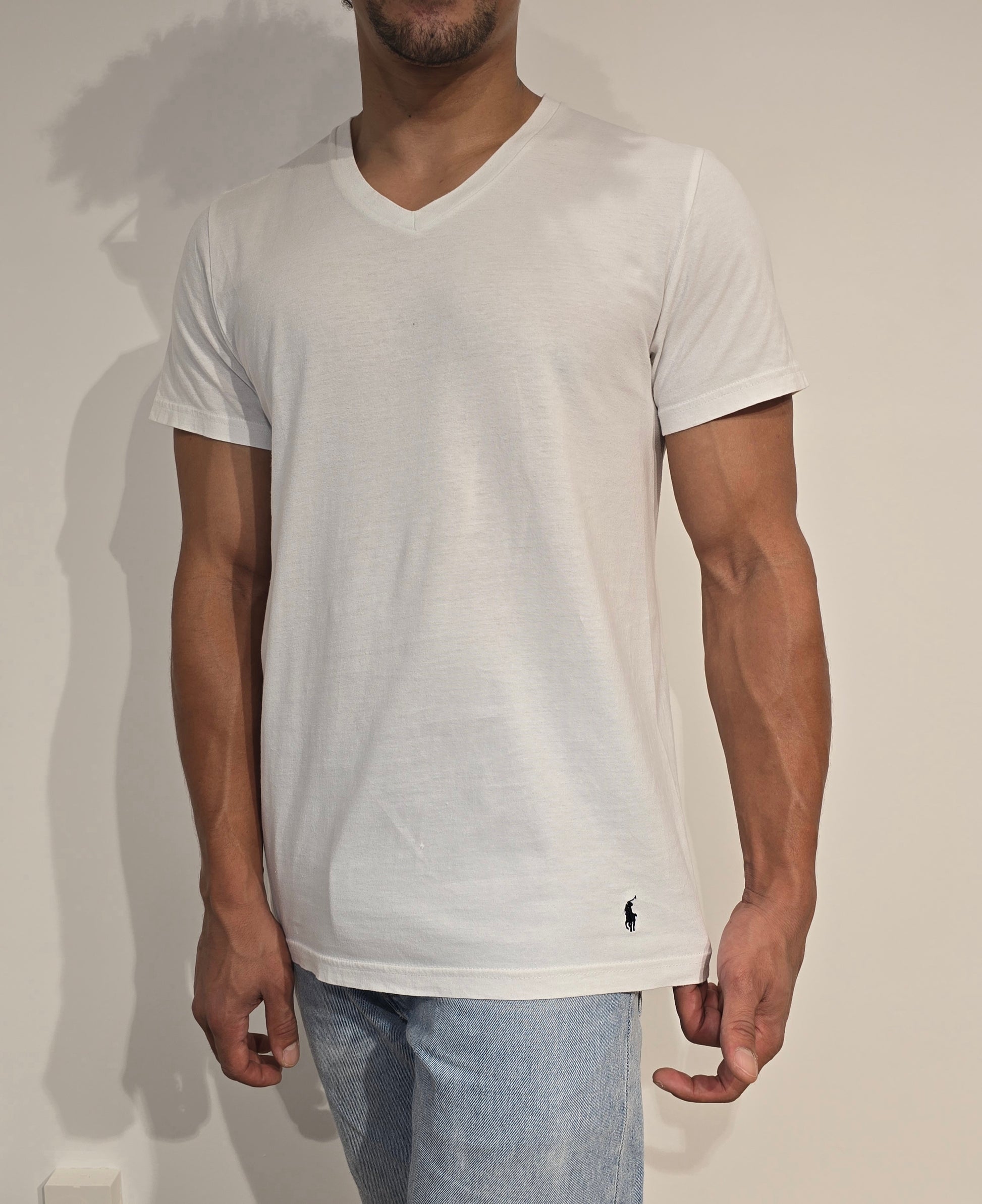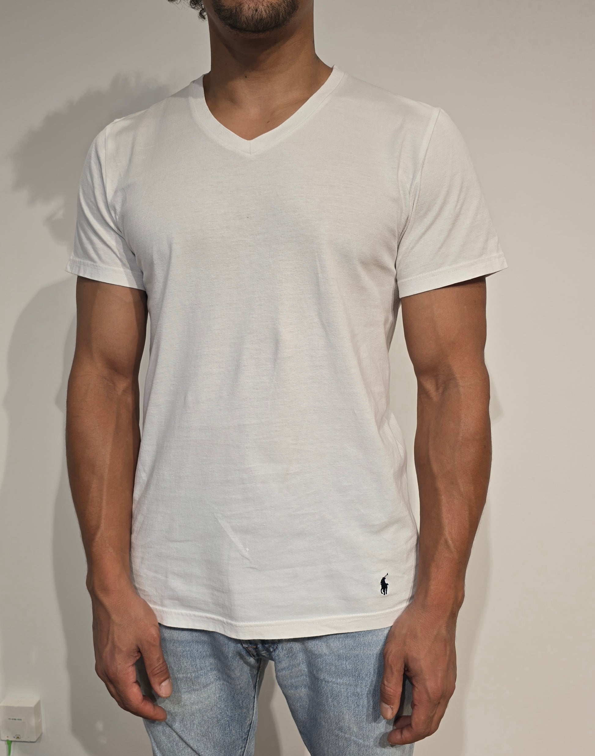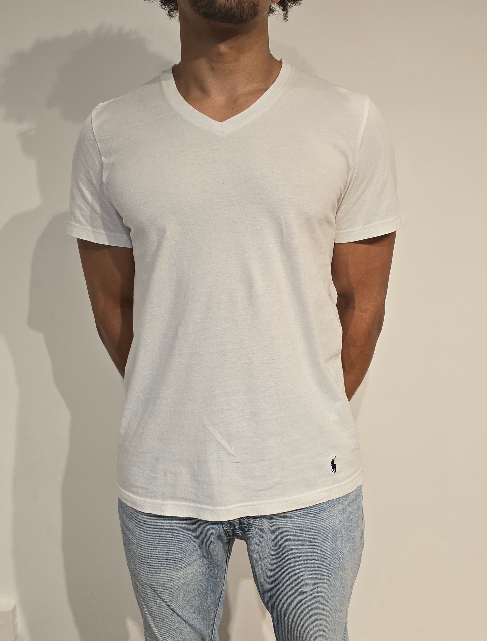 Article : Tee-shirt col V blanc, logo brodé marine