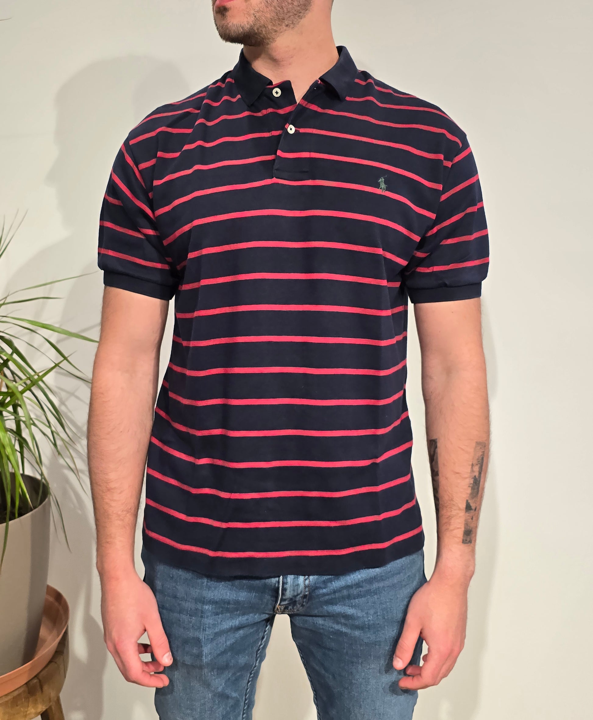 Article :  Polo bleu marine à rayures rouge, logo brodé vert foncé