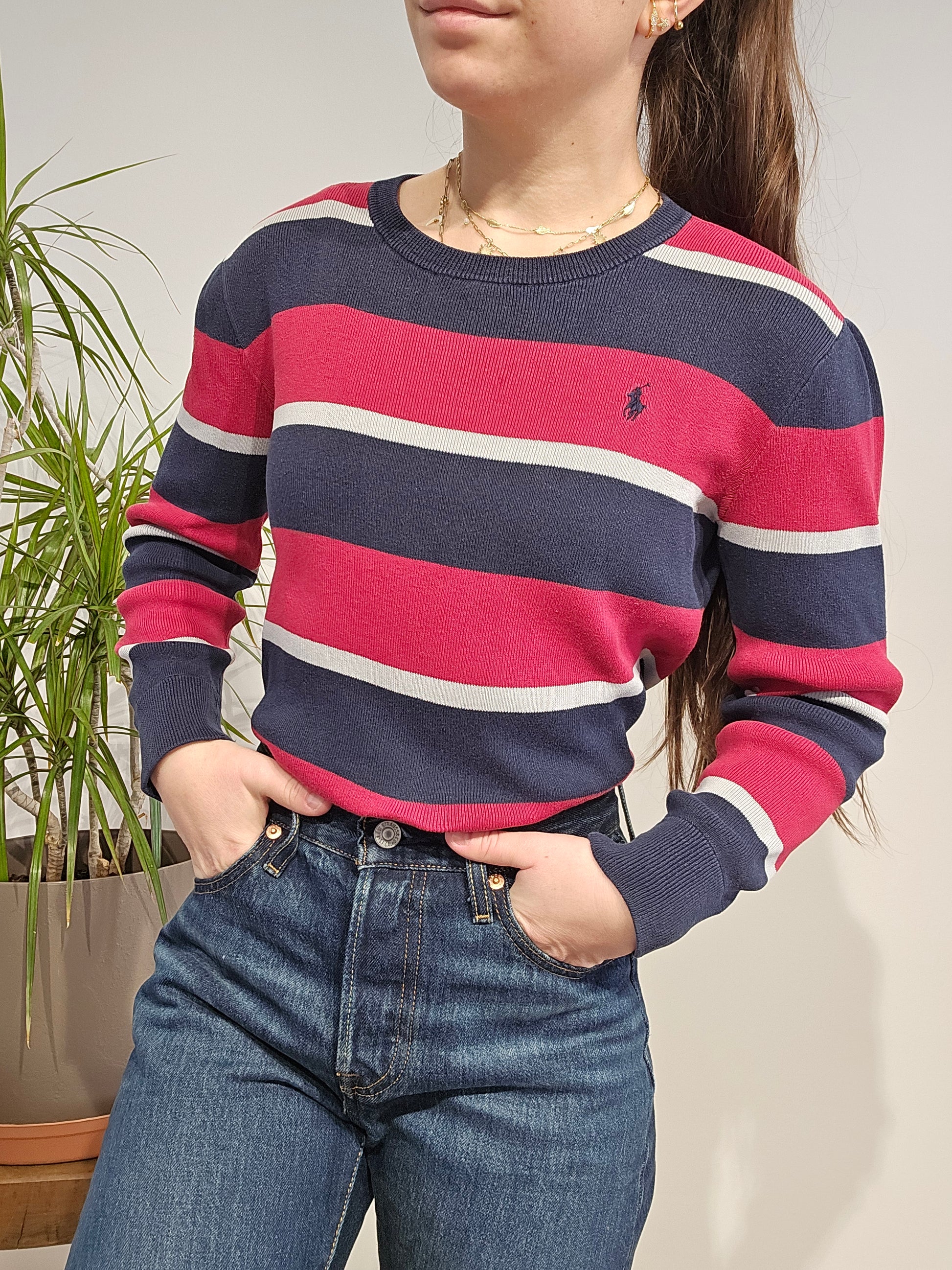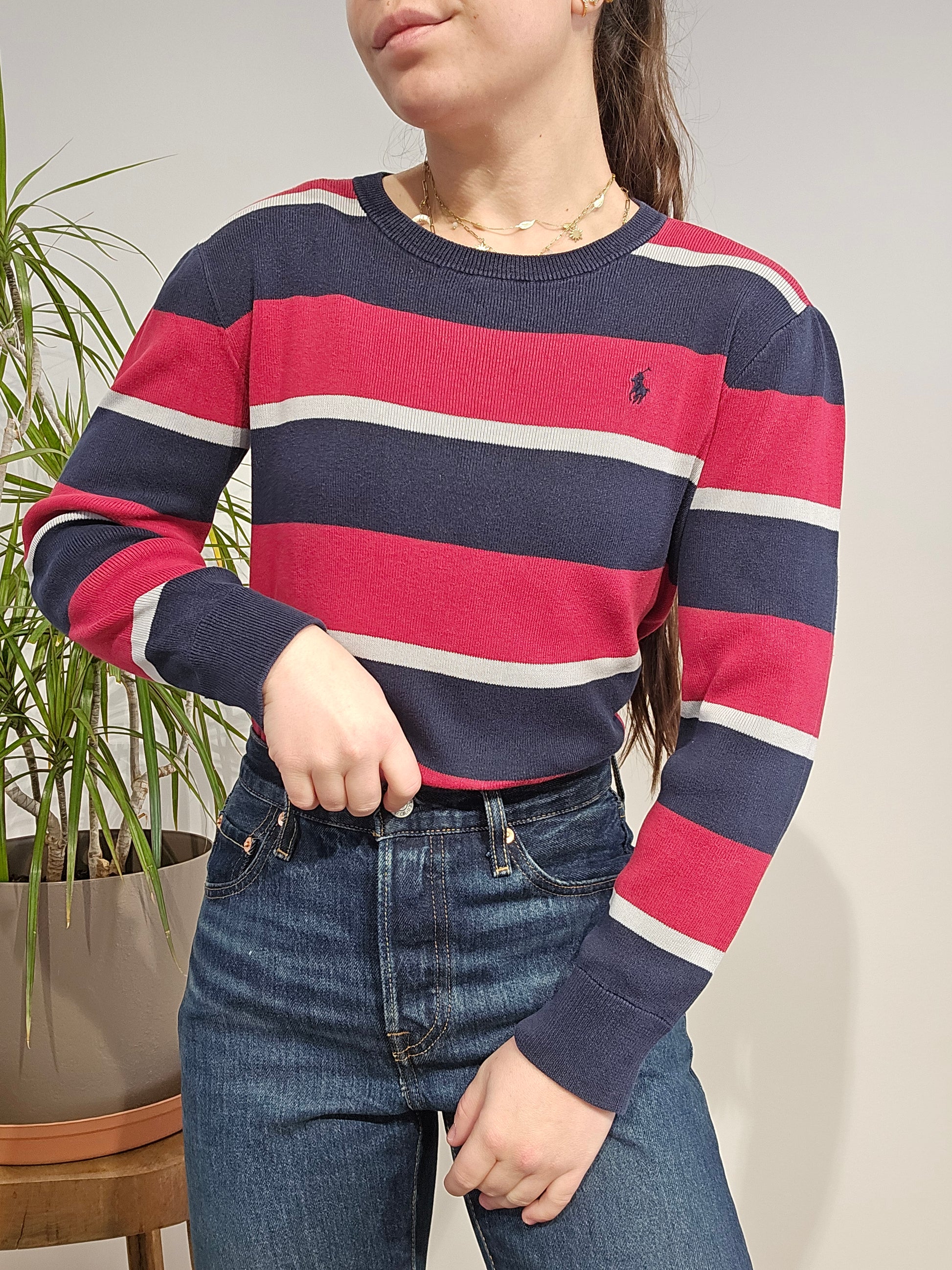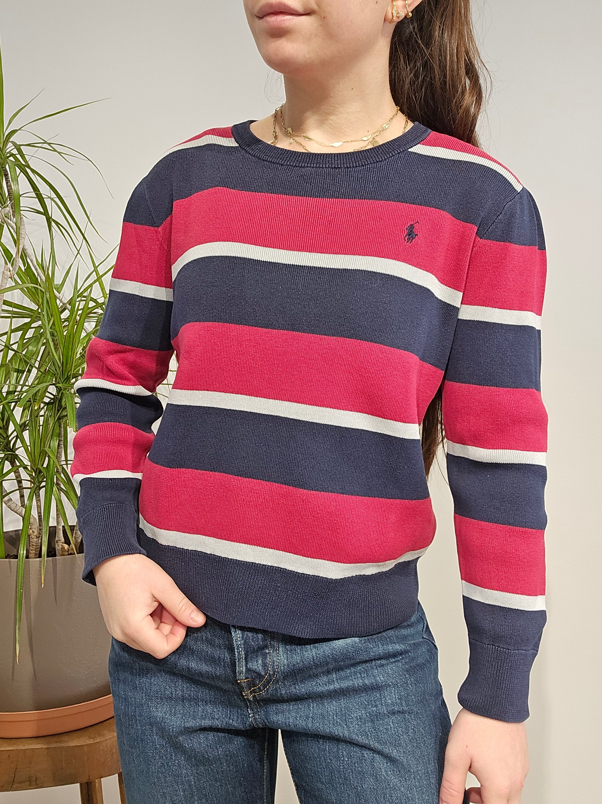 Article : Pull à rayures rouge/marine/blanc, logo brodé marine