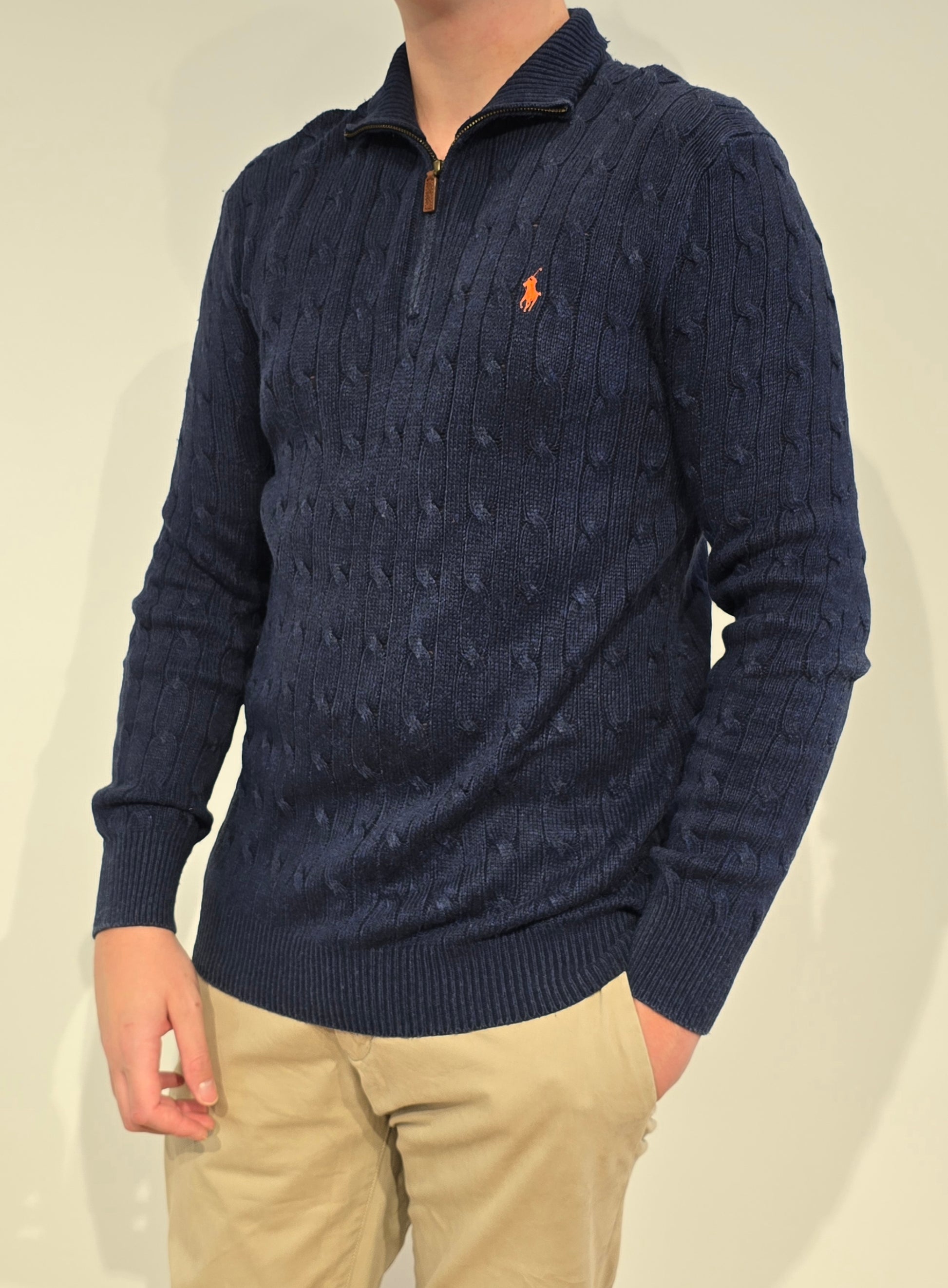 Article :  Pull camionneur en maille torsadée bleu marine, logo brodé orange