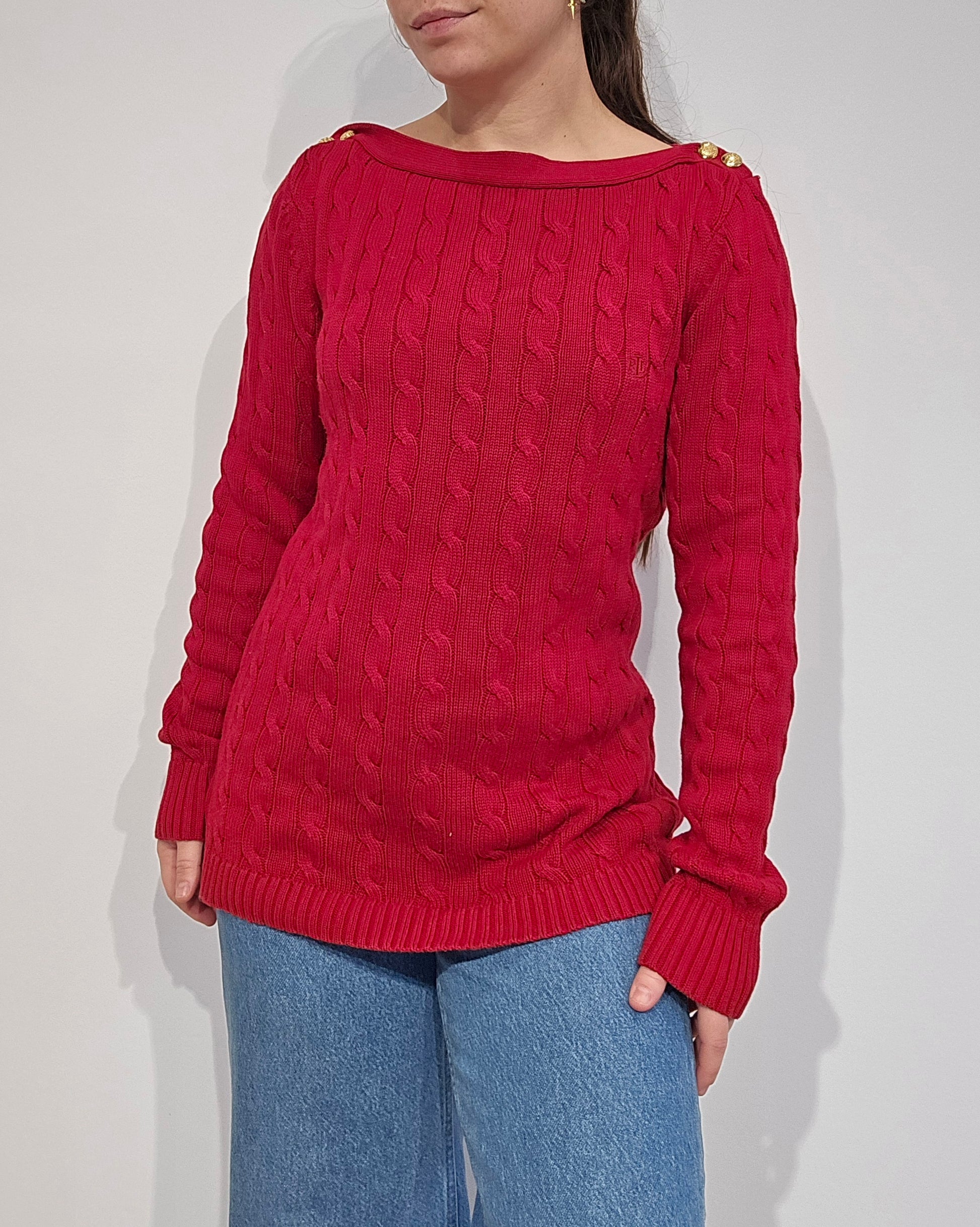 Article : Pull col bateau en maille torsadée rouge, logo brodé rouge collection RLR.