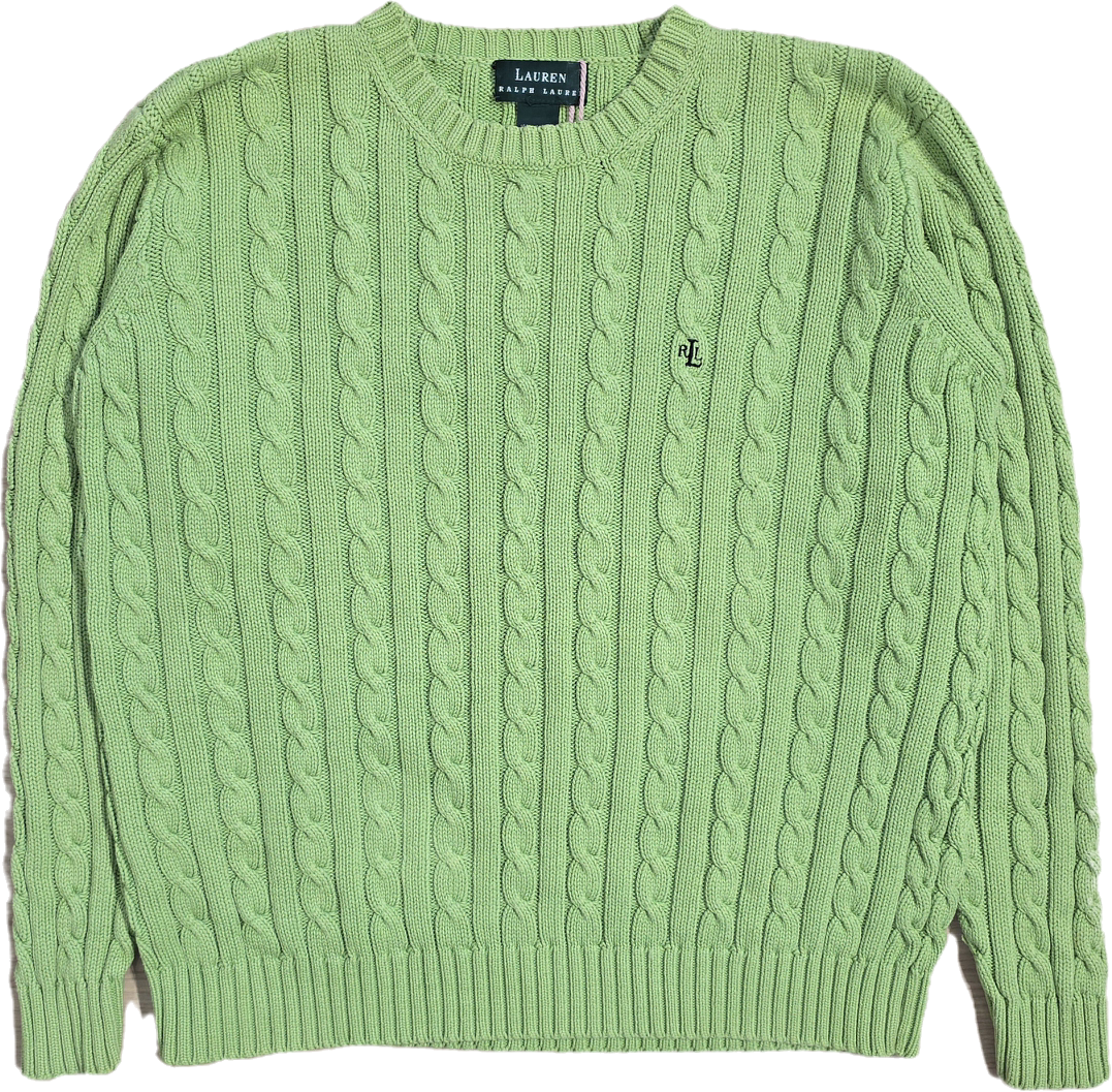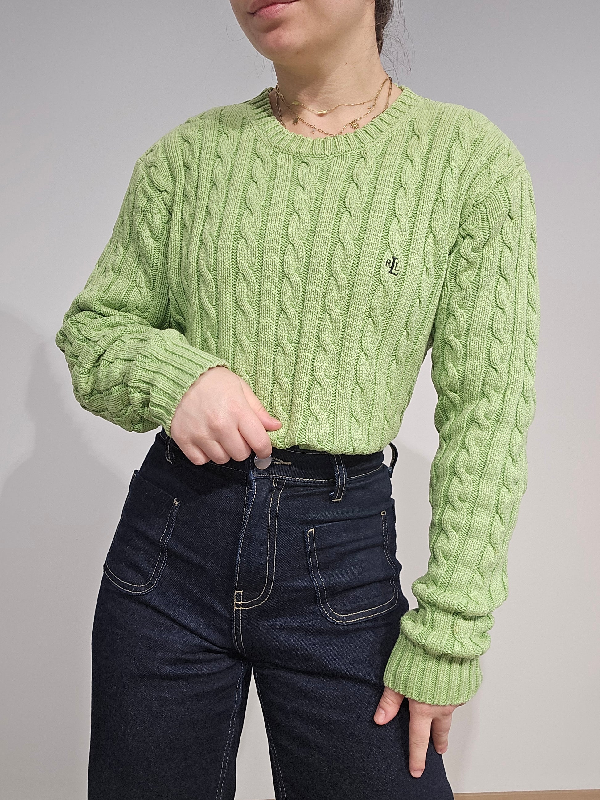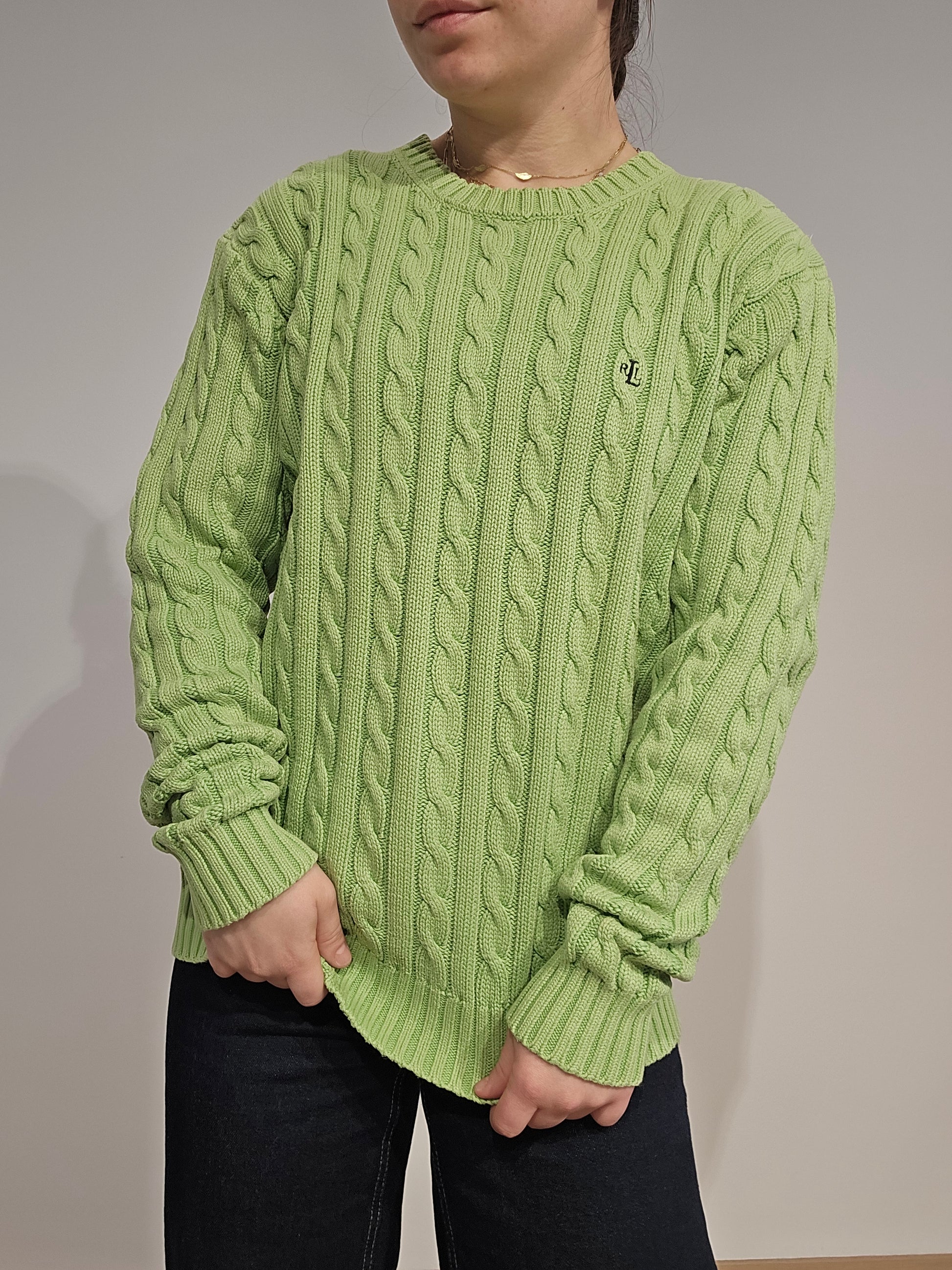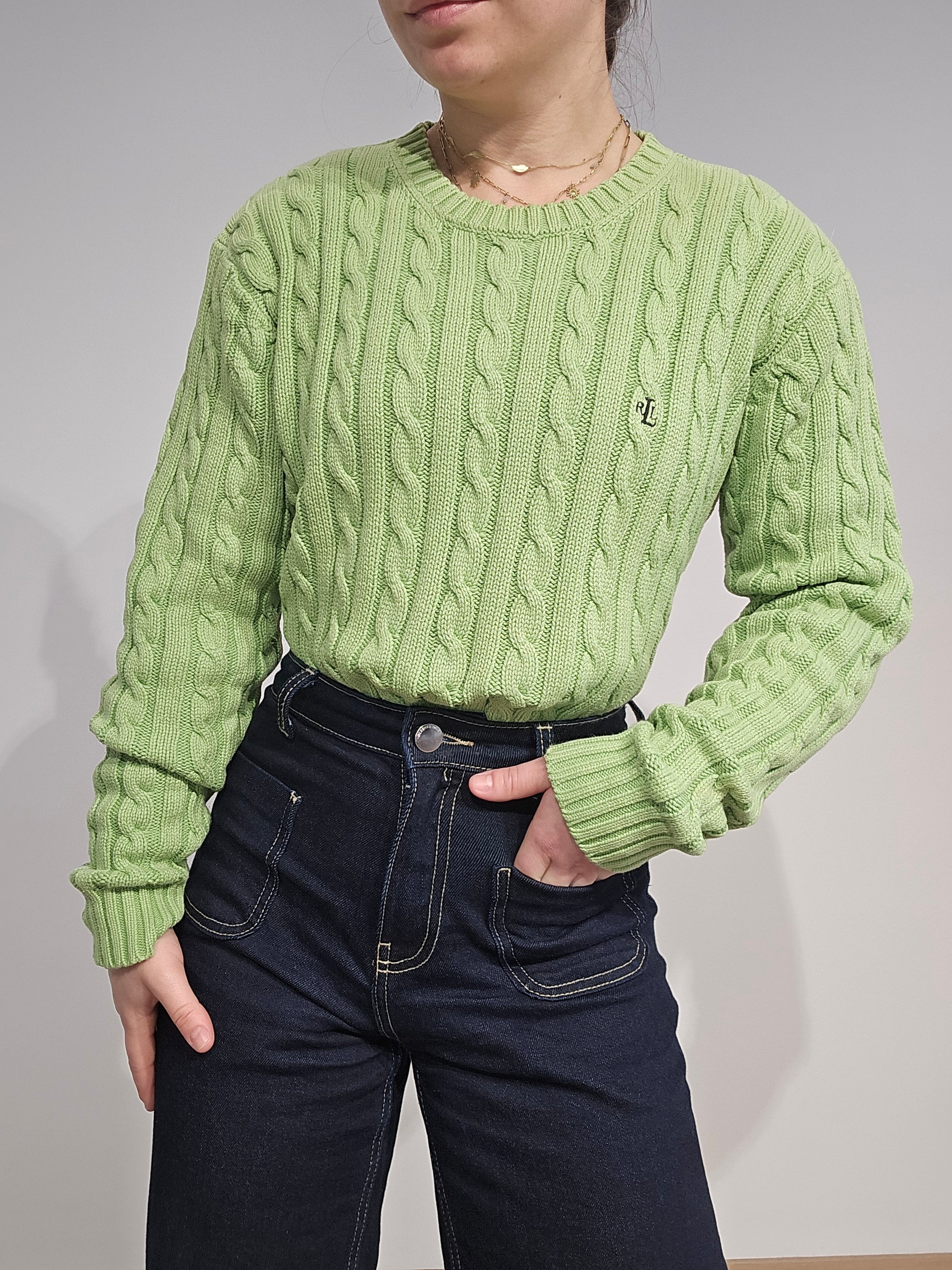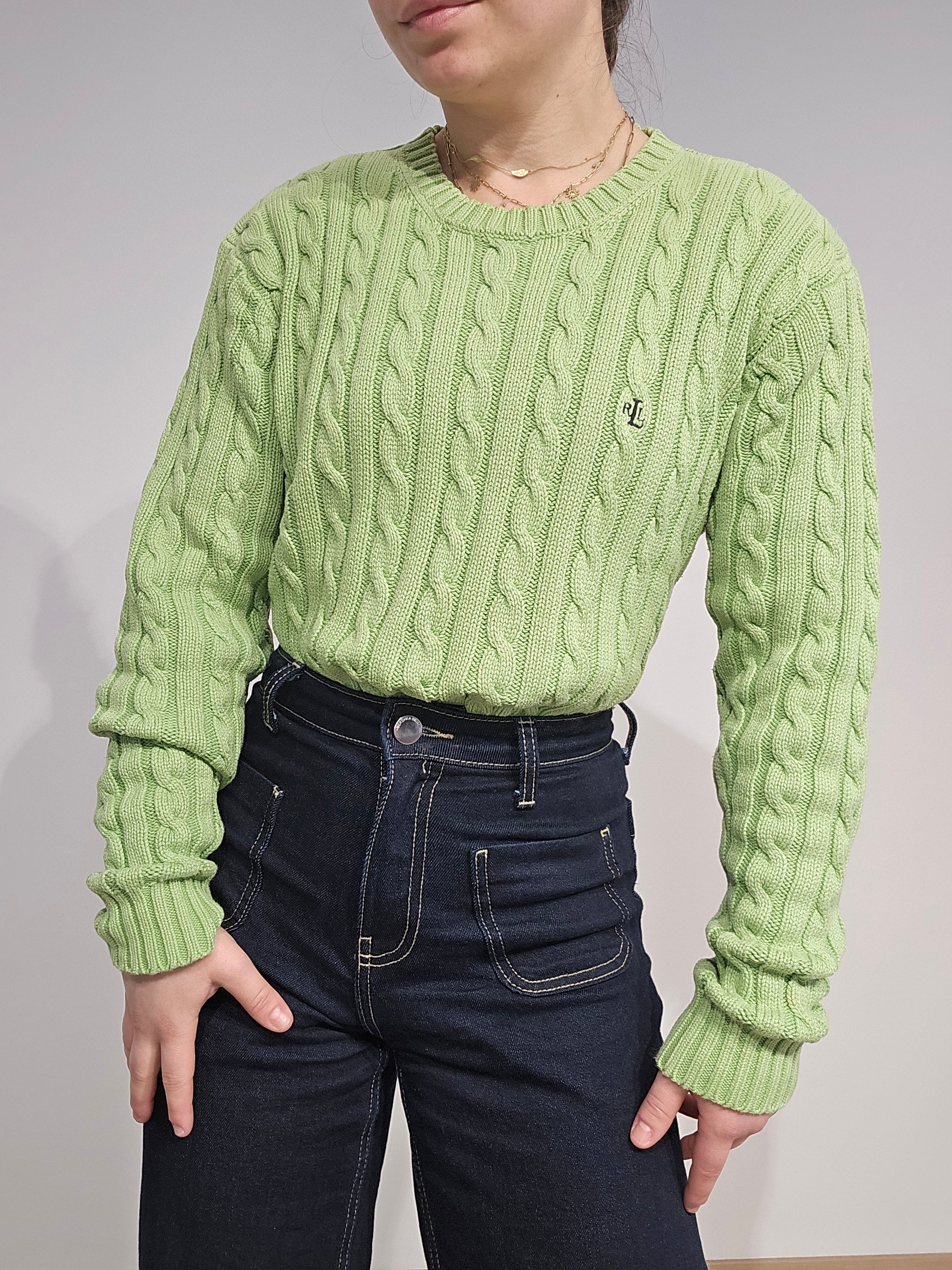 Article : Pull col rond en maille torsadée vert, collection RLR brodé noir