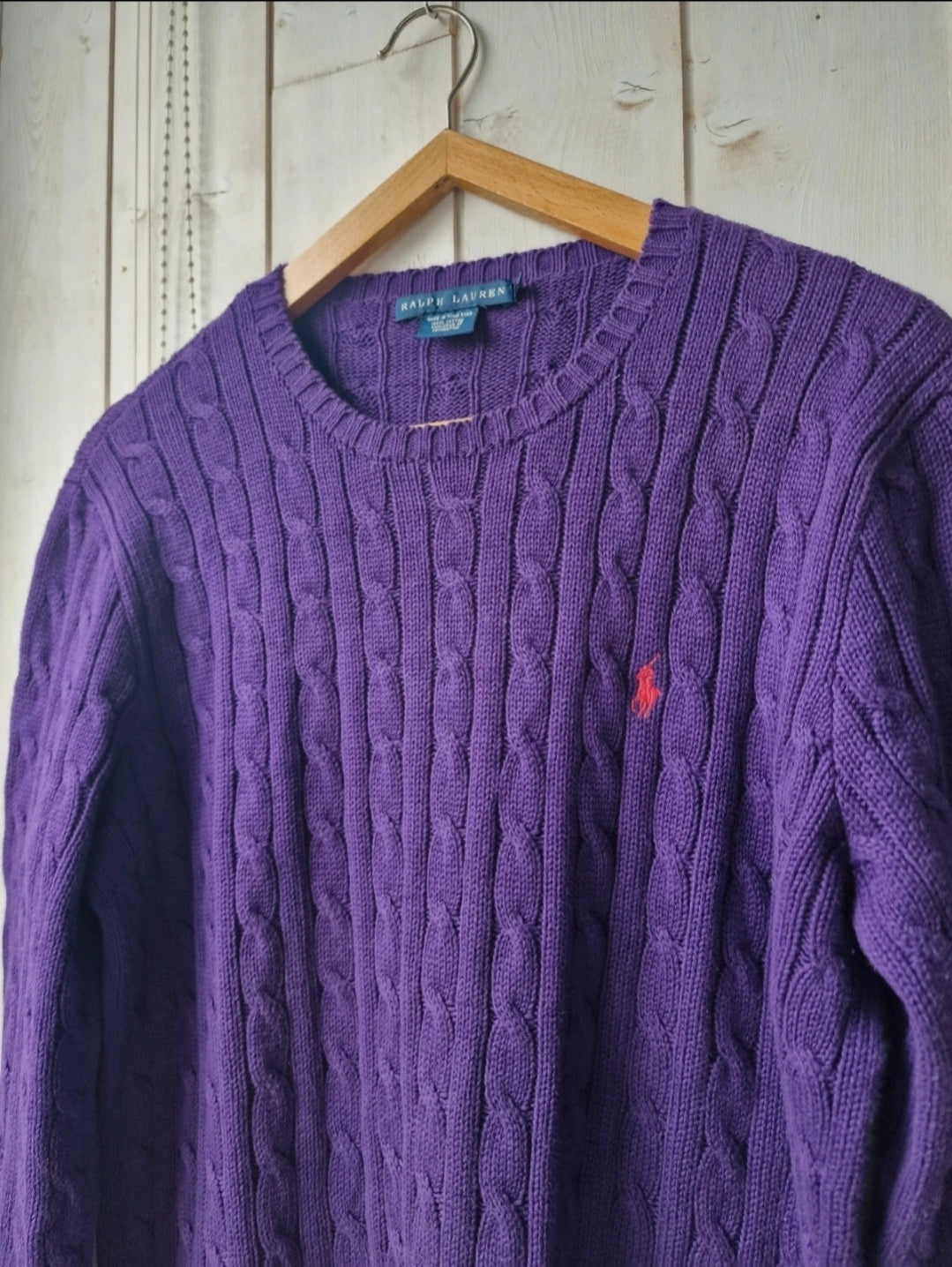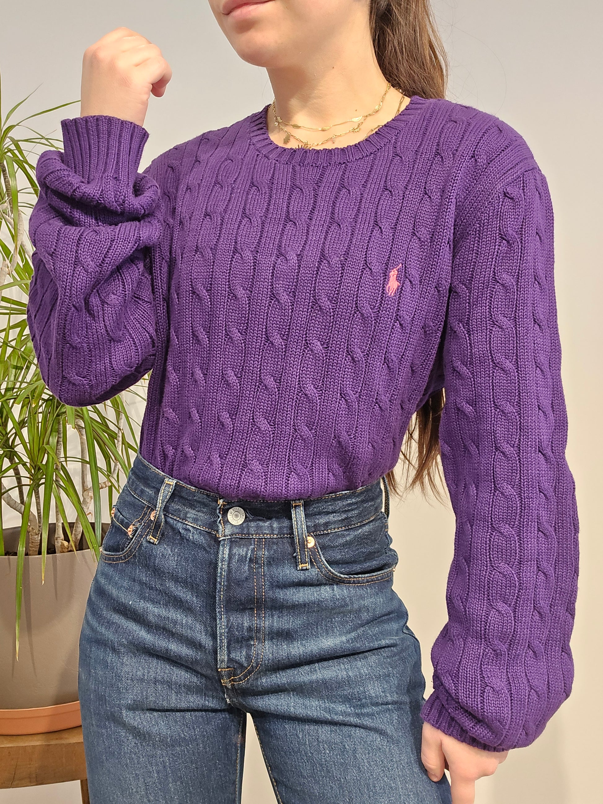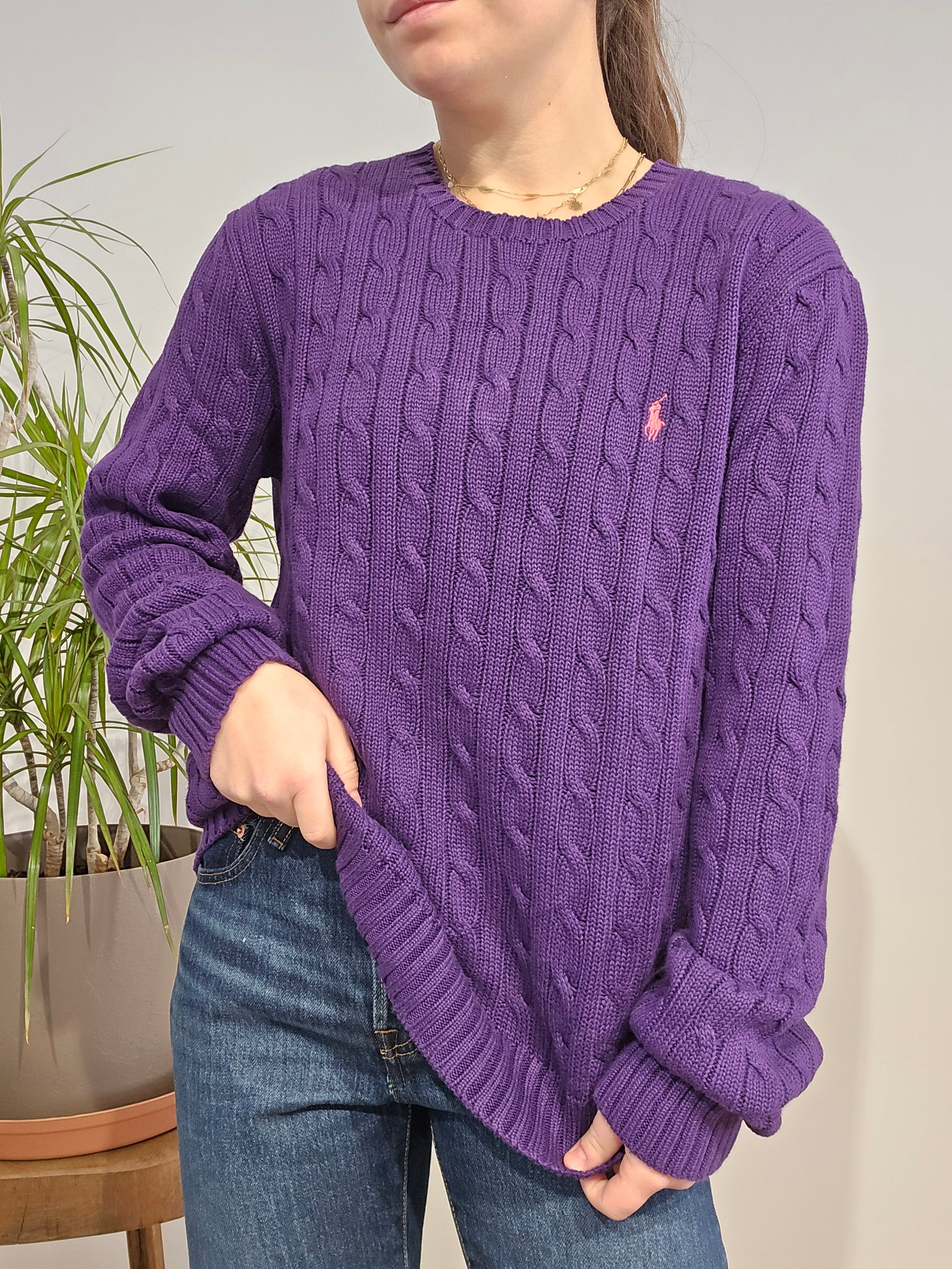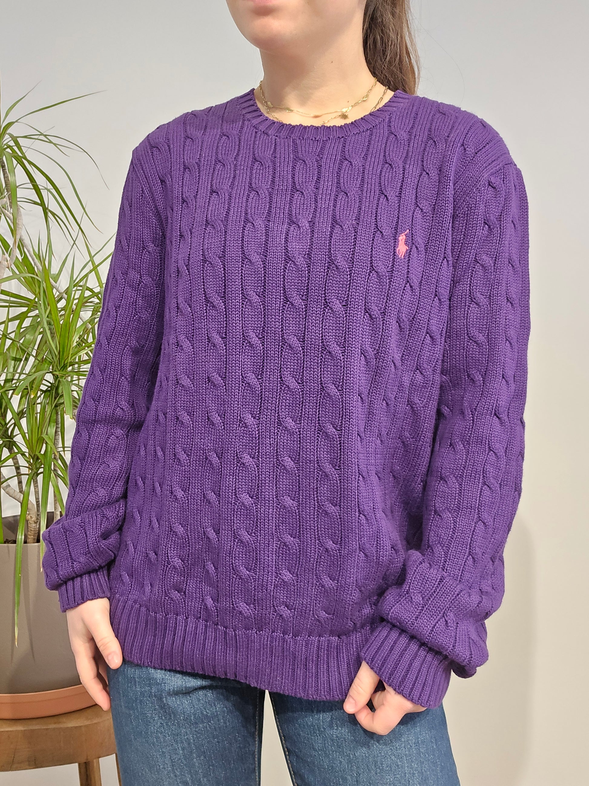 Article : Pull col rond en maille torsadée violet, logo brodé rouge