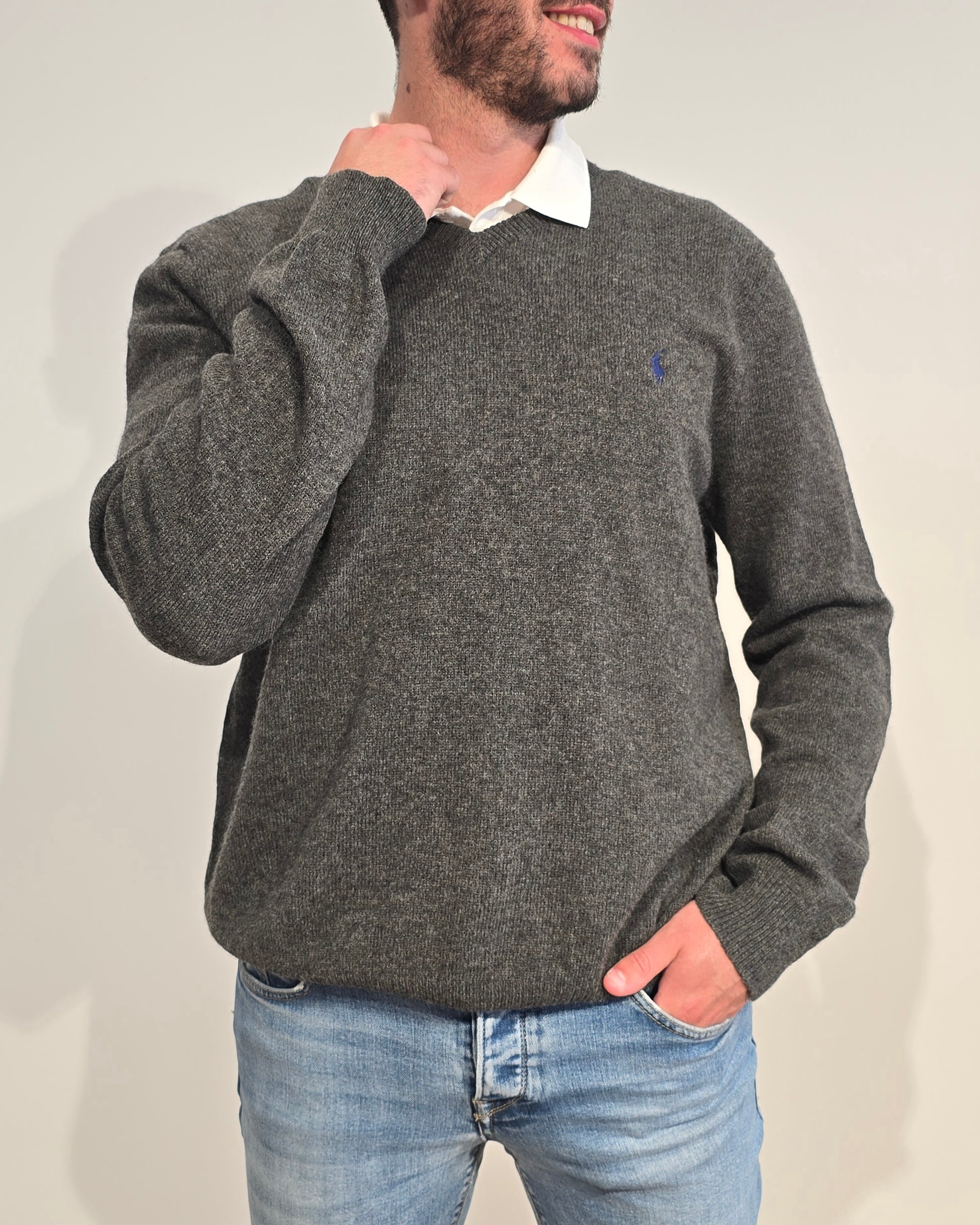 Pull col V en laine gris - L/XL