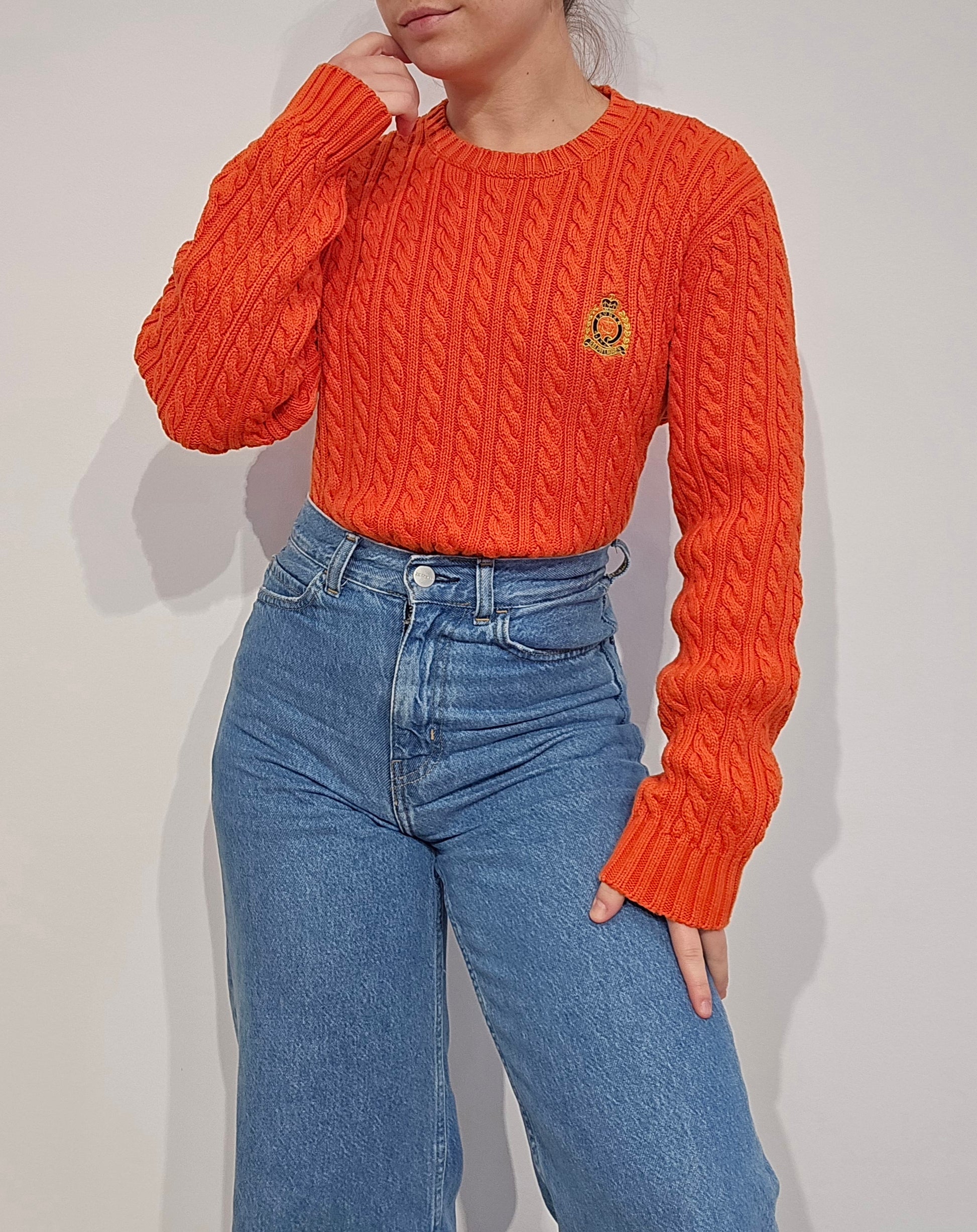 Article : Pull col rond en maille torsadée orange, blason brodé vintage