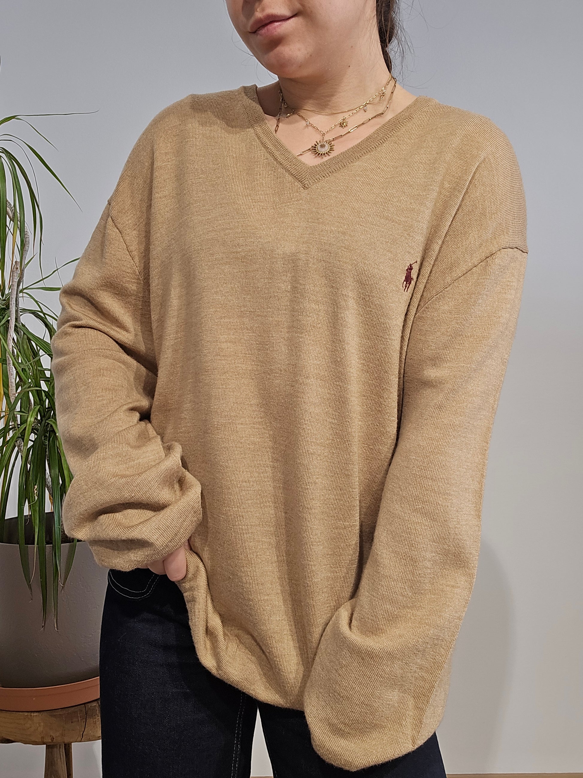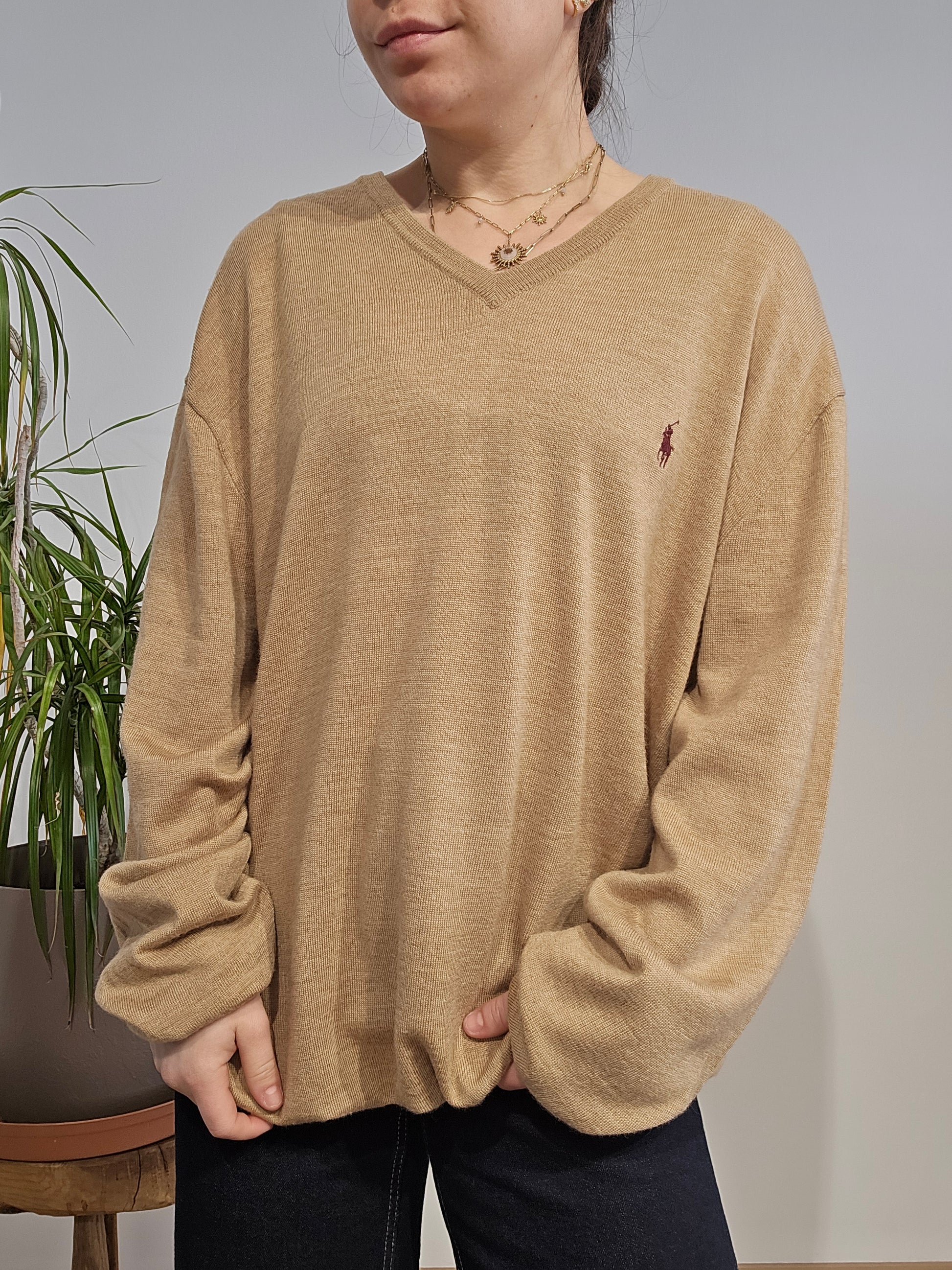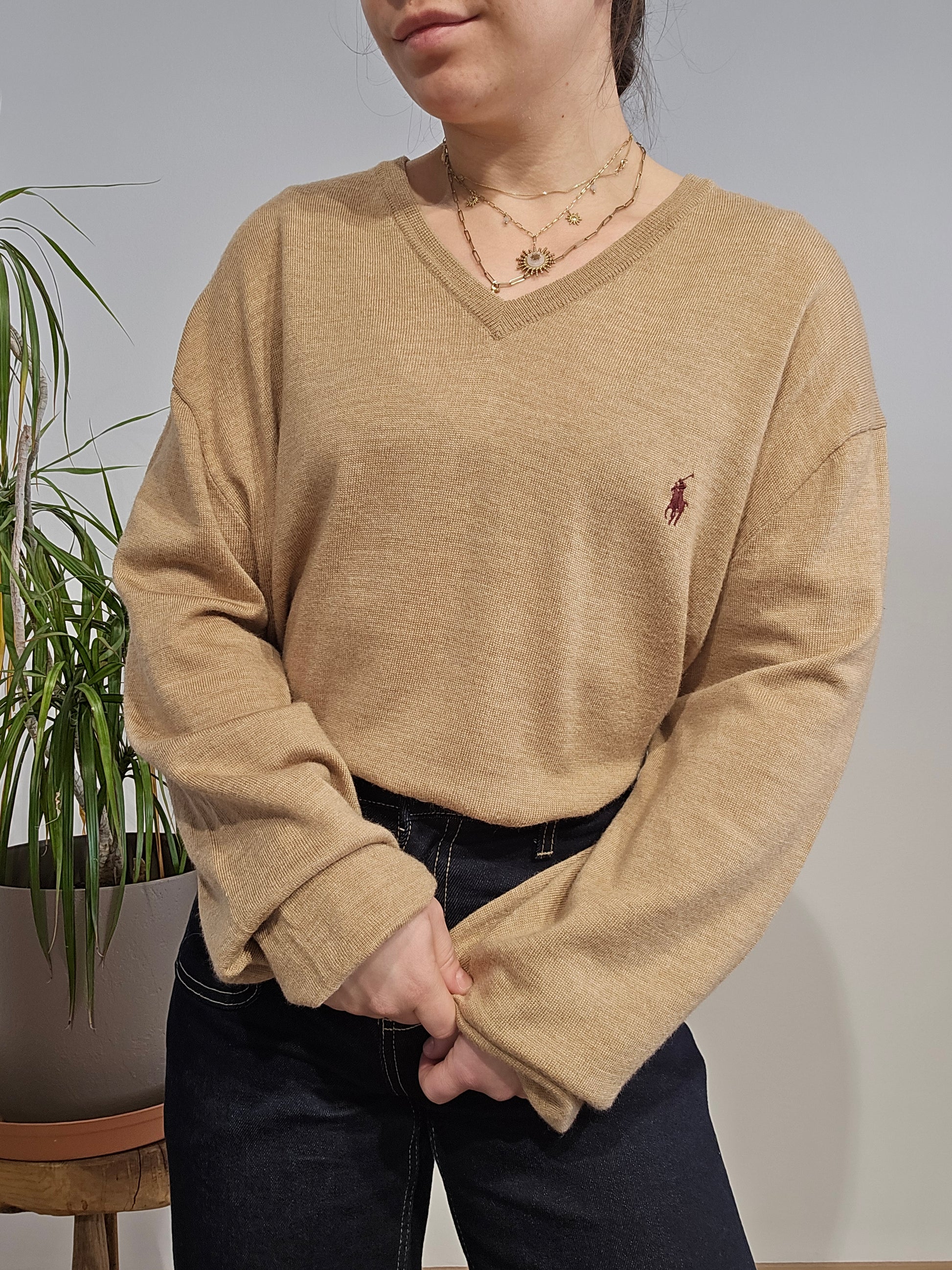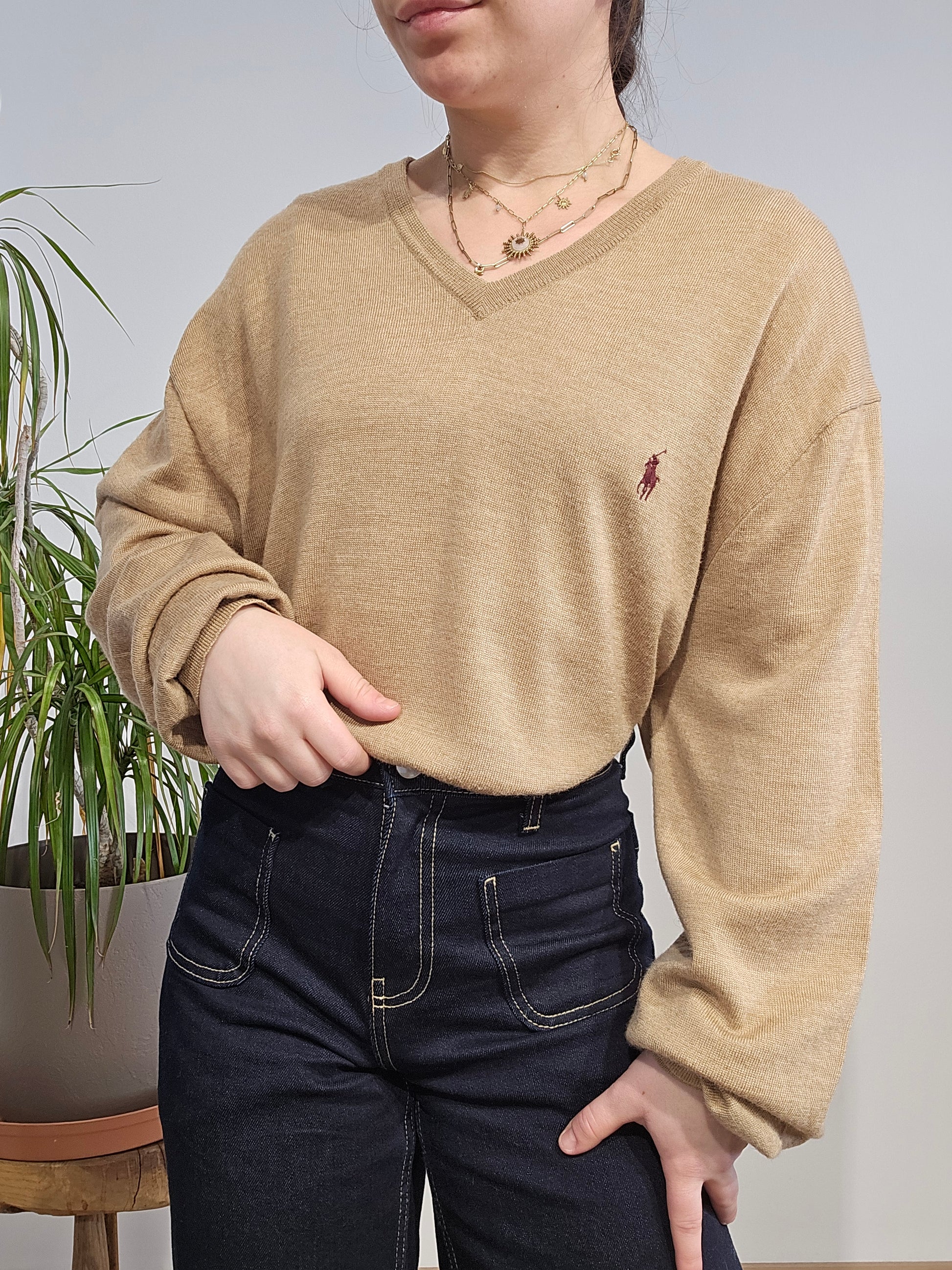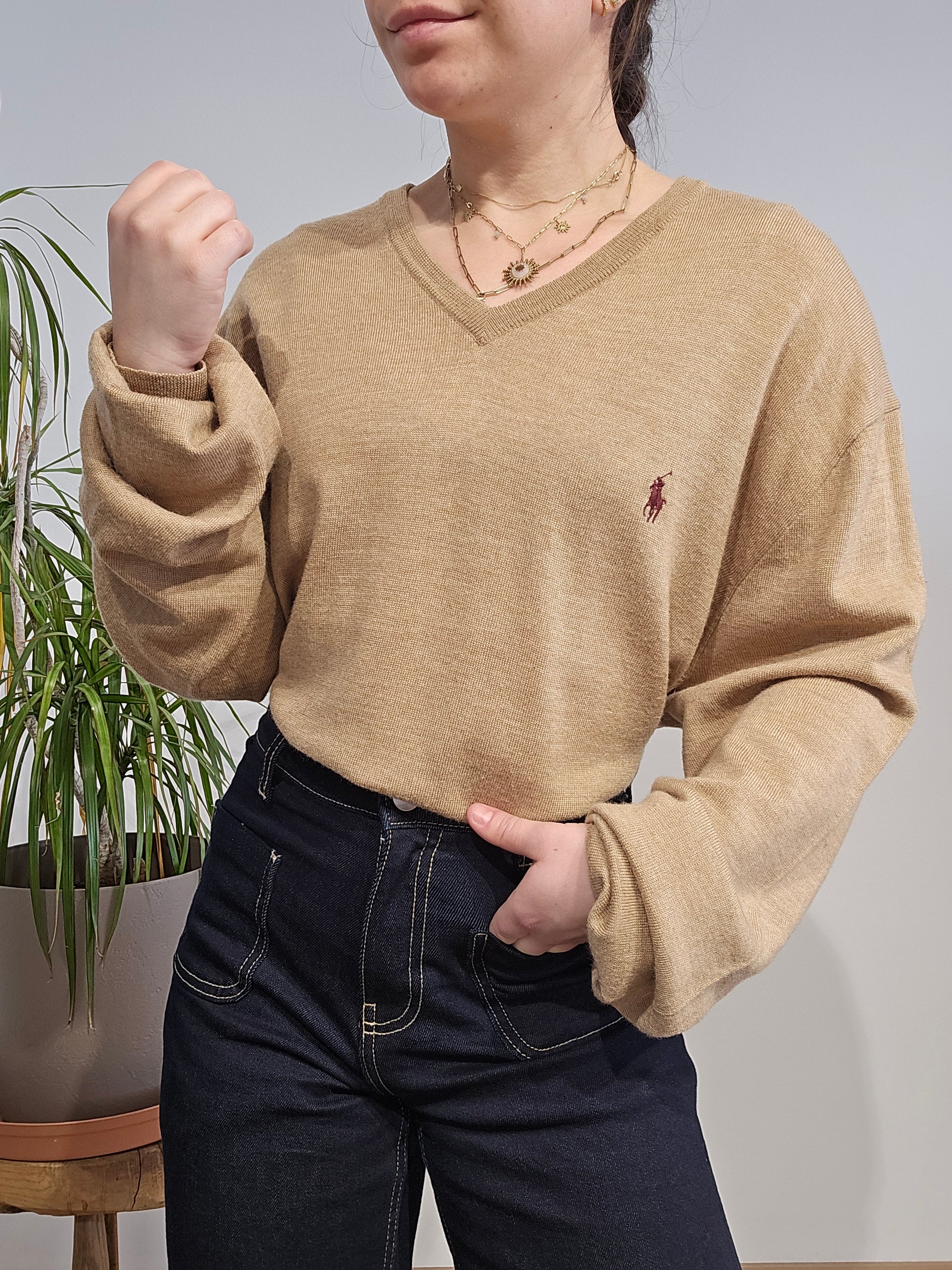 Article : Pull léger col V marron clair, logo brodé violet prune