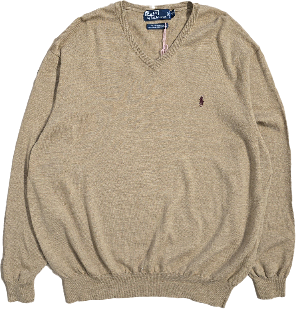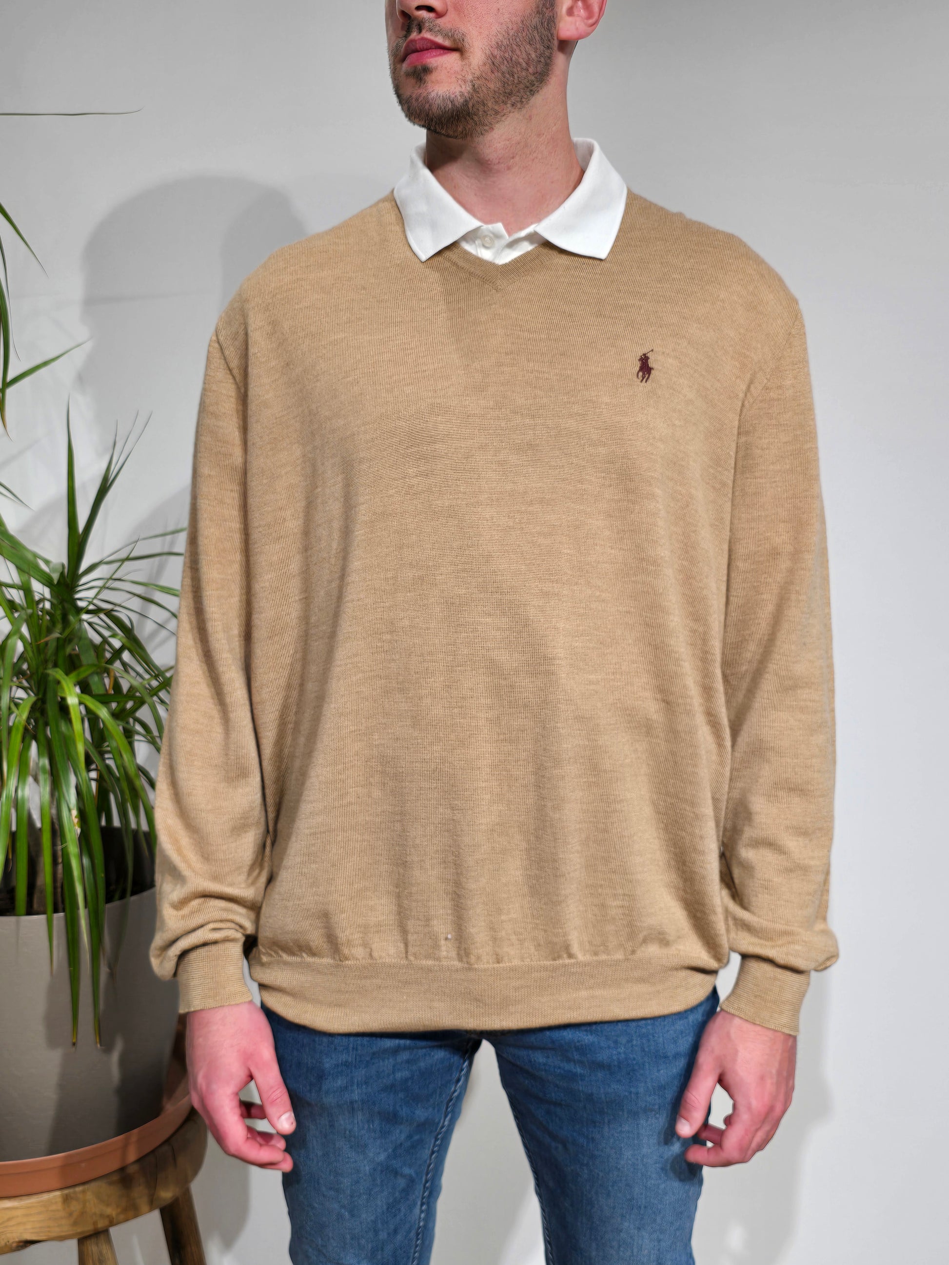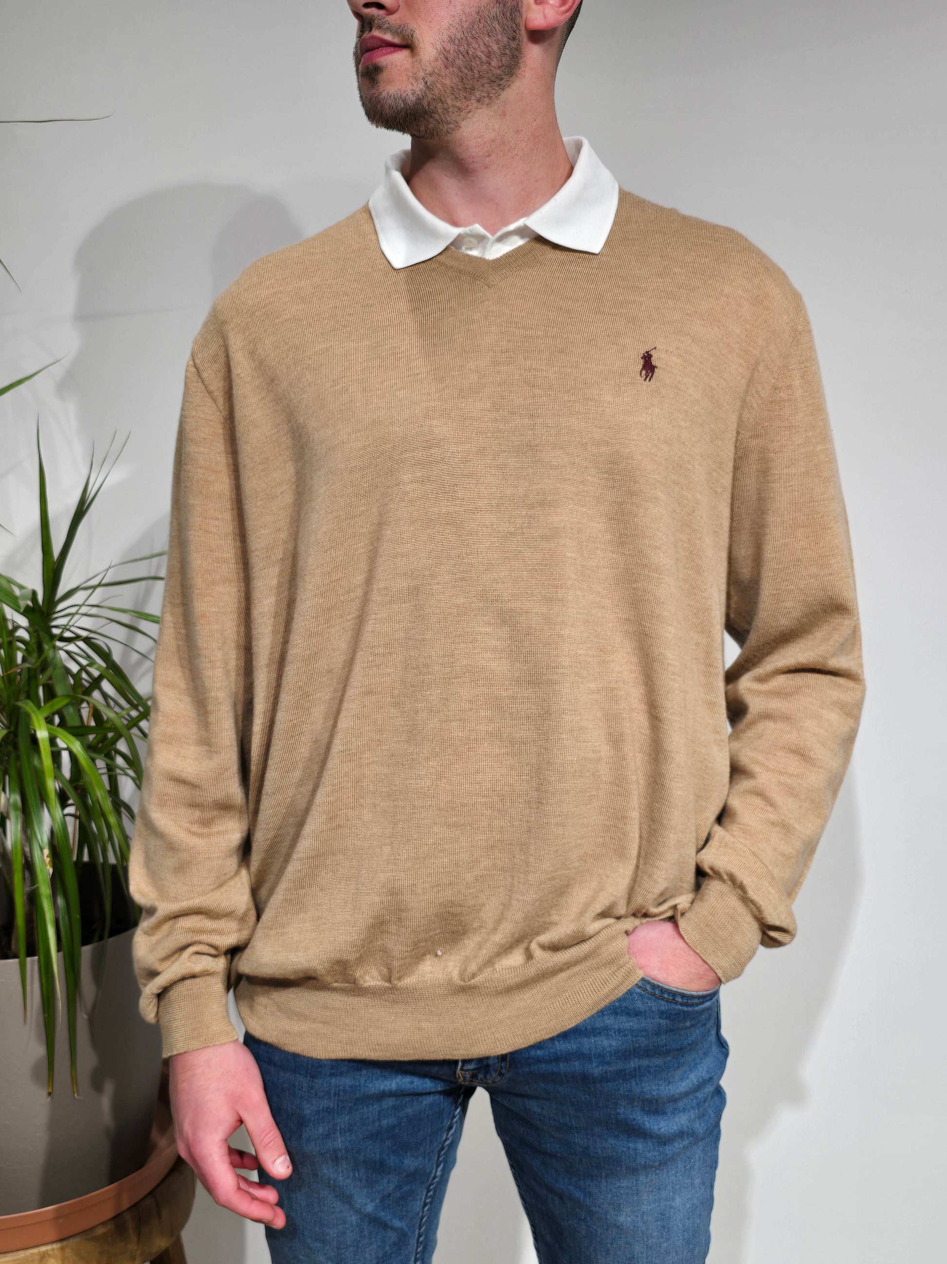 Article : Pull léger col V marron clair, logo brodé violet prune