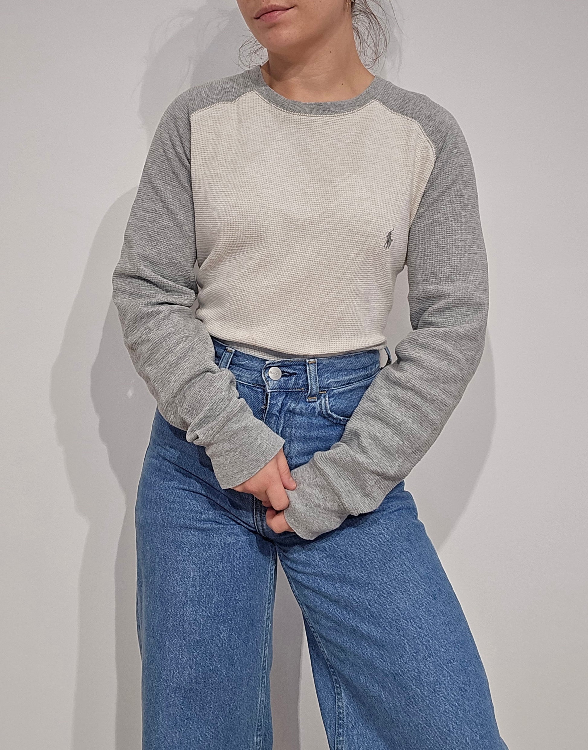 Article : pull léger en maille abeille gris et blanc, logo brodé gris