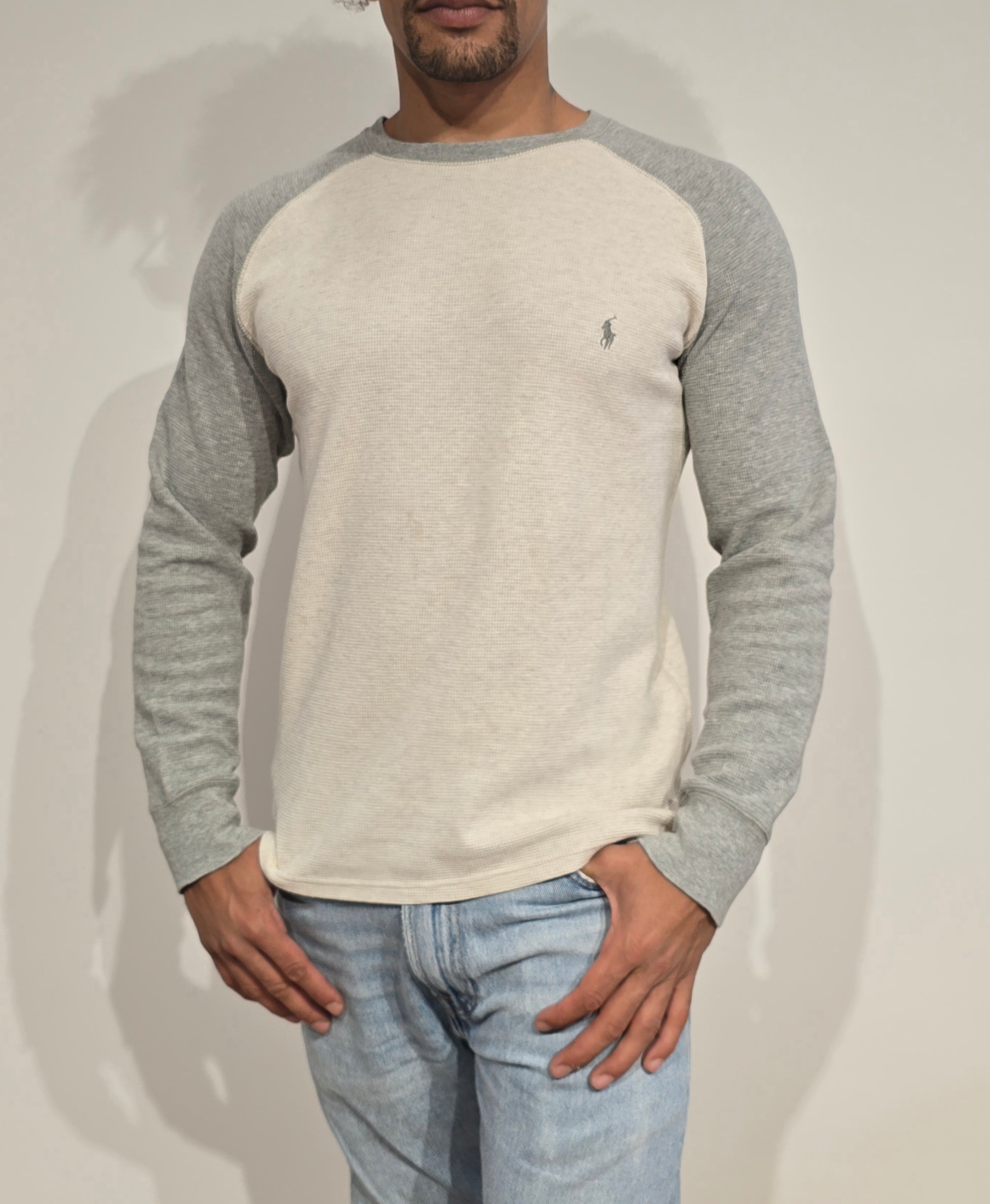 Article : pull léger en maille abeille gris et blanc, logo brodé gris