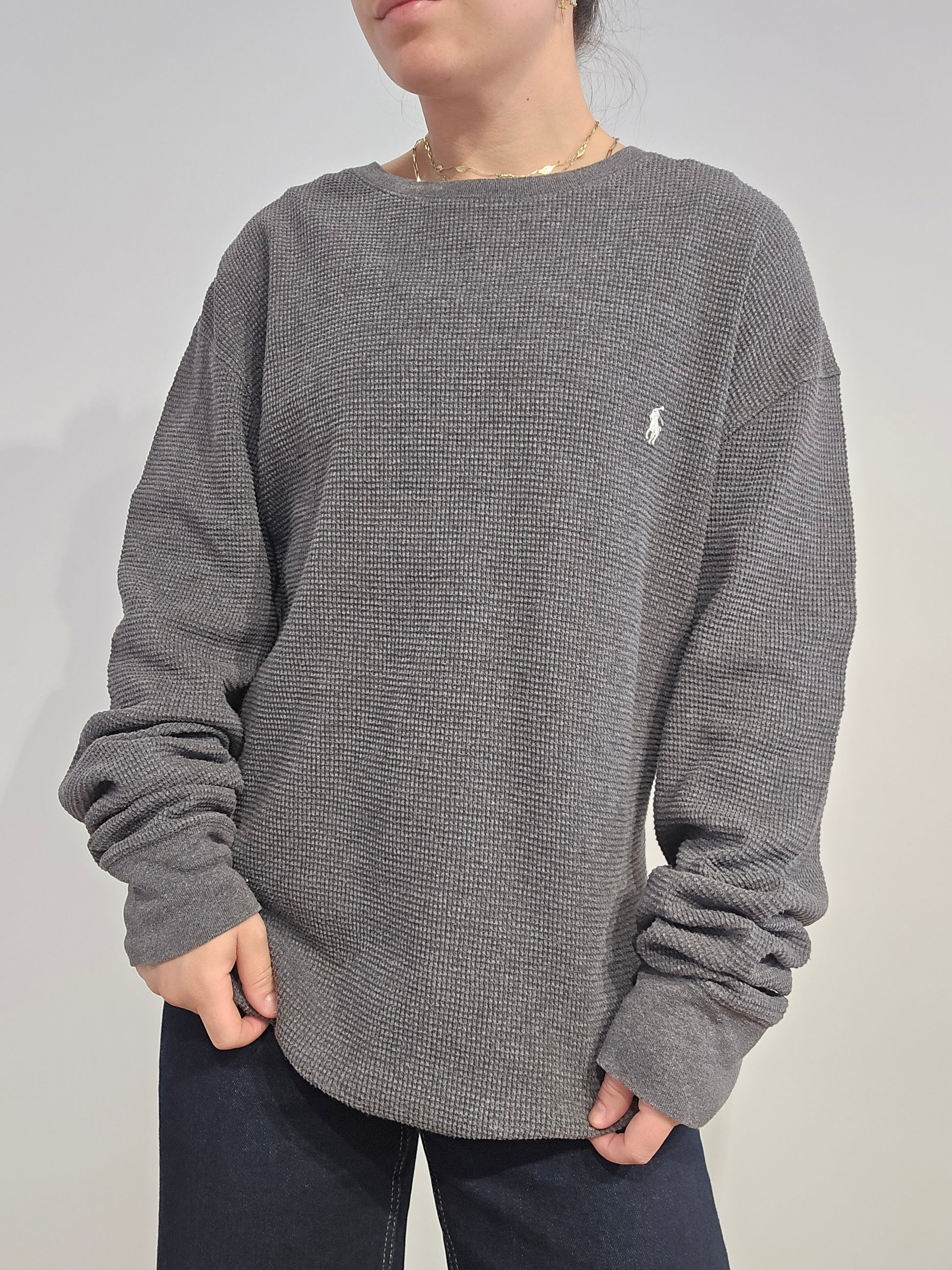 Article : pull léger en maille abeille gris, logo brodé blanc
