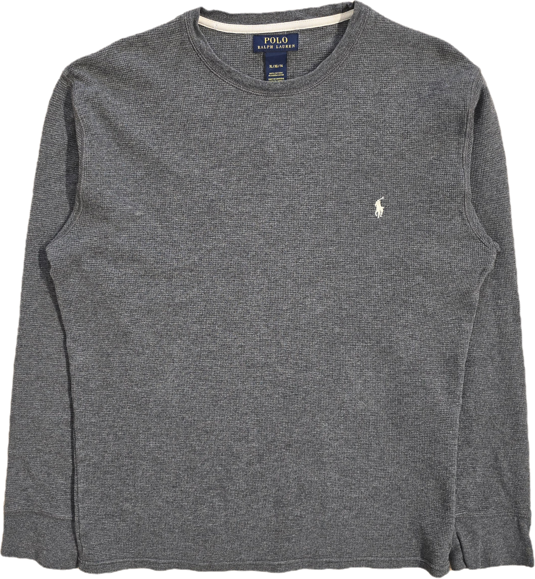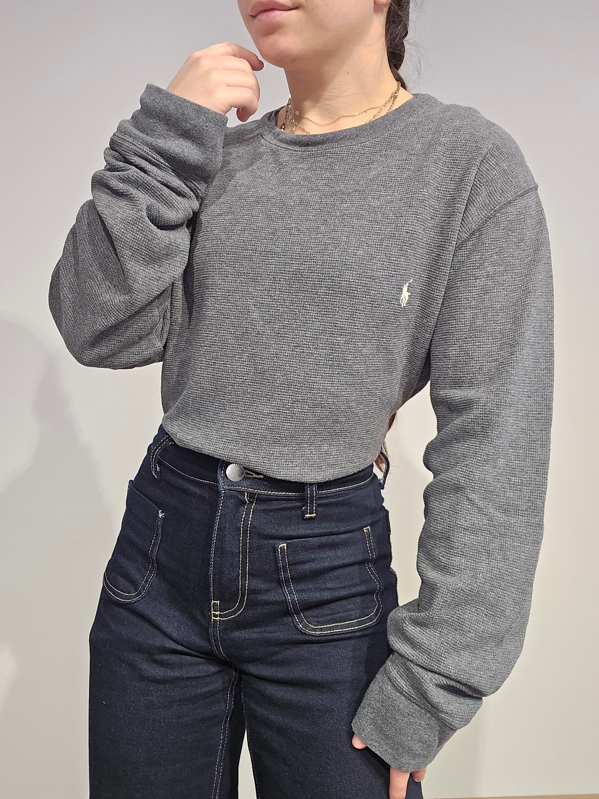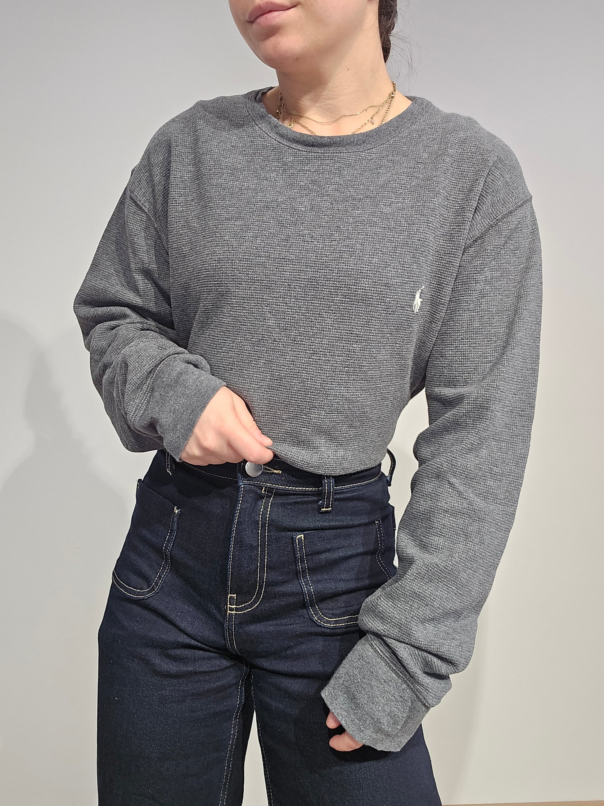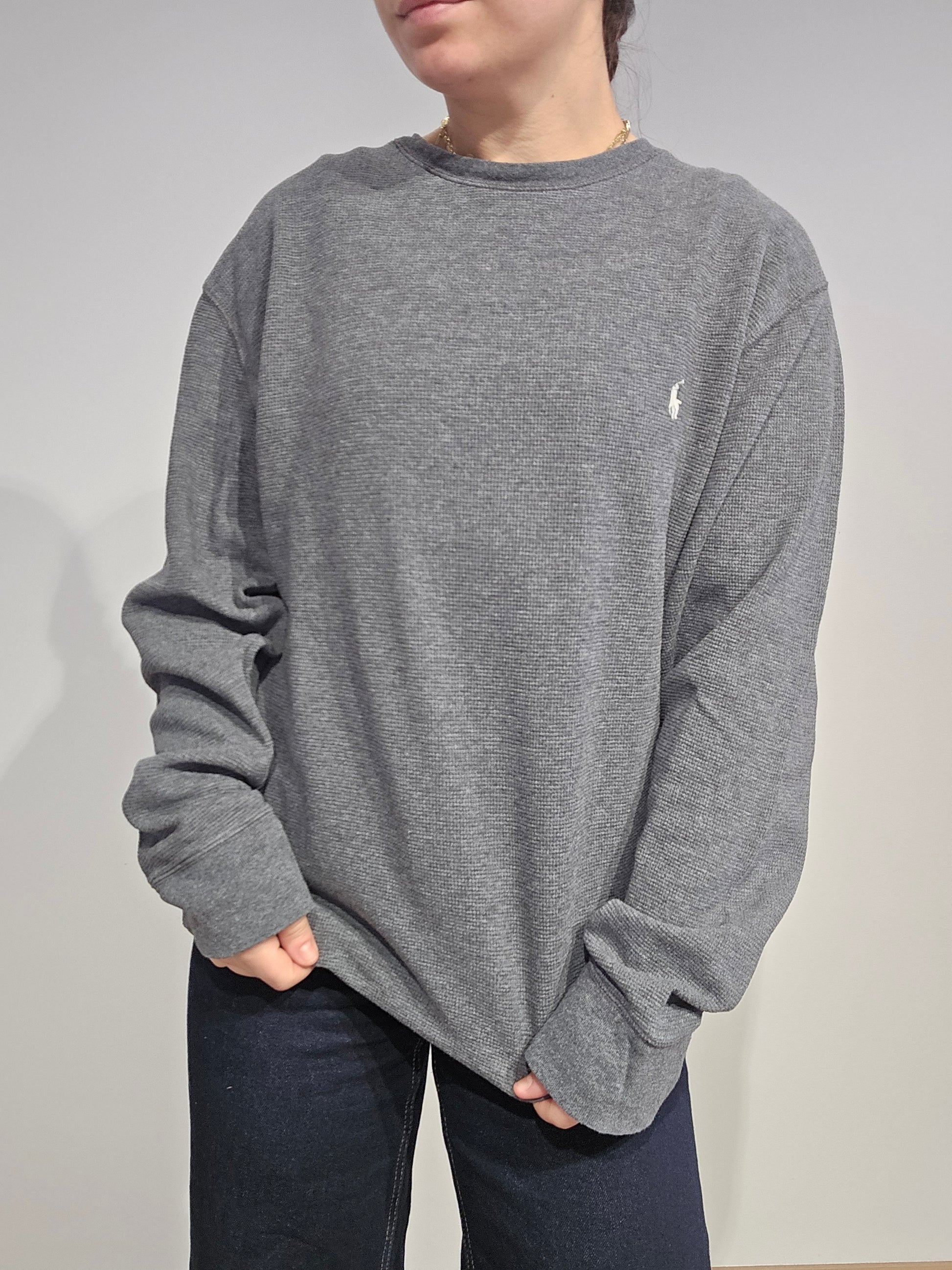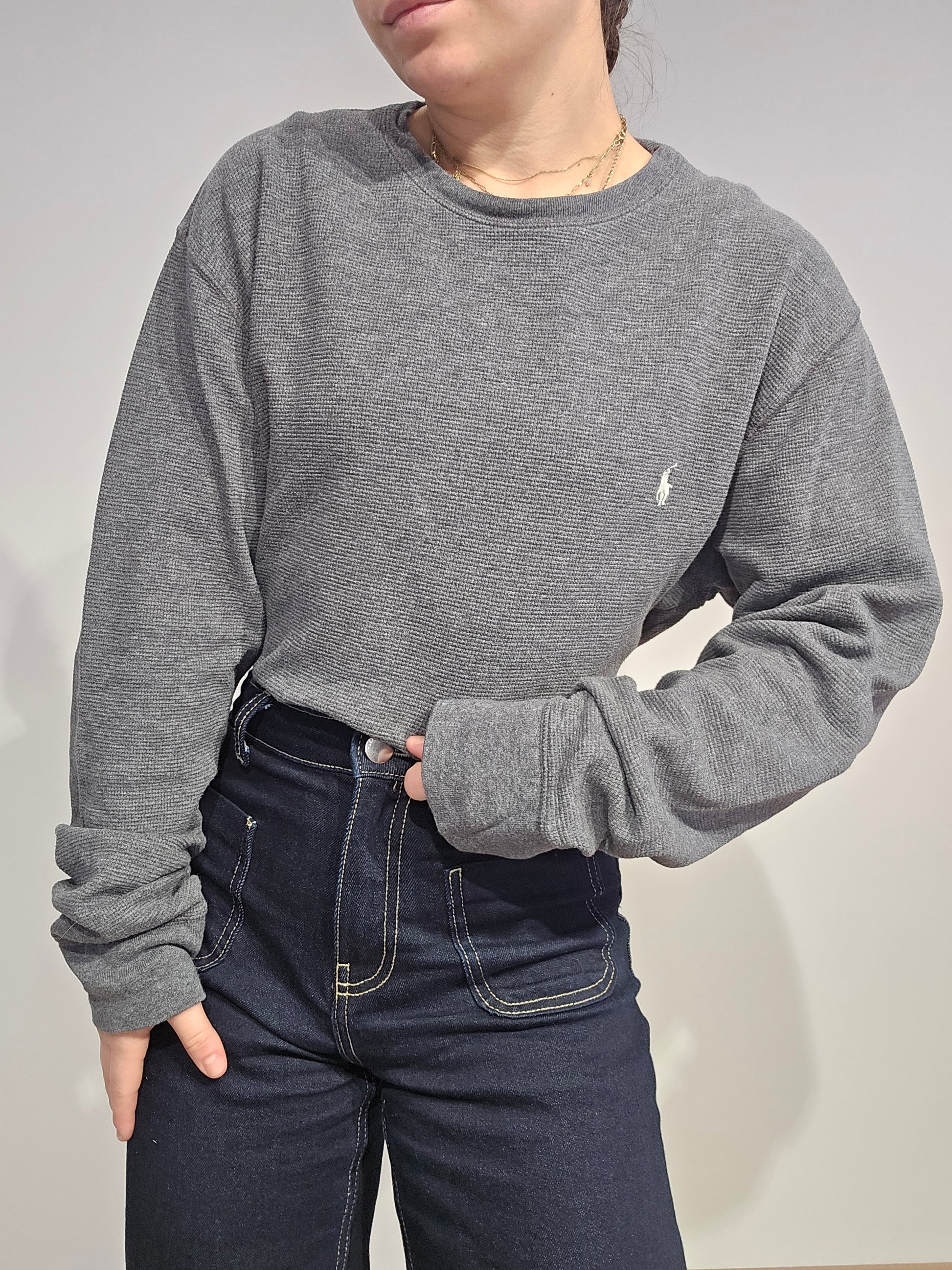 Article : pull léger en maille abeille gris, logo brodé rouge "polo"