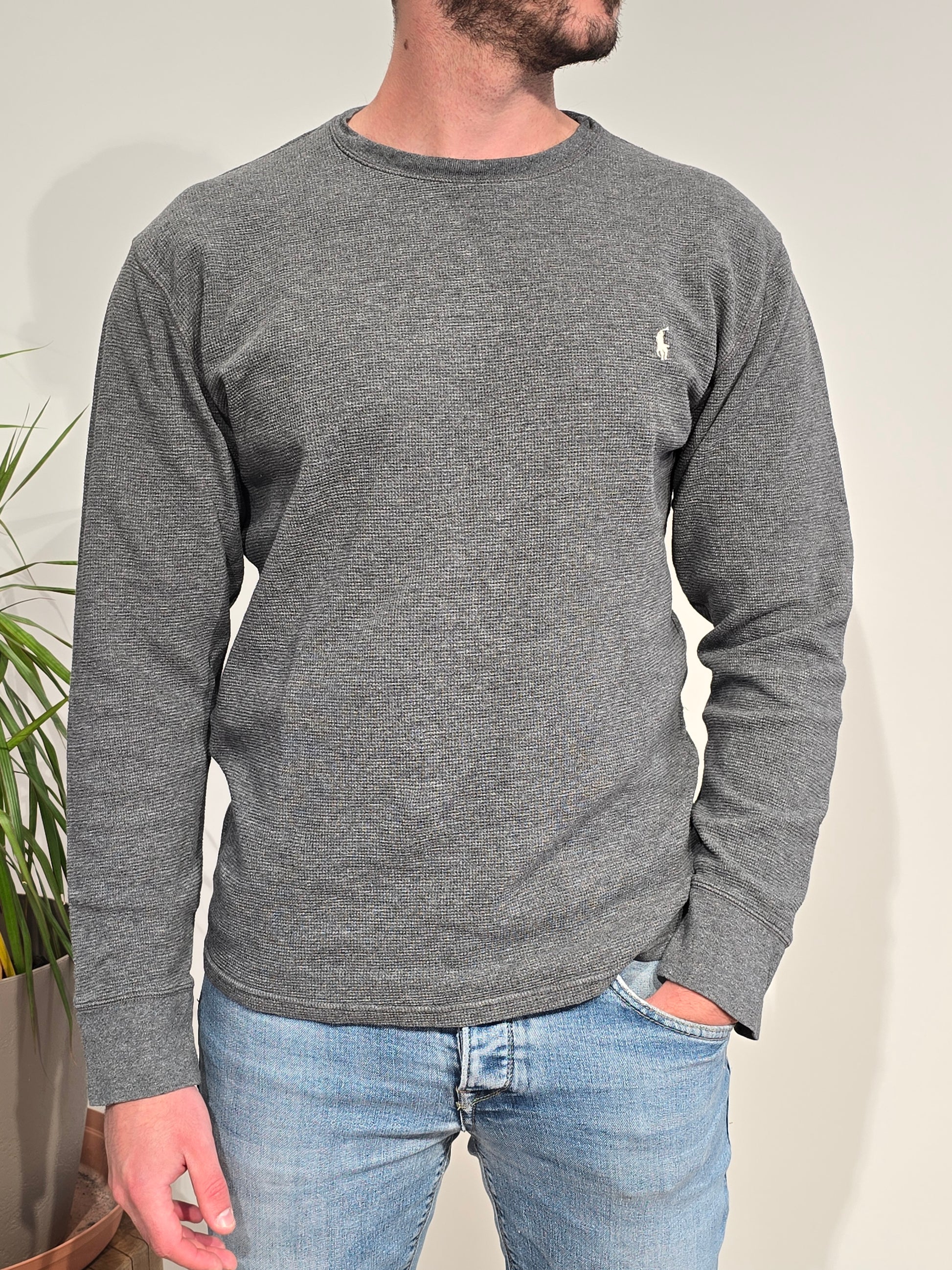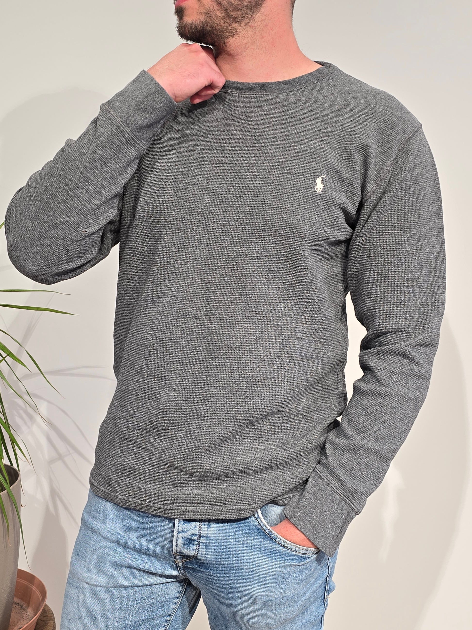 Article : pull léger en maille abeille gris, logo brodé rouge "polo"