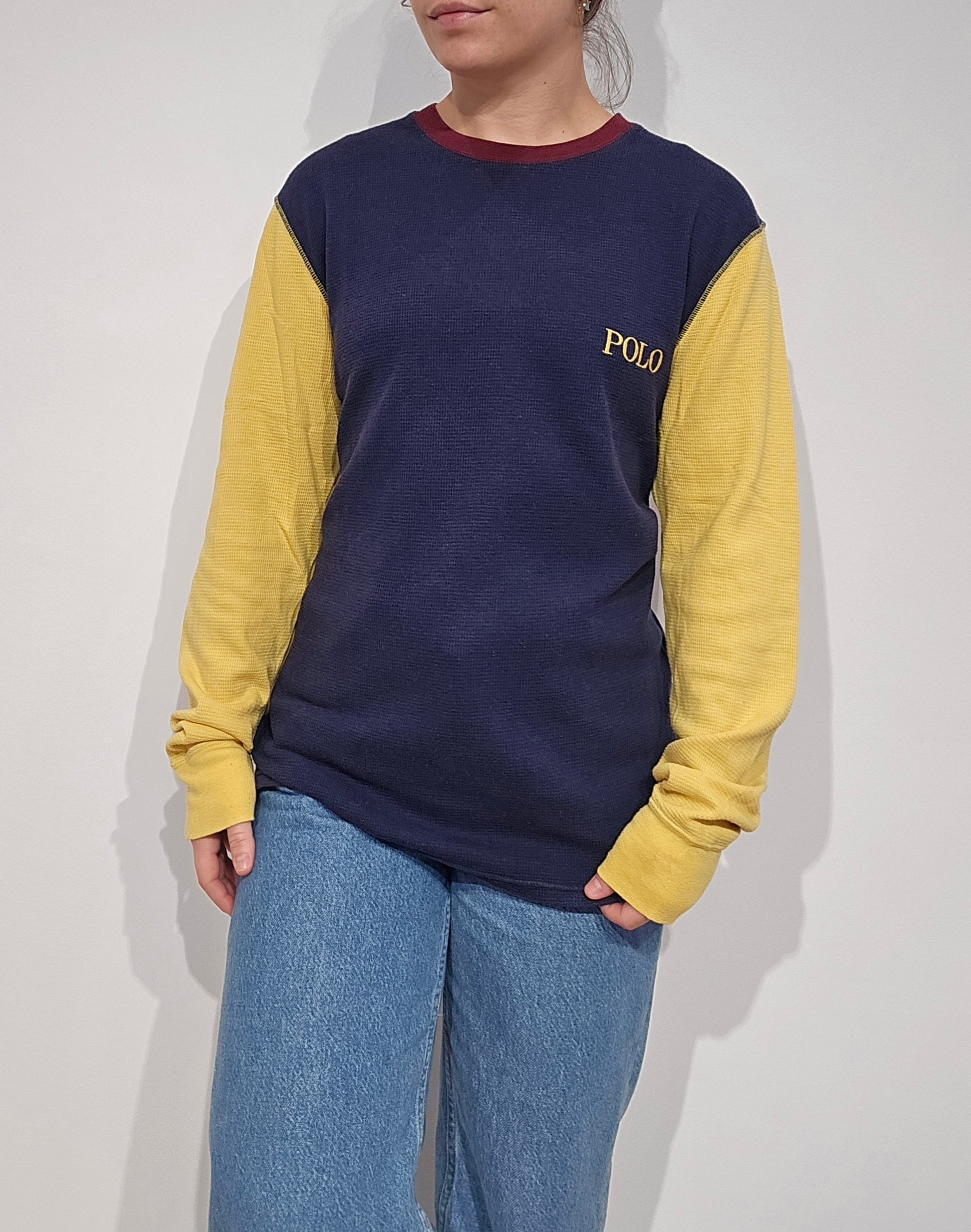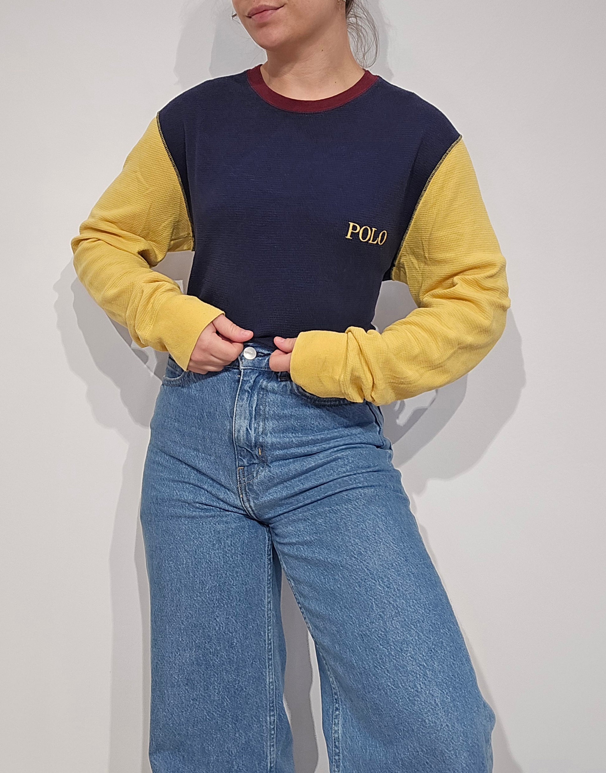 Article : pull léger en en maille abeille marine et manches jaunes, polo brodé