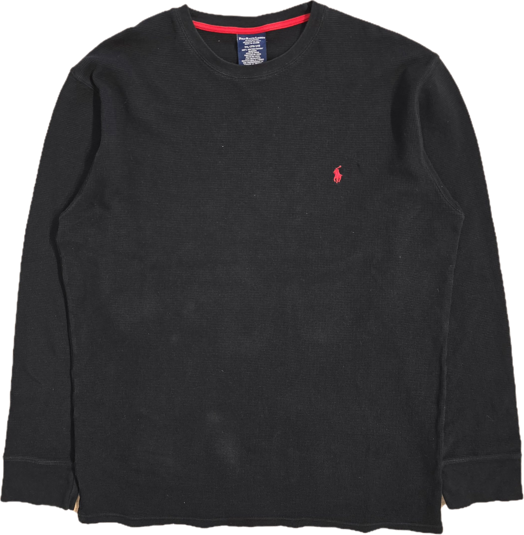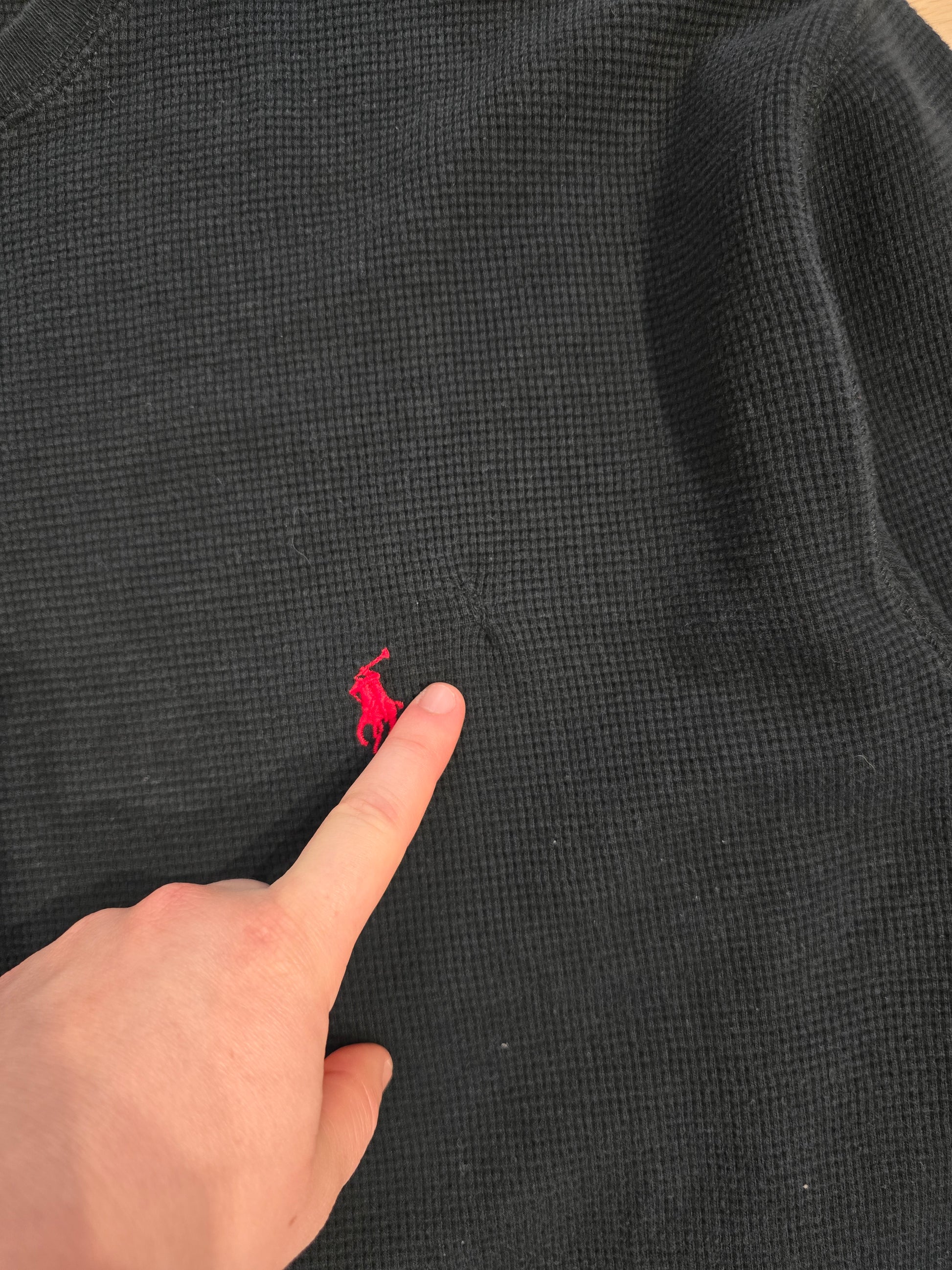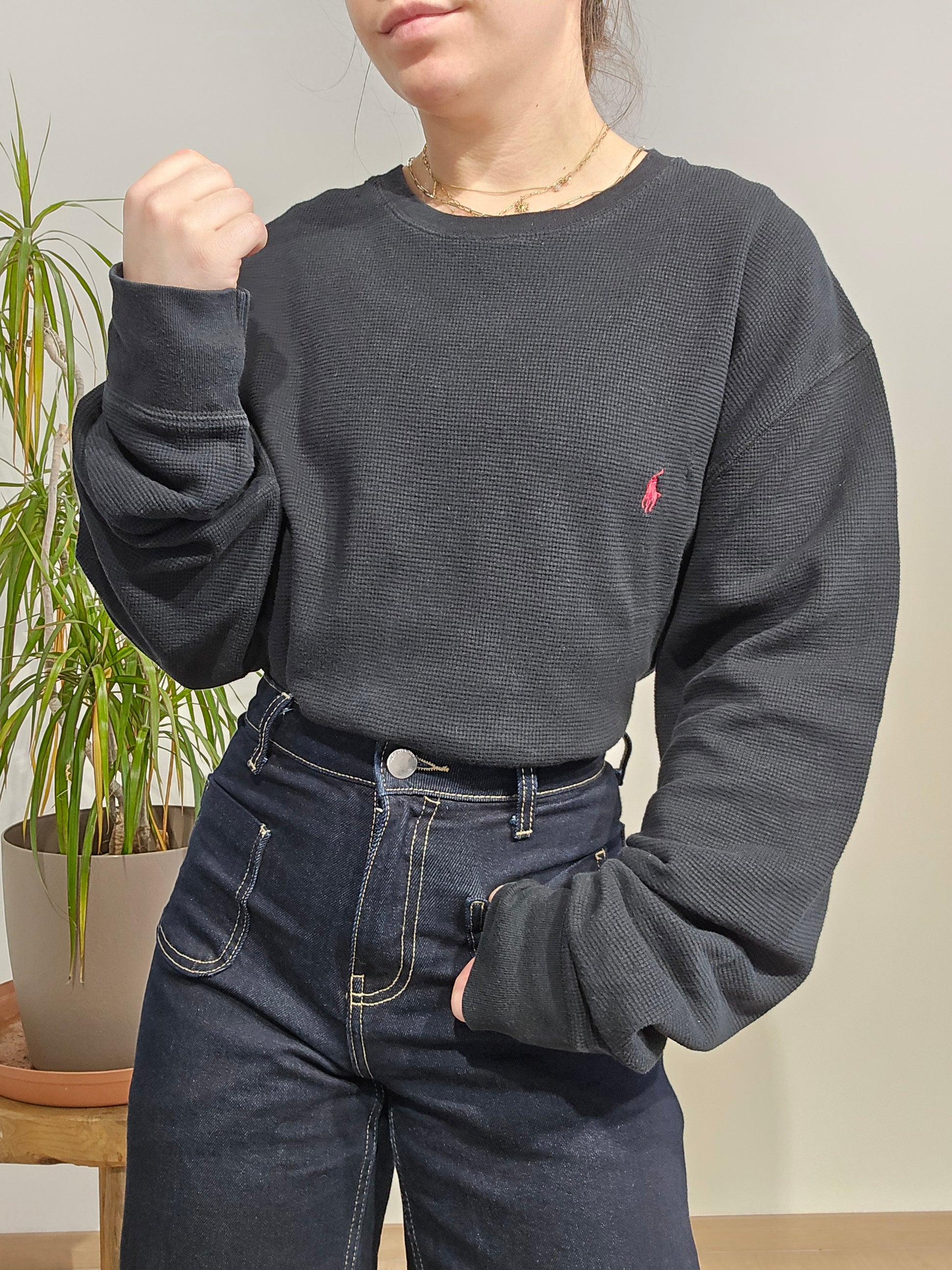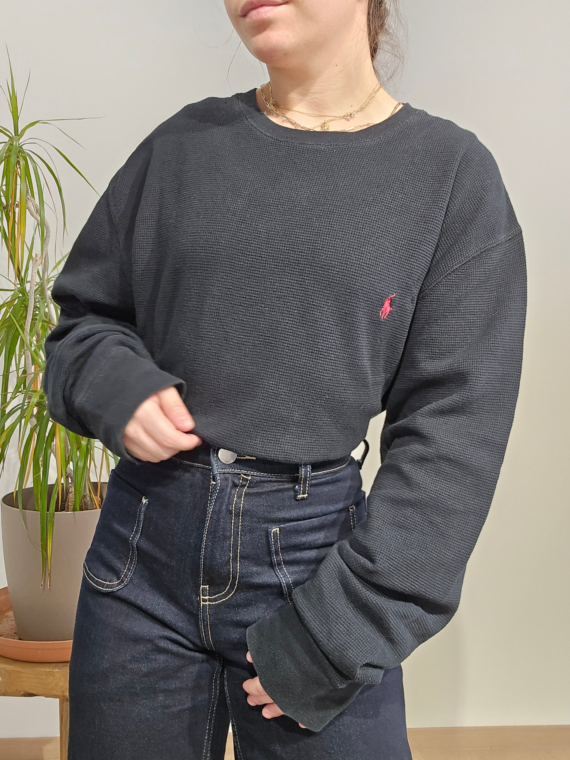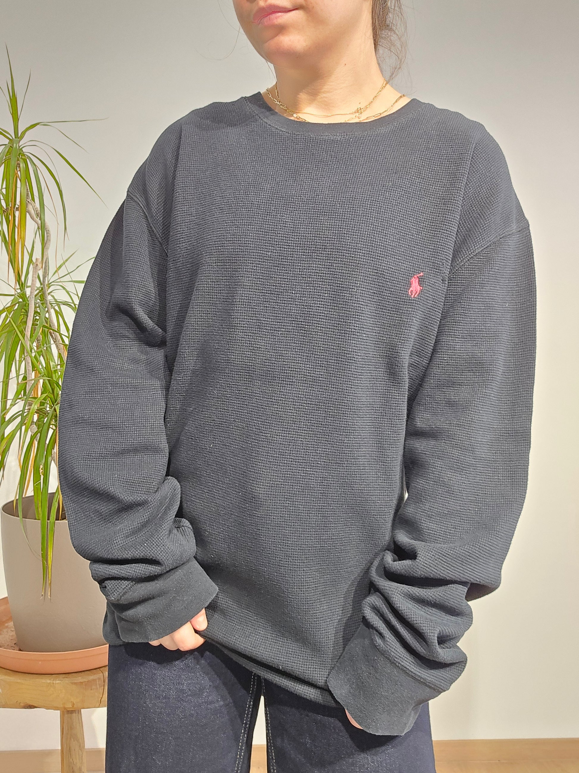 Article : pull leger noir en maille abeille, logo brodé rouge