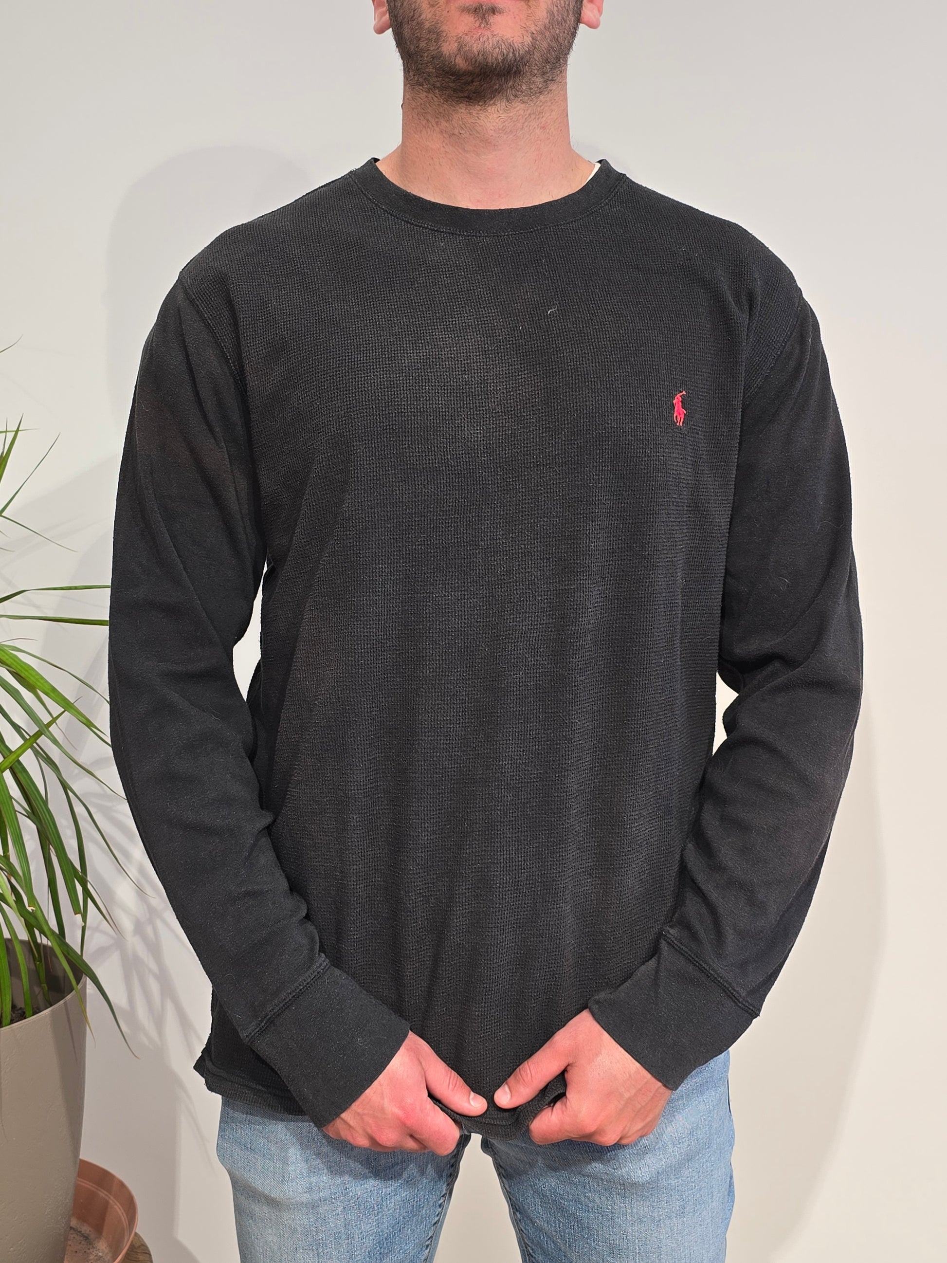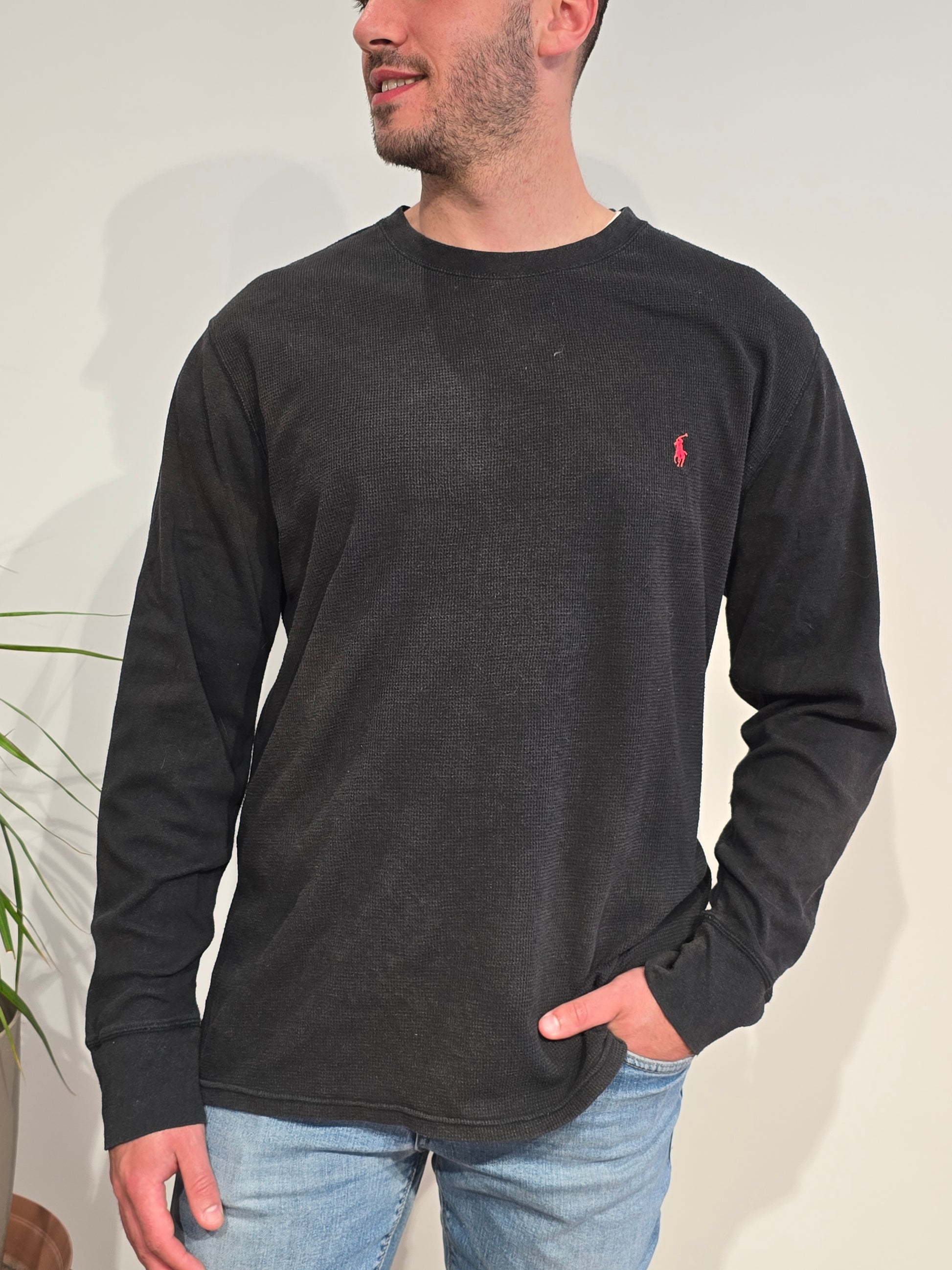 Article : pull léger en maille abeille noir, logo brodé rouge