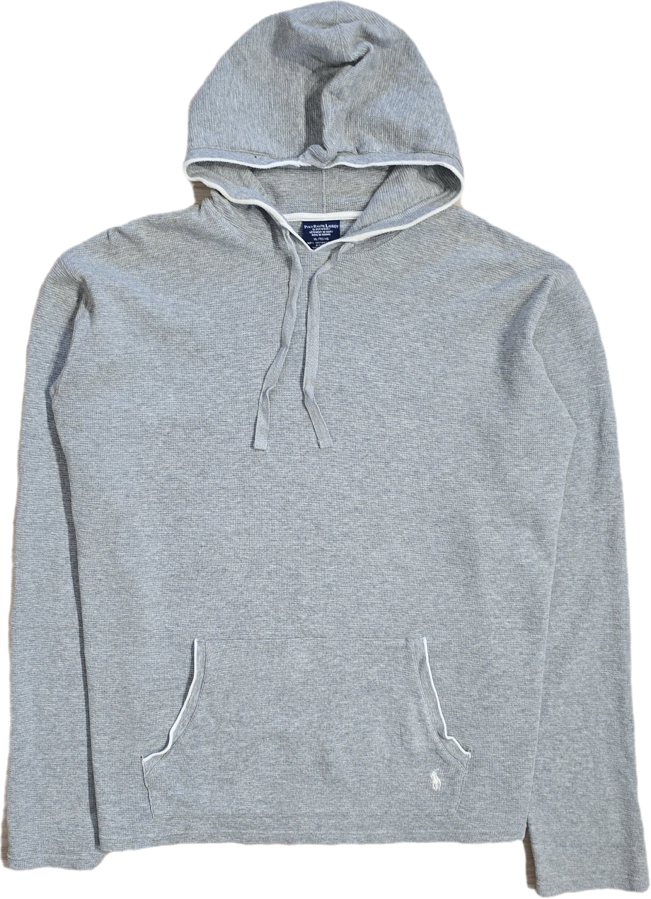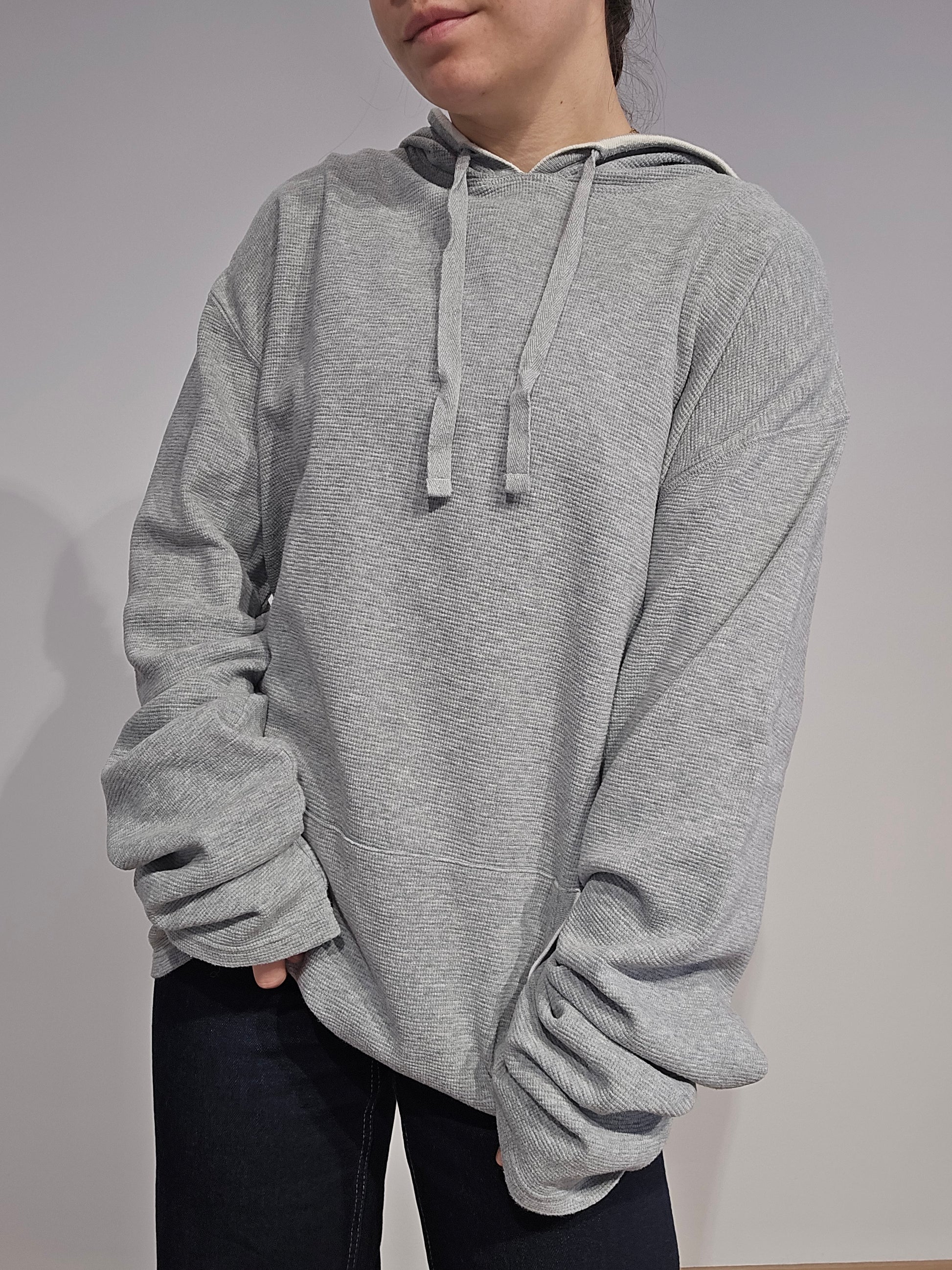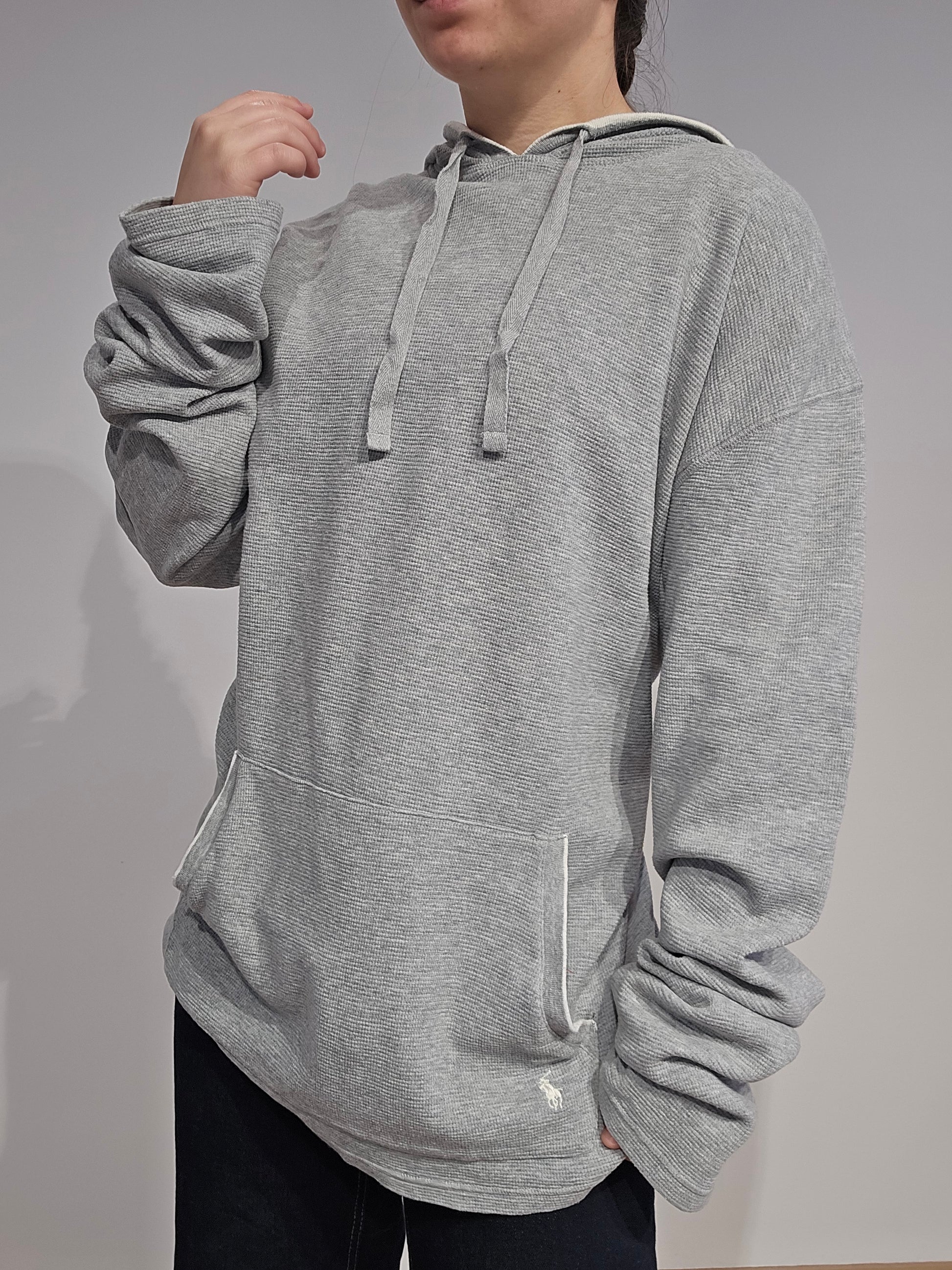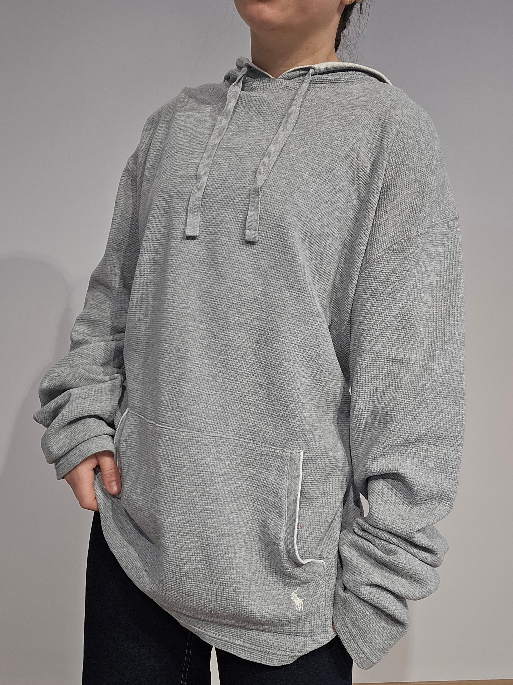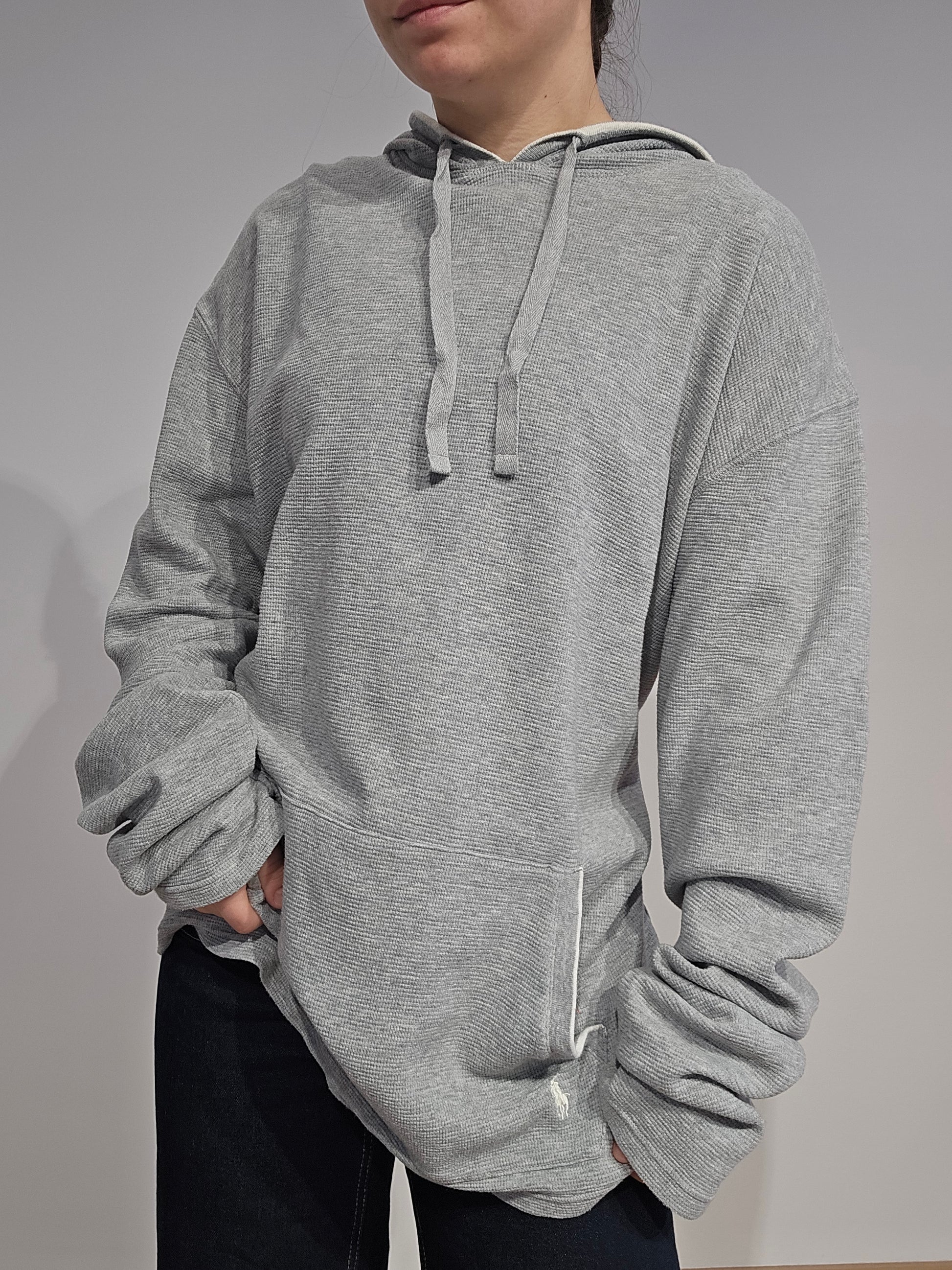 Article : sweat à capucge léger en maille abeille gris, logo brodé rouge blanc