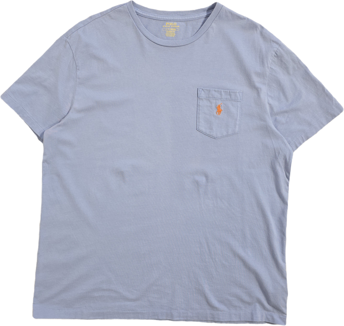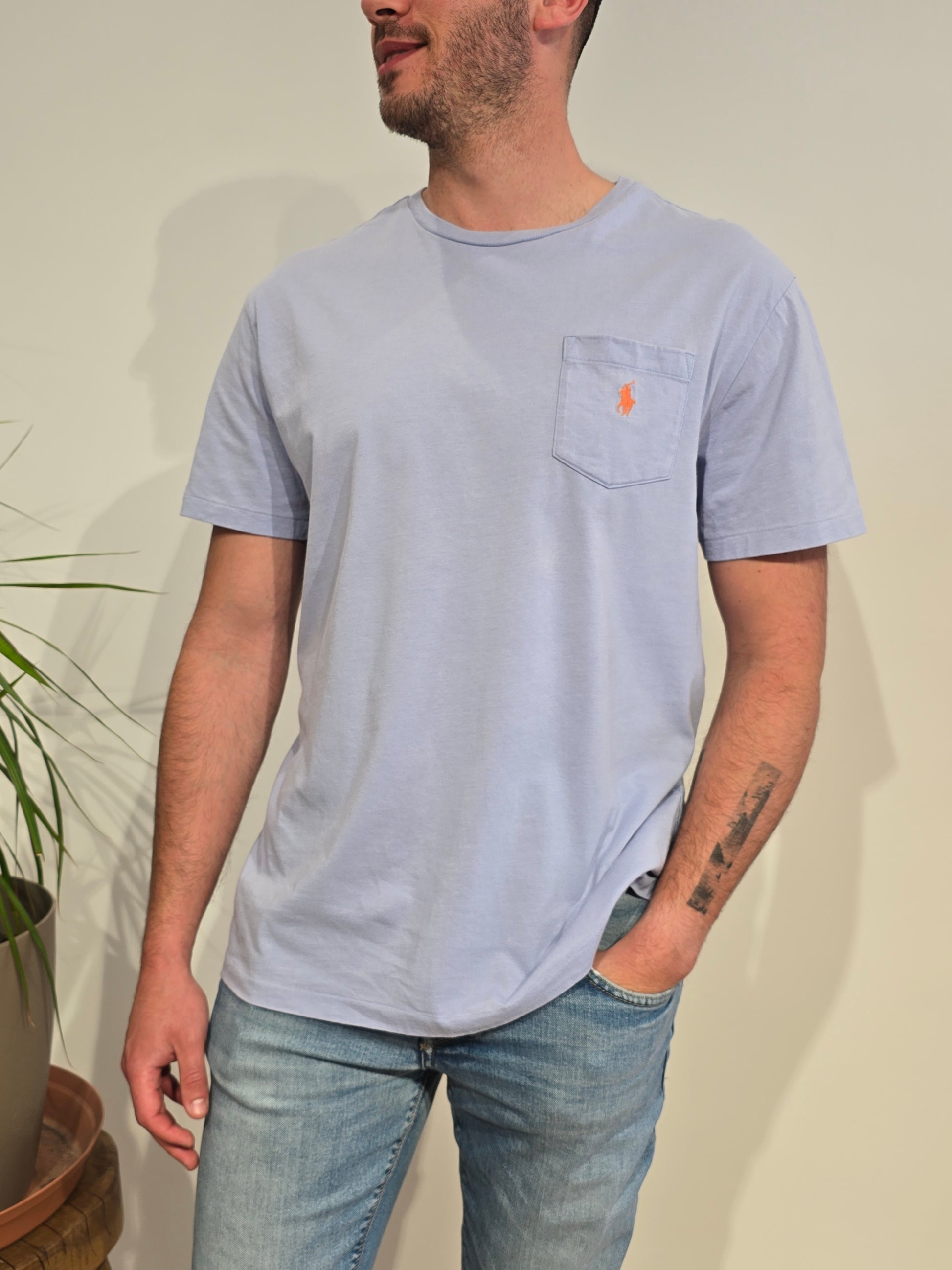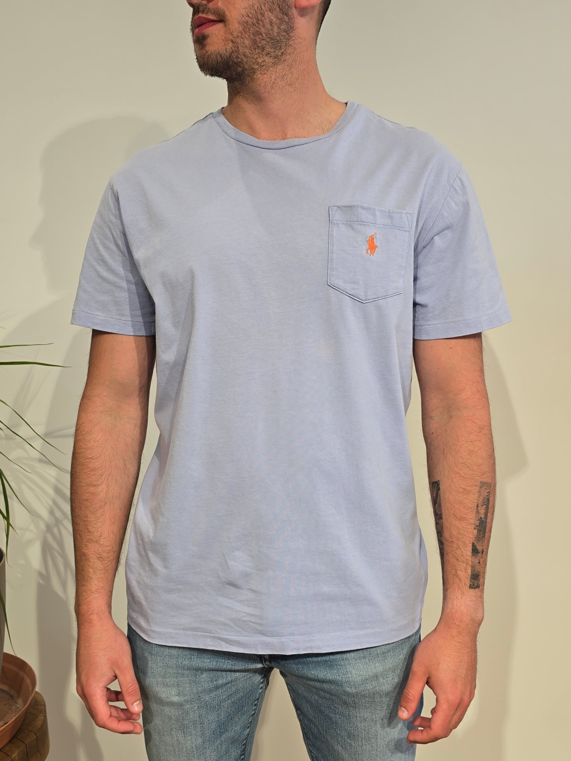 Article : Tee-shirt col rond bleu ciel, logo brodé orange
