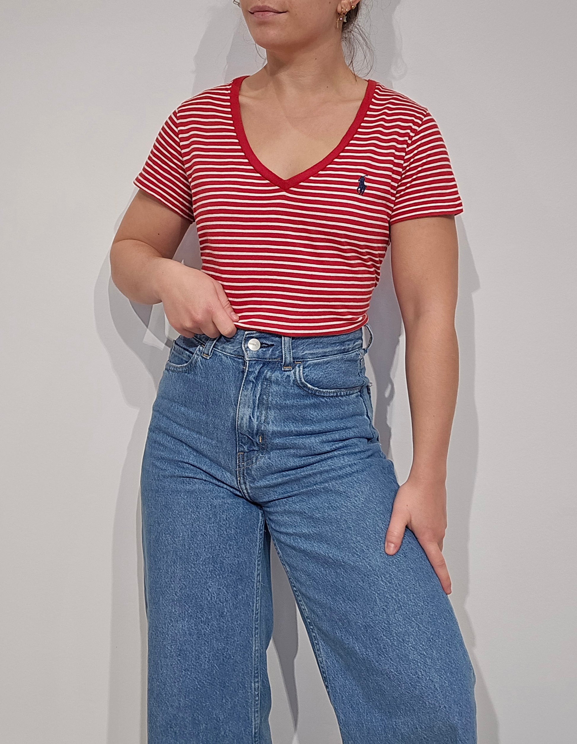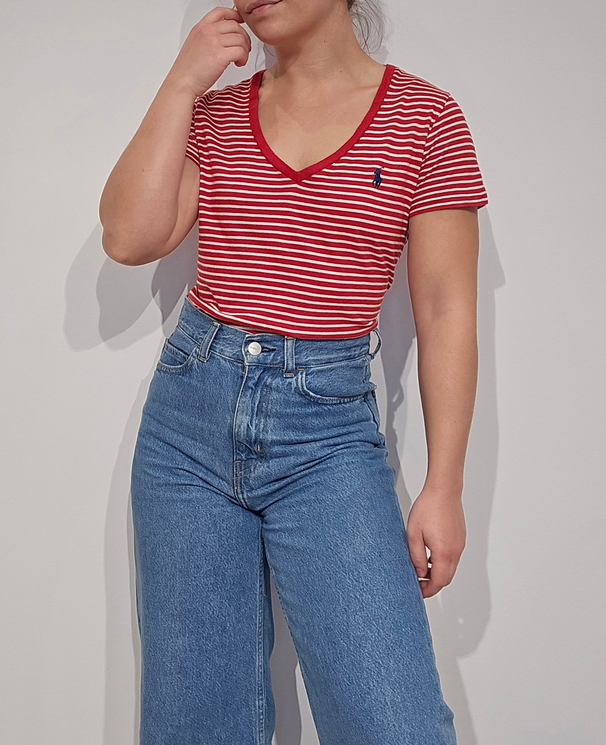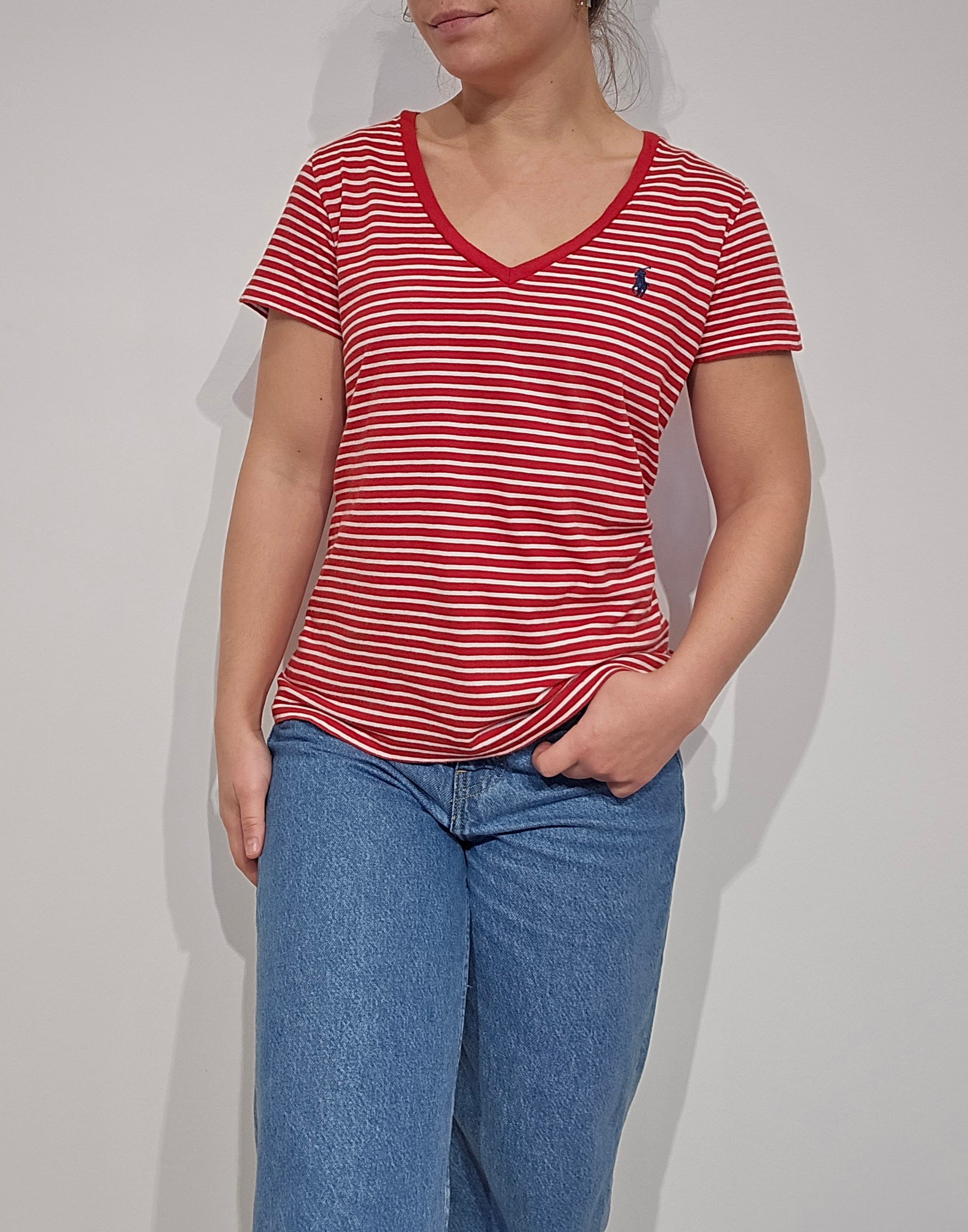 Tee-shirt col V à rayures rouge - S/M