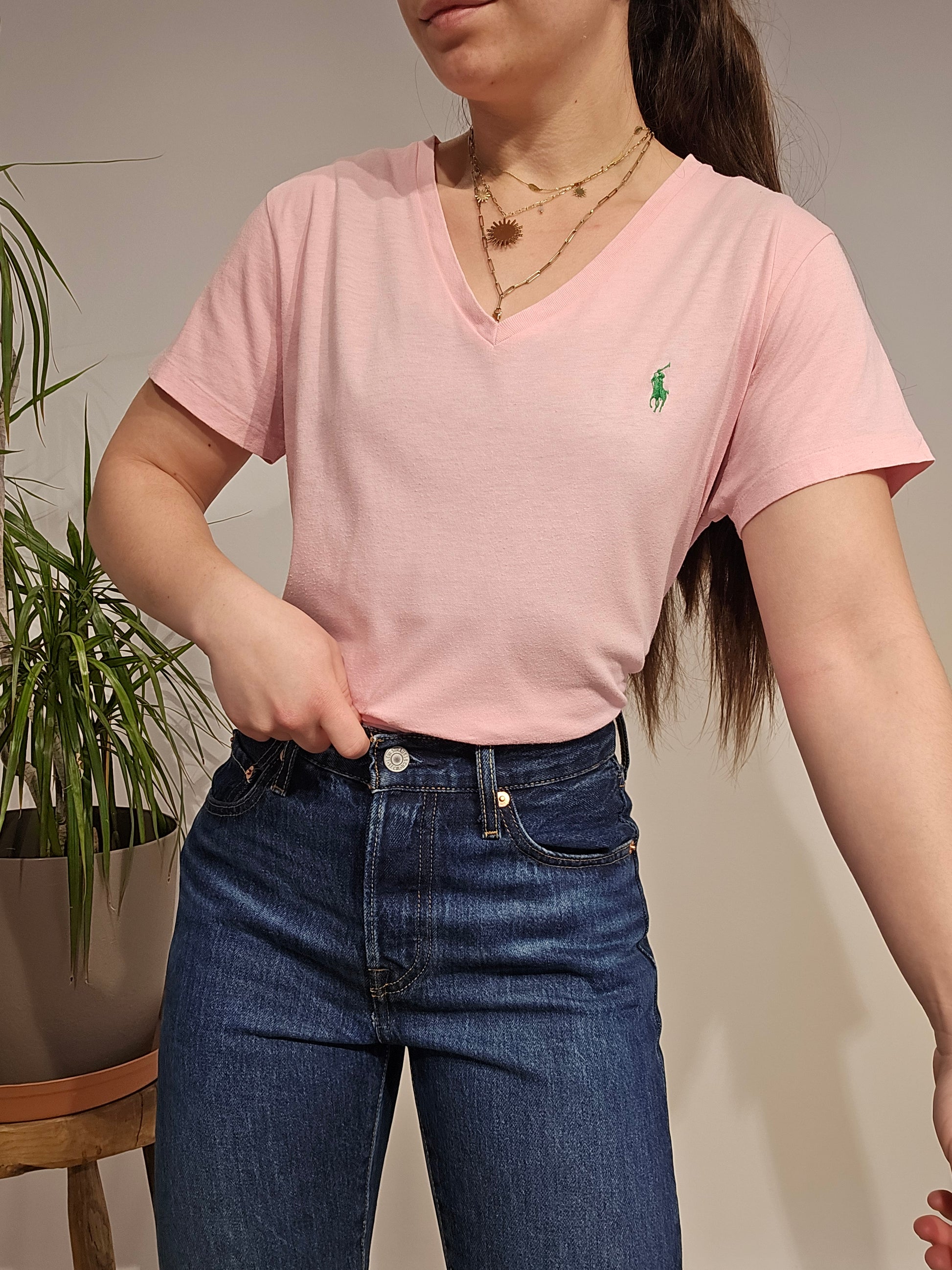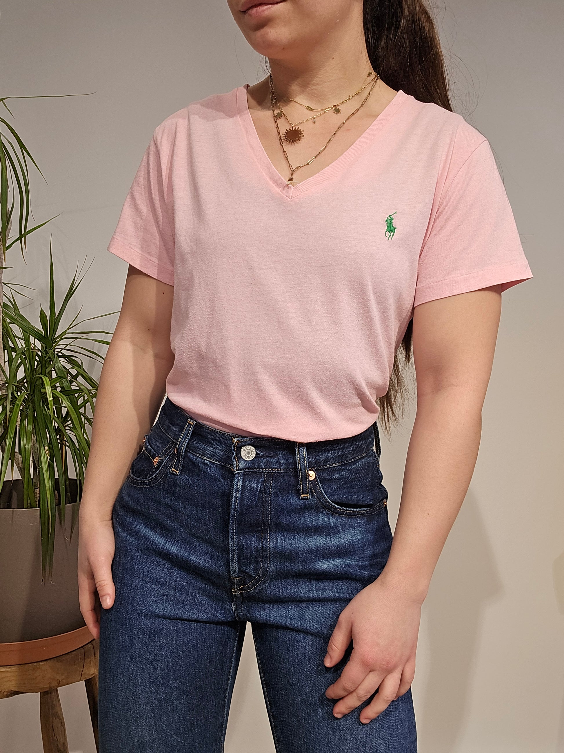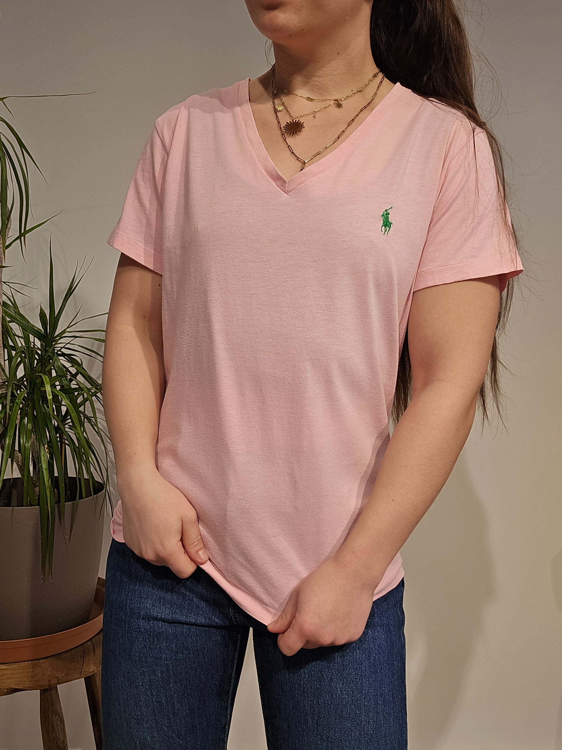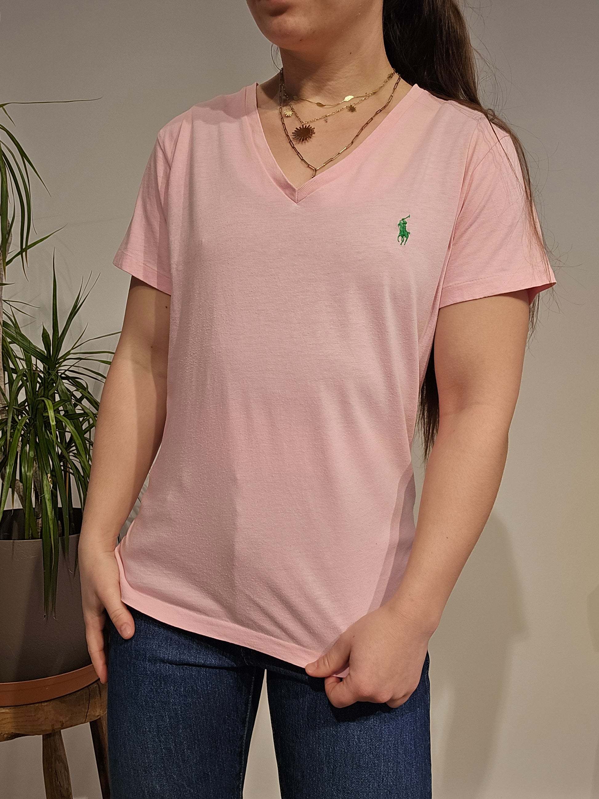 Article : Tee-shirt col V rose clair, logo brodé vert