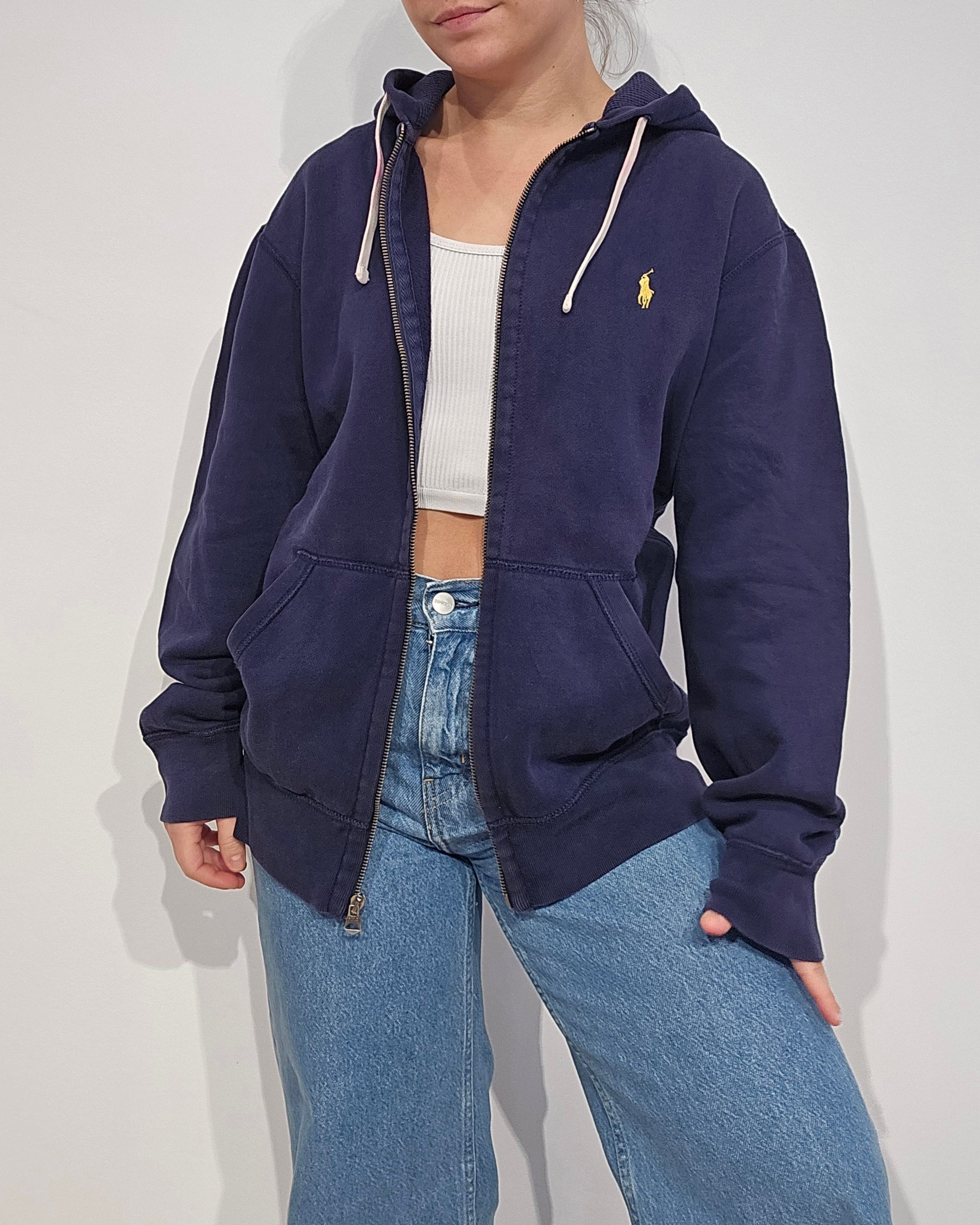 Article : Veste à capuche en coton marine, logo bordé jaune, poches latérales