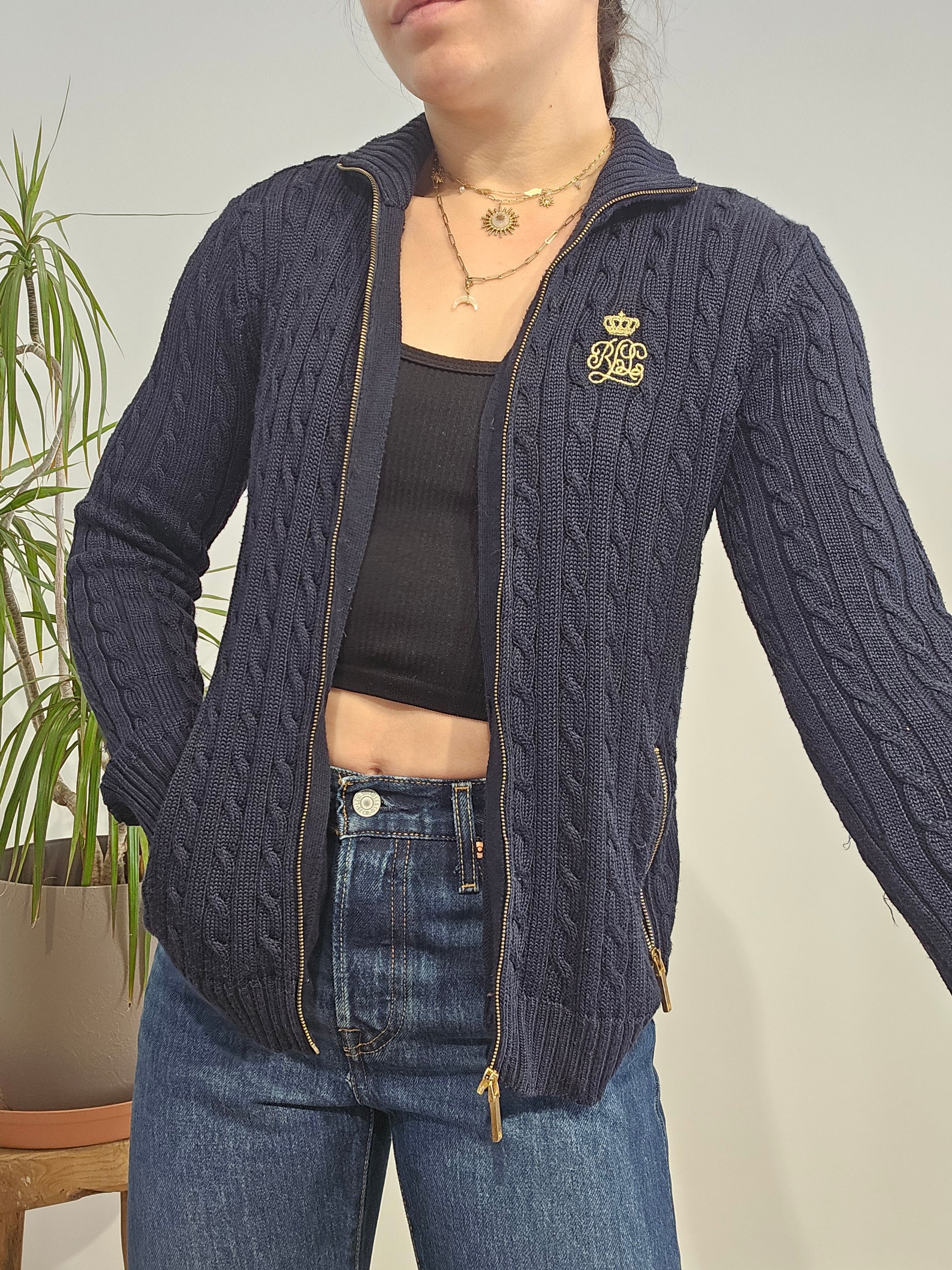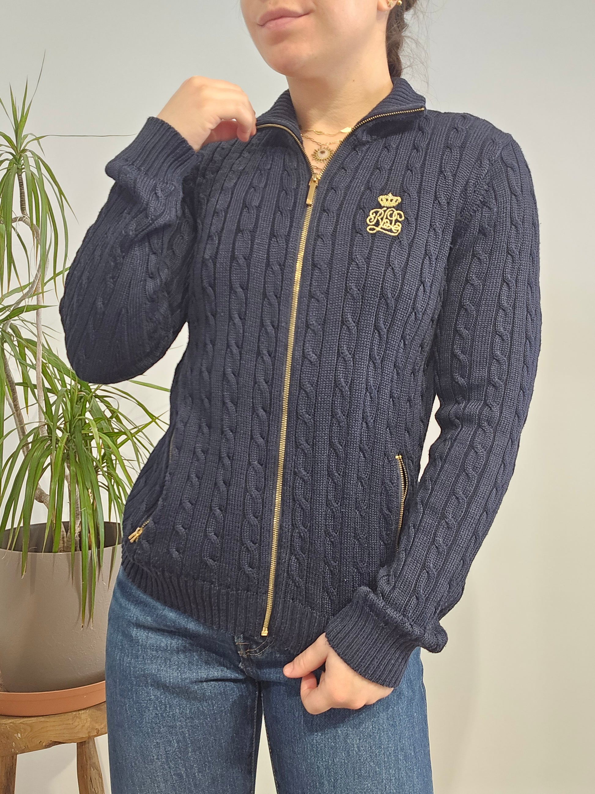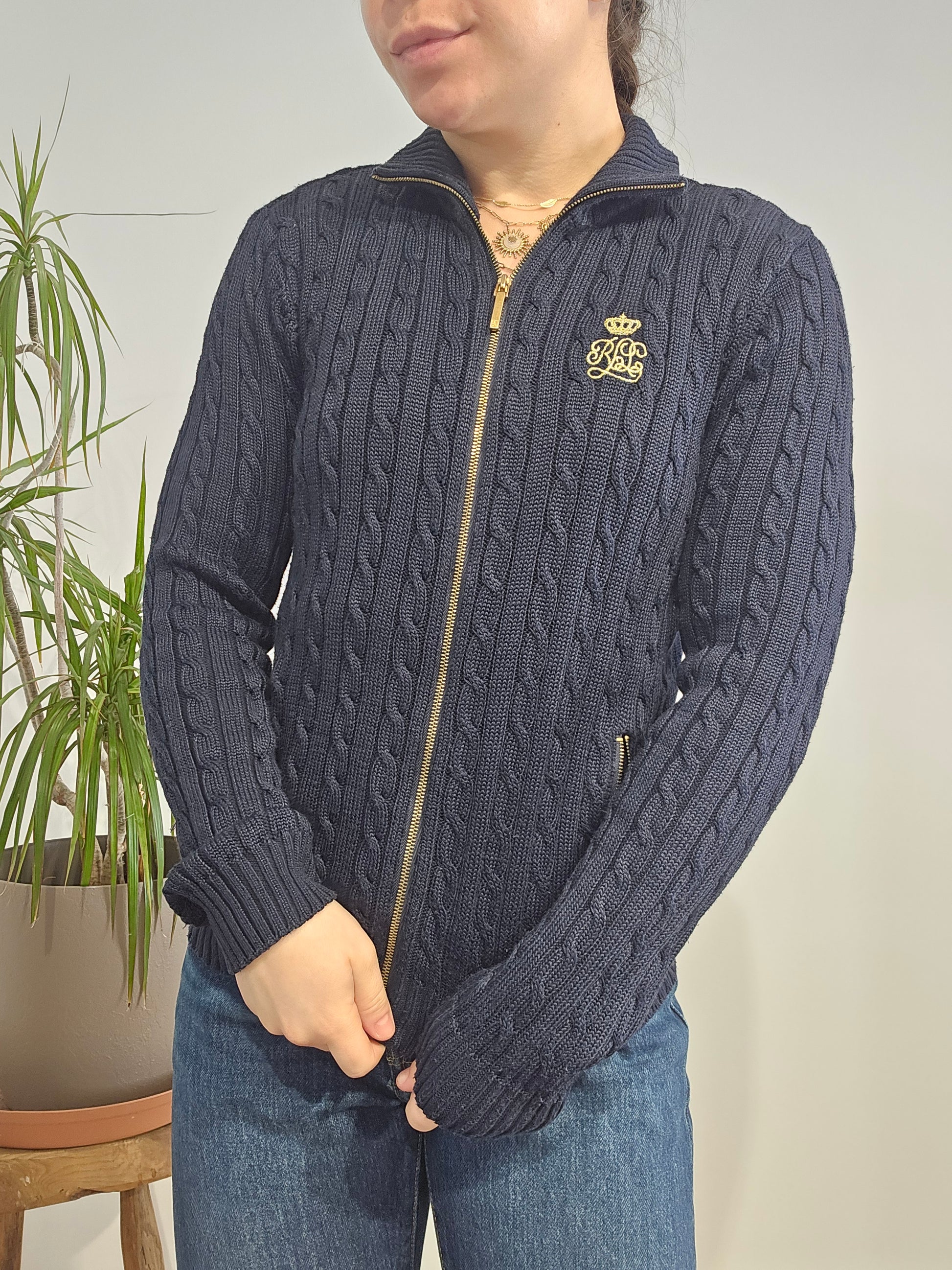 Article : Veste en maille torsadée marine, logo brodé jaune