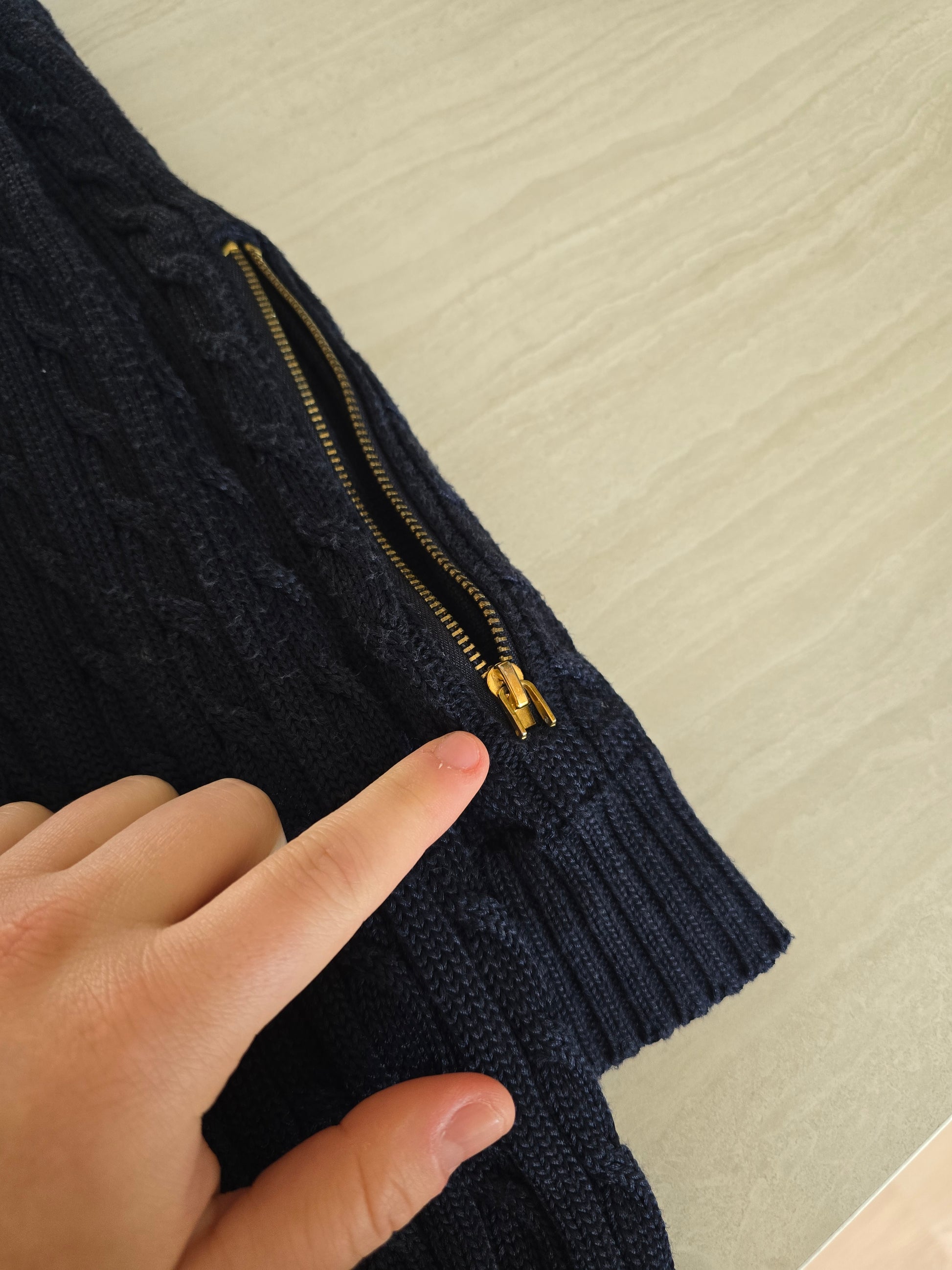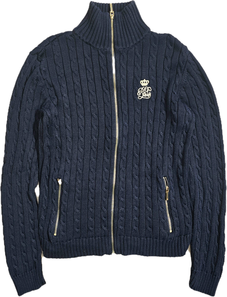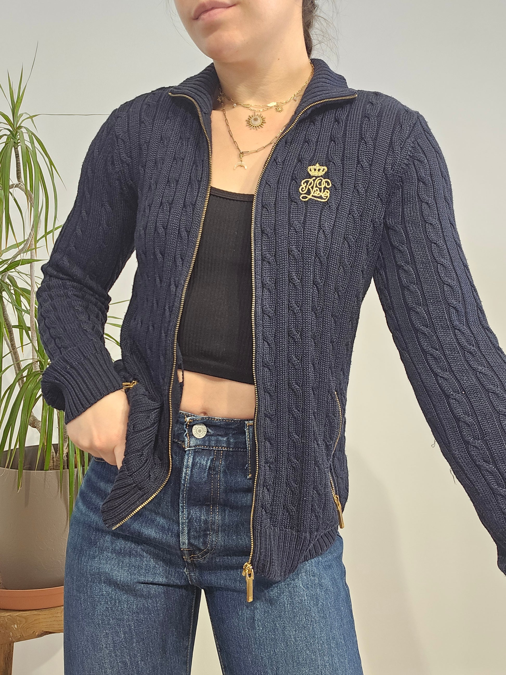 Article : Veste en maille torsadée marine, logo brodé jaune